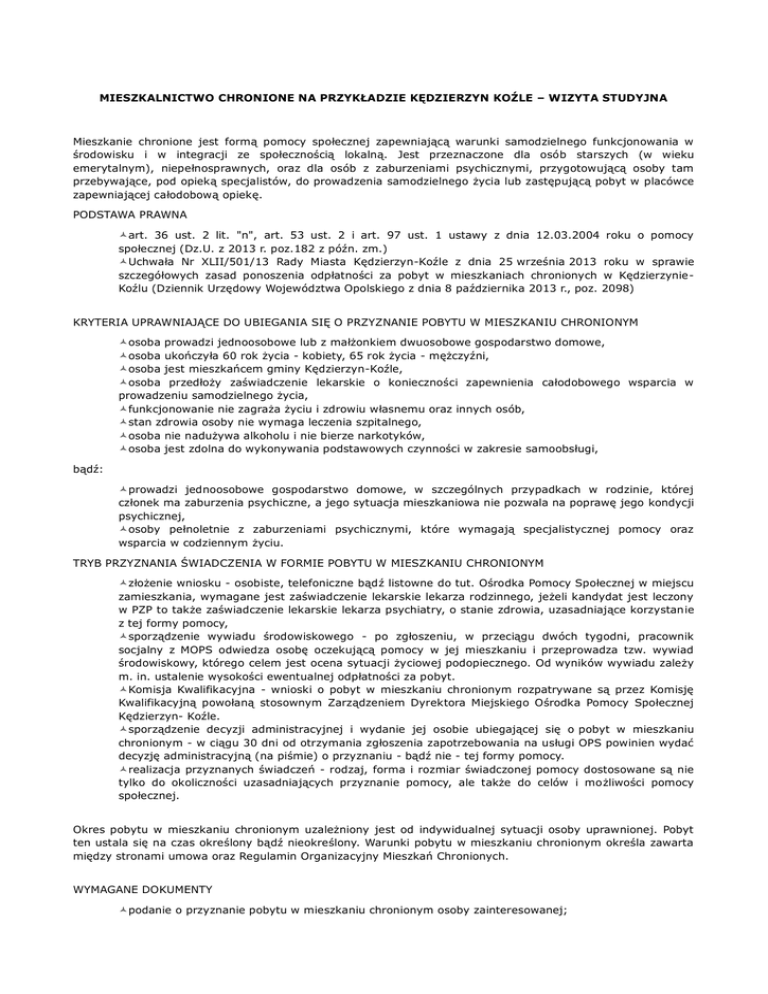 MIESZKALNICTWO CHRONIONE NA PRZYKŁADZIE KĘDZIERZYN KOŹLE – WIZYTA STUDYJNA Mieszkanie chronione jest formą pomocy społecznej zapewniającą warunki samodzielnego funkcjonowania w środowisku i w integracji ze społecznością lokalną. Jest przeznaczone dla osób starszych (w wieku emerytalnym), niepełnosprawnych, oraz dla osób z zaburzeniami psychicznymi, przygotowującą osoby tam przebywające, pod opieką specjalistów, do prowadzenia samodzielnego życia lub zastępującą pobyt w placówce zapewniającej całodobową opiekę. PODSTAWA PRAWNA art. 36 ust. 2 lit. "n", art. 53 ust. 2 i art. 97 ust. 1 ustawy z dnia 12.03.2004 roku o pomocy społecznej (Dz.U. z 2013 r. poz.182 z późn. zm.) Uchwała Nr XLII/501/13 Rady Miasta Kędzierzyn-Koźle z dnia 25 września 2013 roku w sprawie szczegółowych zasad ponoszenia odpłatności za pobyt w mieszkaniach chronionych w KędzierzynieKoźlu (Dziennik Urzędowy Województwa Opolskiego z dnia 8 października 2013 r., poz. 2098) KRYTERIA UPRAWNIAJĄCE DO UBIEGANIA SIĘ O PRZYZNANIE POBYTU W MIESZKANIU CHRONIONYM osoba prowadzi jednoosobowe lub z małżonkiem dwuosobowe gospodarstwo domowe, osoba ukończyła 60 rok życia - kobiety, 65 rok życia - mężczyźni, osoba jest mieszkańcem gminy Kędzierzyn-Koźle, osoba przedłoży zaświadczenie lekarskie o konieczności zapewnienia całodobowego wsparcia w prowadzeniu samodzielnego życia, funkcjonowanie nie zagraża życiu i zdrowiu własnemu oraz innych osób, stan zdrowia osoby nie wymaga leczenia szpitalnego, osoba nie nadużywa alkoholu i nie bierze narkotyków, osoba jest zdolna do wykonywania podstawowych czynności w zakresie samoobsługi, bądź: prowadzi jednoosobowe gospodarstwo domowe, w szczególnych przypadkach w rodzinie, której członek ma zaburzenia psychiczne, a jego sytuacja mieszkaniowa nie pozwala na poprawę jego kondycji psychicznej, osoby pełnoletnie z zaburzeniami psychicznymi, które wymagają specjalistycznej pomocy oraz wsparcia w codziennym życiu. TRYB PRZYZNANIA ŚWIADCZENIA W FORMIE POBYTU W MIESZKANIU CHRONIONYM złożenie wniosku - osobiste, telefoniczne bądź listowne do tut. Ośrodka Pomocy Społecznej w miejscu zamieszkania, wymagane jest zaświadczenie lekarskie lekarza rodzinnego, jeżeli kandydat jest leczony w PZP to także zaświadczenie lekarskie lekarza psychiatry, o stanie zdrowia, uzasadniające korzystanie z tej formy pomocy, sporządzenie wywiadu środowiskowego - po zgłoszeniu, w przeciągu dwóch tygodni, pracownik socjalny z MOPS odwiedza osobę oczekującą pomocy w jej mieszkaniu i przeprowadza tzw. wywiad środowiskowy, którego celem jest ocena sytuacji życiowej podopiecznego. Od wyników wywiadu zależy m. in. ustalenie wysokości ewentualnej odpłatności za pobyt. Komisja Kwalifikacyjna - wnioski o pobyt w mieszkaniu chronionym rozpatrywane są przez Komisję Kwalifikacyjną powołaną stosownym Zarządzeniem Dyrektora Miejskiego Ośrodka Pomocy Społecznej Kędzierzyn- Koźle. sporządzenie decyzji administracyjnej i wydanie jej osobie ubiegającej się o pobyt w mieszkaniu chronionym - w ciągu 30 dni od otrzymania zgłoszenia zapotrzebowania na usługi OPS powinien wydać decyzję administracyjną (na piśmie) o przyznaniu - bądź nie - tej formy pomocy. realizacja przyznanych świadczeń - rodzaj, forma i rozmiar świadczonej pomocy dostosowane są nie tylko do okoliczności uzasadniających przyznanie pomocy, ale także do celów i możliwości pomocy społecznej. Okres pobytu w mieszkaniu chronionym uzależniony jest od indywidualnej sytuacji osoby uprawnionej. Pobyt ten ustala się na czas określony bądź nieokreślony. Warunki pobytu w mieszkaniu chronionym określa zawarta między stronami umowa oraz Regulamin Organizacyjny Mieszkań Chronionych. WYMAGANE DOKUMENTY podanie o przyznanie pobytu w mieszkaniu chronionym osoby zainteresowanej; zaświadczenie lekarskie o stanie zdrowia osoby ubiegającej się o skierowanie do mieszkania chronionego - pobierz zaświadczenie; zaświadczenie lekarza psychiatry - w przypadku osoby chorej psychicznie pobierz zaświadczenie; aktualne orzeczenie o stopniu niepełnosprawności wydane przez Powiatowe Centrum Pomocy Rodzinie lub orzeczenie wydane przez orzecznika Zakładu Ubezpieczeń Społecznych; dowód osobisty lub inny dokument potwierdzający tożsamość - do wglądu; oryginały zaświadczeń o dochodach z miesiąca poprzedzającego złożenie wniosku o pomoc (zaświadczenia o zarobkach netto, decyzje o przyznaniu świadczeń rodzinnych, decyzja o przyznanym dodatku mieszkaniowym, decyzje o przyznanych świadczeniach emerytalno-rentowych); inne dokumenty świadczące o uzyskanych dochodach; numer NIP; numery PESEL; inne dokumenty świadczące o trudnej sytuacji socjalno-bytowej i zdrowotnej; oświadczenie o stanie majątkowym. ZASADY ODPŁATNOŚCI ZA POBYT W MIESZKANIU CHRONIONYM Pobyt w mieszkaniu chronionym jest odpłatny zgodnie z uchwałą Nr XLII/501/13 Rady Miasta Kędzierzyn-Koźle z dnia 25 września 2013 r. w sprawie szczegółowych zasad ponoszenia odpłatności za pobyt w mieszkaniach chronionych w Kędzierzynie - Koźlu. Osoby korzystające z pobytu w mieszkaniu chronionym zgodnie z w/w Uchwałą ponoszą odpłatność w zależności od dochodu. Dochód stanowi: świadczenie rentowe ( renta rodzinna, inwalidzka, socjalna, wypadkowa, kwartalna, zagraniczna) świadczenie emerytura świadczenie przedemerytalne zasiłek stały zasiłek okresowy zasiłek pielęgnacyjny dodatek pielęgnacyjny dodatek mieszkaniowy Podstawą wysokości odpłatności za pobyt Odpłatność naliczana jest wg następującego wzoru: w mieszkaniu chronionym jest dochód klienta. DOCHÓD netto x 100 : KRYTERIUM= KWOTA DOCHODU W RELACJI DO KRYTERIUM DOCHODOWEGO W % Przelicz wysokość odpłatności KALKULATOR W OPRACOWANIU za pobyt w mieszkaniu chronionym za pomocą kalkulatora: Ustawowe kryterium: osoby samotne: 542 zł osoby w rodzinie: jedna osoba - 456 zł dwie osoby - 912 zł trzy osoby