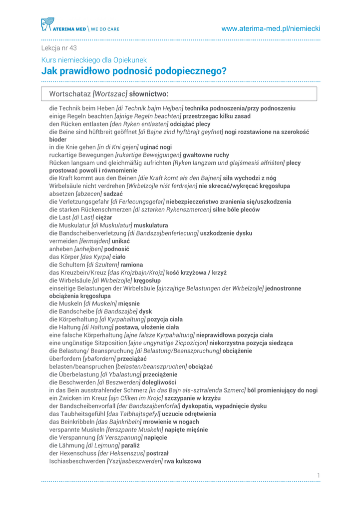 www.aterima-med.pl/niemiecki Lekcja nr 43 Kurs niemieckiego dla Opiekunek Jak prawidłowo podnosić podopiecznego? Wortschataz [Wortszac] słownictwo: die Technik beim Heben [di Technik bajm Hejben] technika podnoszenia/przy podnoszeniu einige Regeln beachten [ajnige Regeln beachten] przestrzegac kilku zasad den Rücken entlasten [den Ryken entlasten] odciążać plecy die Beine sind hüftbreit geöffnet [di Bajne zind hyftbrajt geyfnet] nogi rozstawione na szerokość bioder in die Knie gehen [in di Kni gejen] uginać nogi ruckartige Bewegungen [rukartige Bewejgungen] gwałtowne ruchy Rücken langsam und gleichmäßig aufrichten [Ryken langzam und glajśmesiś ałfriśten] plecy prostować powoli i równomienie die Kraft kommt aus den Beinen [die Kraft komt ałs den Bajnen] siła wychodzi z nóg Wirbelsäule nicht verdrehen [Wirbelzojle niśt ferdrejen] nie skrecać/wykręcać kręgosłupa absetzen [abzecen] sadzać die Verletzungsgefahr [di Ferlecungsgefar] niebezpieczeństwo zranienia się/uszkodzenia die starken Rückenschmerzen [di sztarken Rykenszmercen] silne bóle pleców die Last [di Last] ciężar die Muskulatur [di Muskulatur] muskulatura die Bandscheibenverletzung [di Bandszajbenferlecung] uszkodzenie dysku vermeiden [fermajden] unikać anheben [anhejben] podnosić das Körper [das Kyrpa] ciało die Schultern [di Szultern] ramiona das Kreuzbein/Kreuz [das Krojzbajn/Krojz] kość krzyżowa / krzyż die Wirbelsäule [di Wirbelzojle] kręgosłup einseitige Belastungen der Wirbelsäule [ajnzajtige Belastungen der Wirbelzojle] jednostronne obciążenia kręgosłupa die Muskeln [di Muskeln] mięsnie die Bandscheibe [di Bandszajbe] dysk die Körperhaltung [di Kyrpahaltung] pozycja ciała die Haltung [di Haltung] postawa, ułożenie ciała eine falsche Körperhaltung [ajne falsze Kyrpahaltung] nieprawidłowa pozycja ciała eine ungünstige Sitzposition [ajne ungynstige Zicpozicjon] niekorzystna pozycja siedząca die Belastung/ Beanspruchung [di Belastung/Beanszpruchung] obciążenie überfordern [ybafordern] przeciążać belasten/beanspruchen [belasten/beanszpruchen] obciążać die Überbelastung [di Ybalastung] przeciążenie die Beschwerden [di Beszwerden] dolegliwości in das Bein ausstrahlender Schmerz [in das Bajn ałs-sztralenda Szmerc] ból promieniujący do nogi ein Zwicken im Kreuz [ajn Cfiken im Krojc] szczypanie w krzyżu der Bandscheibenvorfall [der Bandszajbenforfal] dyskopatia, wypadnięcie dysku das Taubheitsgefühl [das Tałbhajtsgefyl] uczucie odrętwienia das Beinkribbeln [das Bajnkribeln] mrowienie w nogach verspannte Muskeln [ferszpante Muskeln] napięte mięśnie die Verspannung [di Verszpanung] napięcie die Lähmung [di Lejmung] paraliż der Hexenschuss [der Heksenszus] postrzał Ischiasbeschwerden [Yszijasbeszwerden] rwa kulszowa 1 www.aterima-med.pl/niemiecki zur Folge haben [cuła Folge haben] mieć skutek die Untersuchung [di Untazuchung] badanie die Ursache der Rückenschmerzen [di Ur-zache der Rykenszmercen] przyczyna bólu pleców die Bewegung [di Bewejgung] ruch die Entlastung [di Entlastung] odciążenie Sport treiben [Szport trajben] uprawiać sport die Kräftigung/die Stärkung [di Kreftigung/di Szterkung] wzmocnienie vorbeugen [forbojgen] zapobiegać üben [yben] ćwiczyć körperliche Aktivität [kyrperlisie Aktivitet] aktywność fizyczna die Kräftigungsübungen [di Kreftigungsybungen] ćwiczenia wzmacniające die Lockerungsübungen [di Lokerungsybungen] ćwiczenia rozluźniające die Dehnübungen [di Dejnybungen] ćwiczenia rozciągające Ausdrücke [Ałsdryke] wyrażenia: Ade [ade] żegnaj der Aqua-Aerobic-Kurs [der Akła-Aerobik-Kurs] kurs aqua areobicku ein paar Tipps [ajn paa Tips] kilka rad es ist halb so schlimm [es yst halb zo szlim] pół biedy A und O [A und O] istota rzeczy Materiał stanowi własność firmy ATERIMA Sp. z o.o. Sp. K. ul. Puszkarska 7f, 30-644 Kraków. Reprodukcja, rozpowszechnianie lub inne wykorzystywanie całości lub części materiału w jakiejkolwiek formie dla celów innych, niż cele niekomercyjne i osobiste jest zakazane. 2 Powered by TCPDF (www.tcpdf.org)