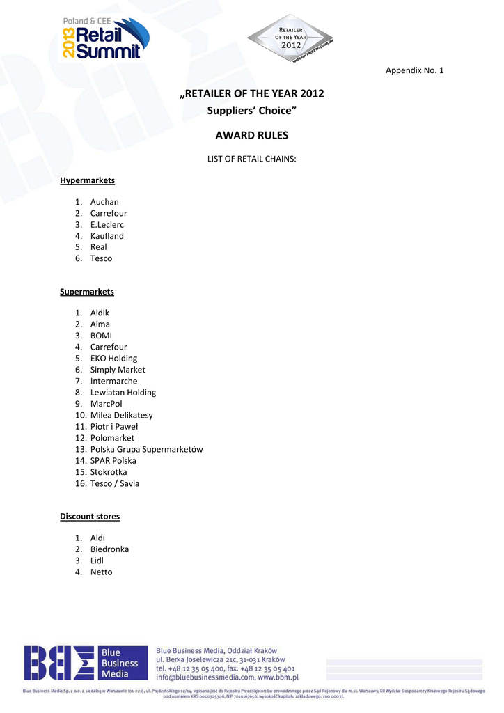 Appendix No. 1 „RETAILER OF THE YEAR 2012 Suppliers’ Choice” AWARD RULES LIST OF RETAIL CHAINS: Hypermarkets 1. 2. 3. 4. 5. 6. Auchan Carrefour E.Leclerc Kaufland Real Tesco Supermarkets 1. 2. 3. 4. 5. 6. 7. 8. 9. 10. 11. 12. 13. 14. 15. 16. Aldik Alma BOMI Carrefour EKO Holding Simply Market Intermarche Lewiatan Holding MarcPol Milea Delikatesy Piotr i Paweł Polomarket Polska Grupa Supermarketów SPAR Polska Stokrotka Tesco / Savia Discount stores 1. 2. 3. 4. Aldi Biedronka Lidl Netto Convenience and regional retail chains 1. 2. 3. 4. 5. 6. 7. 8. 9. 10. 11. 12. ABC Chata Polska Delikatesy Centrum Eden LD Holding Euro Sklep Groszek PSS Społem Sieć Handlowa Rabat Sklep Polski Żabka / Freshmarket Polska Sieć Handlowa NASZ SKLEP Wholesalers & Distributors 1. 2. 3. 4. 5. 6. 7. 8. Bać-Pol Eurocash Grupa MPT Lekkerland Makro Cash&Carry Selgros Specjał Tradis Chemist’s 1. 2. 3. 4. 5. 6. 7. 8. 9. Douglas Drogeria Natura / Drogerie Aster Habe Marionnaud Polska Grupa Drogeryjna Rossmann Schlecker / Dayli my shop Sephora Superpharm