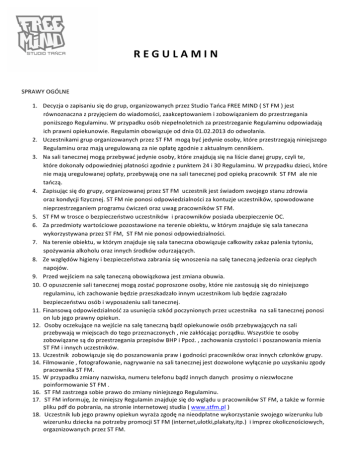 R E G U L A M I N SPRAWY OGÓLNE 1. Decyzja o zapisaniu się do grup, organizowanych przez Studio Tańca FREE MIND ( ST FM ) jest równoznaczna z przyjęciem do wiadomości, zaakceptowaniem i zobowiązaniem do przestrzegania poniższego Regulaminu. W przypadku osób niepełnoletnich za przestrzeganie Regulaminu odpowiadają ich prawni opiekunowie. Regulamin obowiązuje od dnia 01.02.2013 do odwołania. 2. Uczestnikami grup organizowanych przez ST FM mogą być jedynie osoby, które przestrzegają niniejszego Regulaminu oraz mają uregulowaną za nie opłatę zgodnie z aktualnym cennikiem. 3. Na sali tanecznej mogą przebywać jedynie osoby, które znajdują się na liście danej grupy, czyli te, które dokonały odpowiedniej płatności zgodnie z punktem 24 i 30 Regulaminu. W przypadku dzieci, które nie mają uregulowanej opłaty, przebywają one na sali tanecznej pod opieką pracownik ST FM ale nie tańczą. 4. Zapisując się do grupy, organizowanej przez ST FM uczestnik jest świadom swojego stanu zdrowia oraz kondycji fizycznej. ST FM nie ponosi odpowiedzialności za kontuzje uczestników, spowodowane nieprzestrzeganiem programu ćwiczeń oraz uwag pracowników ST FM. 5. ST FM w trosce o bezpieczeństwo uczestników i pracowników posiada ubezpieczenie OC. 6. Za przedmioty wartościowe pozostawione na terenie obiektu, w którym znajduje się sala taneczna wykorzystywana przez ST FM, ST FM nie ponosi odpowiedzialności. 7. Na terenie obiektu, w którym znajduje się sala taneczna obowiązuje całkowity zakaz palenia tytoniu, spożywania alkoholu oraz innych środków odurzających. 8. Ze względów higieny i bezpieczeństwa zabrania się wnoszenia na salę taneczną jedzenia oraz ciepłych napojów. 9. Przed wejściem na salę taneczną obowiązkowa jest zmiana obuwia. 10. O opuszczenie sali tanecznej mogą zostać poproszone osoby, które nie zastosują się do niniejszego regulaminu, ich zachowanie będzie przeszkadzało innym uczestnikom lub będzie zagrażało bezpieczeństwu osób i wyposażeniu sali tanecznej. 11. Finansową odpowiedzialność za usunięcia szkód poczynionych przez uczestnika na sali tanecznej ponosi on lub jego prawny opiekun. 12. Osoby oczekujące na wejście na salę taneczną bądź opiekunowie osób przebywających na sali przebywają w miejscach do tego przeznaczonych , nie zakłócając porządku. Wszystkie te osoby zobowiązane są do przestrzegania przepisów BHP i Ppoż. , zachowania czystości i poszanowania mienia ST FM i innych uczestników. 13. Uczestnik zobowiązuje się do poszanowania praw i godności pracowników oraz innych członków grupy. 14. Filmowanie , fotografowanie, nagrywanie na sali tanecznej jest dozwolone wyłącznie po uzyskaniu zgody pracownika ST FM. 15. W przypadku zmiany nazwiska, numeru telefonu bądź innych danych prosimy o niezwłoczne poinformowanie ST FM . 16. ST FM zastrzega sobie prawo do zmiany niniejszego Regulaminu. 17. ST FM informuję, że niniejszy Regulamin znajduje się do wglądu u pracowników ST FM, a także w formie pliku pdf do pobrania, na stronie internetowej studia ( www.stfm.pl ) 18. Uczestnik lub jego prawny opiekun wyraża zgodę na nieodpłatne wykorzystanie swojego wizerunku lub wizerunku dziecka na potrzeby promocji ST FM (internet,ulotki,plakaty,itp.) i imprez okolicznościowych, orgaznizowanych przez ST FM. SPRAWY ORGANIZACYJNE 19. ST FM organizuje nabór do grup na początku m-‐c września oraz w połowie roku szkolnego –pierwszy tydzień po feriach zimowych. Ilość miejsc w grupach jest ograniczona. W przypadku zapełnienia się miejsc w danej grupie lista uczestników zostaje zamknięta. W trakcie roku szkolnego można ubiegać się o dołączenie do grupy po wcześniejszym bezpośrednim kontakcie z pracownikiem ST FM w danej placówce. 20. W przypadku małej ilości Uczestników w danej grupie ST FM ma prawo rozwiązać grupę. W takim przypadku ST FM proponuje przeniesienie do innej grupy lub zwraca wpłacone przez Uczestnika pieniądze za niewykorzystane wejścia na salę taneczną. 21. W przypadku choroby lub niedyspozycji pracownika ST FM , prowadzącego daną grupę ST FM ma prawo wyznaczyć innego pracownika w zastępstwie lub ma prawo do odwołania zajęć i zostaną one zrealizowane w innym terminie ustalonym z Uczestnikami. 22. W sytuacjach losowych ST FM ma prawo do odwołania zajęć. Zostaną one zrealizowane w innym terminie ustalonym z Uczestnikami. 23. W przypadku minimum dwutygodniowej choroby bądź wyjazdu Uczestnika istnieje możliwość przesunięcia wpłaconych pieniędzy za niewykorzystane wejścia na salę taneczną na kolejny okres rozliczeniowy przy czym Uczestnik lub prawny opiekun Uczestnika musi niezwłocznie poinformować mailowo lub telefonicznie ST FM o chorobie. W innych przypadkach, nawet losowych przesunięcie opłaty na okres późniejszy nie jest możliwe. PŁATNOŚCI 24. Opłata za wstęp na salę taneczną powinna być uregulowana do 10-‐tego dnia każdego miesiąca. 25. Płatność za wstęp na salę taneczną wnoszona jest w systemie pakietowym. 26. Uczestnik ma możliwość wyboru jednego spośród trzech dostępnych pakietów : pakiet 8 kolejnych wejść na salę taneczną, pakiet 4 kolejnych wejść oraz pakiet pojedynczy – pojedyncze wejście na salę taneczną. 27. W trakcie obowiązywania wykupionego pakietu nie ma możliwości jego zmiany, modyfikacji lub wykorzystania go przez osobę trzecią. 28. Cennik pakietów dostępny jest u pracowników ST FM. 29. ST FM zastrzega sobie prawo do zmiany cennika. 30. Opłat można dokonać tylko i wyłącznie w formie przelewu: DANE DO PRZELEWU: Studio Tańca FREE MIND , Ul. Chrościckiego 83, 02-‐414 Warszawa BANK ZACHODNI WBK , nr konta: BZ WBK 26 1090 1580 0000 0001 1545 0730 TYTUŁ PRZELEWU : WSTĘP NA SALĘ TANECZNĄ, imię nazwisko uczestnika, nazwa szkoły/domu kultury, m-‐c za jaki dokonują Państwo wpłaty ( np. WSTĘP NA SALĘ TANECZNĄ, Jan Kowalski, Sp 1 Warszawa , styczeń 2013 