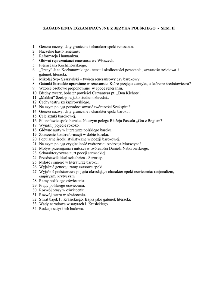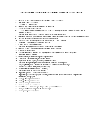 ZAGADNIENIA EGZAMINACYJNE Z JĘZYKA POLSKIEGO - SEM. II 1. 2. 3. 4. 5. 6. 7. 8. 9. 10. 11. 12. 13. 14. 15. 16. 17. 18. 19. 20. 21. 22. 23. 24. 25. 26. 27. 28. 29. 30. 31. 32. 33. 34. Geneza nazwy, daty graniczne i charakter epoki renesansu. Naczelne hasło renesansu. Reformacja i humanizm. Główni reprezentanci renesansu we Włoszech. Pieśni Jana Kochanowskiego. „Treny” Jana Kochanowskiego- temat i okoliczności powstania, zawartość treściowa i gatunek literacki. Mikołaj Sęp- Szarzyński – twórca renesansowy czy barokowy. Gatunki literackie uprawiane w renesansie. Które przejęto z antyku, a które ze średniowiecza? Wzorce osobowe proponowane w epoce renesansu. Błędny rycerz, bohater powieści Cervantesa pt. „Don Kichote”. „Makbet” Szekspira jako studium zbrodni.. Cechy teatru szekspirowskiego. Na czym polega ponadczasowość twórczości Szekspira? Geneza nazwy, daty graniczne i charakter epoki baroku. Cele sztuki barokowej. Filozofowie epoki baroku. Na czym polega Błażeja Pascala „Gra z Bogiem? Wyjaśnij pojęcie rokoko. Główne nurty w literaturze polskiego baroku. Znaczenie kontrreformacji w dobie baroku. Popularne środki stylistyczne w poezji barokowej. Na czym polega oryginalność twórczości Andrzeja Morsztyna? Motyw przemijania i miłości w twórczości Daniela Naborowskiego. Scharakteryzować nurt poezji sarmackiej. Przedstawić ideał szlachcica - Sarmaty. Miłość i śmierć w literaturze baroku. Wyjaśnić genezę i ramy czasowe epoki. Wyjaśnić podstawowe pojęcia określające charakter epoki oświecenia: racjonalizm, empiryzm, krytycyzm. Ramy polskiego oświecenia. Prądy polskiego oświecenia. Rozwój prasy w oświeceniu. Rozwój teatru w oświeceniu. Świat bajek I . Krasickiego. Bajka jako gatunek literacki. Wady narodowe w satyrach I. Krasickiego. Rodzaje satyr i ich budowa.