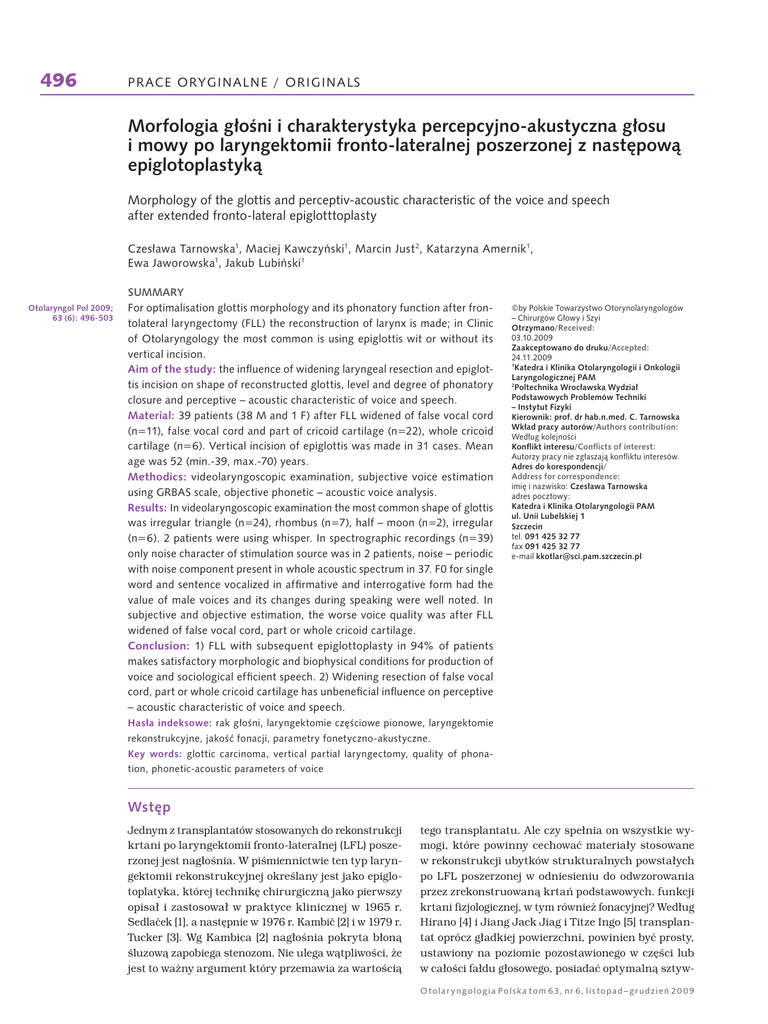 496 PRACE ORYGINALNE / ORIGINALS Morfologia głośni i charakterystyka percepcyjno-akustyczna głosu i mowy po laryngektomii fronto-lateralnej poszerzonej z następową epiglotoplastyką Morphology of the glottis and perceptiv-acoustic characteristic of the voice and speech after extended fronto-lateral epiglotttoplasty Czesława Tarnowska1, Maciej Kawczyński1, Marcin Just 2, Katarzyna Amernik1, Ewa Jaworowska1, Jakub Lubiński1 Otolaryngol Pol 2009; 63 (6): 496-503 SUMMARY For optimalisation glottis morphology and its phonatory function after frontolateral laryngectomy (FLL) the reconstruction of larynx is made; in Clinic of Otolaryngology the most common is using epiglottis wit or without its vertical incision. Aim of the study: the influence of widening laryngeal resection and epiglottis incision on shape of reconstructed glottis, level and degree of phonatory closure and perceptive – acoustic characteristic of voice and speech. Material: 39 patients (38 M and 1 F) after FLL widened of false vocal cord (n=11), false vocal cord and part of cricoid cartilage (n=22), whole cricoid cartilage (n=6). Vertical incision of epiglottis was made in 31 cases. Mean age was 52 (min.-39, max.-70) years. Methodics: videolaryngoscopic examination, subjective voice estimation using GRBAS scale, objective phonetic – acoustic voice analysis. Results: In videolaryngoscopic examination the most common shape of glottis was irregular triangle (n=24), rhombus (n=7), half – moon (n=2), irregular (n=6). 2 patients were using whisper. In spectrographic recordings (n=39) only noise character of stimulation source was in 2 patients, noise – periodic with noise component present in whole acoustic spectrum in 37. F0 for single word and sentence vocalized in affirmative and interrogative form had the value of male voices and its changes during speaking were well noted. In subjective and objective estimation, the worse voice quality was after FLL widened of false vocal cord, part or whole cricoid cartilage. Conclusion: 1) FLL with subsequent epiglottoplasty in 94% of patients makes satisfactory morphologic and biophysical conditions for production of voice and sociological efficient speech. 2) Widening resection of false vocal cord, part or whole cricoid cartilage has unbenefi cial influence on perceptive – acoustic characteristic of voice and speech. ©by Polskie Towarzystwo Otorynolaryngologów – Chirurgów Głowy i Szyi Otrzymano/Received: 03.10.2009 Zaakceptowano do druku/Accepted: 24.11.2009 1 Katedra i Klinika Otolaryngologii i Onkologii Laryngologicznej PAM 2 Poltechnika Wrocławska Wydział Podstawowych Problemów Techniki – Instytut Fizyki Kierownik: prof. dr hab.n.med. C. Tarnowska Wkład pracy autorów/Authors contribution: Według kolejności Konflikt interesu/Conflicts of interest: Autorzy pracy nie zgłaszają konfliktu interesów. Adres do korespondencji/ Address for correspondence: imię i nazwisko: Czesława Tarnowska adres pocztowy: Katedra i Klinika Otolaryngologii PAM ul. Unii Lubelskiej 1 Szczecin tel. 091 425 32 77 fax 091 425 32 77 e-mail [email protected] Hasła indeksowe: rak głośni, laryngektomie częściowe pionowe, laryngektomie rekonstrukcyjne, jakość fonacji, parametry fonetyczno-akustyczne. Key words: glottic carcinoma, vertical partial laryngectomy, quality of phonation, phonetic-acoustic parameters of voice Wstęp Jednym z transplantatów stosowanych do rekonstrukcji krtani po laryngektomii fronto-lateralnej (LFL) poszerzonej jest nagłośnia. W piśmiennictwie ten typ laryngektomii rekonstrukcyjnej określany jest jako epiglotoplatyka, której technikę chirurgiczną jako pierwszy opisał i zastosował w praktyce klinicznej w 1965 r. Sedlaček [1], a następnie w 1976 r. Kambič [2] i w 1979 r. Tucker [3]. Wg Kambica [2] nagłośnia pokryta błoną śluzową zapobiega stenozom. Nie ulega wątpliwości, że jest to ważny argument który przemawia za wartością tego transplantatu. Ale czy spełnia on wszystkie wymogi, które powinny cechować materiały stosowane w rekonstrukcji ubytków strukturalnych powstałych po LFL poszerzonej w odniesieniu do odwzorowania przez zrekonstruowaną krtań podstawowych. funkcji krtani fizjologicznej, w tym również fonacyjnej? Według Hirano [4] i Jiang Jack Jiag i Titze Ingo [5] transplantat oprócz gładkiej powierzchni, powinien być prosty, ustawiony na poziomie pozostawionego w części lub w całości fałdu głosowego, posiadać optymalną sztywO tolar yngologia Polska tom 63, nr 6 , lis topad – gr udzień 20 0 9 PRACE ORYGINALNE / ORIGINALS ność, której drgania nie interferują z drganiami zdrowego fałdu głosowego lub rzekomego oraz zapewniać odpowiednią szerokość głośni podczas oddychania. Dlatego też w 1985 roku Olson i wsp. [6] oraz w 1991 i 1997 r. Nong i wsp. [7, 8] przed uzupełnieniem ubytków strukturalnych po LFL poszerzonej stosowali pionowe nacięcie nagłośni i po sprowadzeniu jej w dół zespalali z tkankami miękkimi krtani. W Polsce technikę tę do praktyki klinicznej w 1990 r. wprowadził i zmodyfikował Ziętek [9]. Modyfikacja ta polegała na tym, że po pionowym nacięciu nagłośni z zachowaniem ciągłości ochrzęstnej wewnętrznej i sprowadzeniu jej w dół, cytowany wyżej autor zespalał ją bez napięcia z więzadłem pierścienno-tarczowym lub łukiem chrząstki pierścieniowatej od dołu i brzegiem chrząstki tarczowatej z boku. W założeniu więc takie postępowanie stwarza warunki do uzyskiwania kształtu zrekonstruowanej głośni zbliżonego do trójkąta i zwarcia fonacyjnego w linii środkowej struktur generujących dźwięk podstawowy oraz zbliżonej do warunków fizjologicznych powierzchni szpary głośni. W uzupełnieniu należy dodać, że w Polsce klasyczną epiglotoplastykę tj. bez pionowego nacięcia nagłośni stosują tylko dwa ośrodki [10, 11]. W pracy przedstawiamy doświadczenia Kliniki szczecińskiej w odniesieniu do morfologii i funkcji fonacyjnej zrekonstr