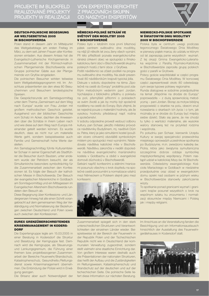 DEUTSCH-POLNISCHE BEGEGNUNG AM WELTGEBETSTAG 2005 IN BISCHOFSWERDA Polen stand in diesem Jahr im Mittelpunkt des Weltgebetstags am ersten Freitag im März, zu dem seit Jahren Frauen aller Konfessionen einladen. Aus diesem Anlass hat die Evangelisch-Lutherische Kirchgemeinde in Zusammenarbeit mit der Römisch-katholischen Pfarrgemeinde Bischofswerda eine Gruppe polnischer Gäste aus der Pfarrgemeinde von Gryfów eingeladen. Die polnischen Besucher wirkten teilweise beim Weltgebetstagsprogramm mit. Im Anschluss präsentierten sie den etwa 80 Besucherinnen und Besuchern landestypische Speisen. Die Gesprächsrunde am Samstagvormittag unter dem Thema „Gemeinsam auf dem Weg nach Europa“ wurde von Frau Jordan mit großem methodischen Geschick geleitet. Ausgehend von der biblischen Geschichte vom Schatz im Acker, dachten die Anwesenden über die Schätze in ihrem Leben nach und wie diese auf dem Weg nach Europa miteinander geteilt werden können. Es wurde deutlich, dass es nicht nur um materielle Werte geht, sondern beispielsweise auch Familie und Gemeinschaft hohe Werte darstellen. Am Samstagnachmittag führte Kulturamtsleiter Schaar in seiner Eigenschaft als Stadtführer die Besucher durch Bautzen, unter anderem wurde der Petridom besucht, der als Simultankirche besonders symbolträchtig für die Zusammenarbeit zwischen den Konfessionen ist. Es folgte der Besuch der katholischen Messe in Bischofswerda. Der Besuch der evangelischen Marienkirche in Goldbach am Sonntagvormittag und ein Mittagessen im Evangelischen Altersheim Bischofswerda rundeten den Besuch ab. Diese Begegnung über Konfessions- und Ländergrenzen hinweg hat alle einen Schritt vorangebracht auf dem gemeinsamen Weg der Verständigung und Normalisierung der Beziehungen zwischen Deutschland und Polen sowie auch zwischen den Konfessionen. NĚMECKO-POLSKÉ SETKÁNÍ VE SVĚTOVÝ DEN MODLITBY 2005 V BISCHOFSWERDĚ Polsko bylo v letošním roce první březnový pátek centrem světového dne modlitby, na nějž již několik let zvou ženy všech vyznání. Při této příležitosti pozvala evangelicko-lutheránská církevní obec ve spolupráci s římskokatolickou farní obcí v Bischofs-werdě skupinu polských hostů z farní obce z Gryfówa. Polští návštěvníci se zčásti podíleli na programu světového dne modlitby. Na závěr prezentovali 80 návštěvníkům krajově typická jídla. Diskuze v sobotu dopoledne na téma „Společně na cestě do Evropy“ proběhla pod zdařilým metodickým vedením paní Jordan. Vycházejíce z biblického příběhu o pokladu na poli, přemýšleli přítomní o pokladech ve svém životě a jak by mohly být společně rozděleny na cestě do Evropy. Bylo zřejmé, že se nejedná pouze o materiální hodnoty, ale že vysokou hodnotu představují např. rodina a společenství. V sobotu odpoledne provedl vedoucí odboru kultury, pan Schaar, jakožto městský průvodce návštěvníky Budyšínem, mj. navštívili Dům sv. Petra, který je jako simultánní kostel (používán vícero církvemi) obzvláště symbolickým místem pro spolupráci mezi vyznáními. Následovala návštěva katolické mše v Bischofswerdě. Návštěvu zakončila v neděli dopoledne návštěva evangelického mariánského kostela v Goldbachu a oběd v evangelické domově důchodců v Bischofswerdě. Setkání napříč konfesními a státními hranicemi posunulo všechny o krok dopředu na společné cestě porozumění a normalizace vztahů mezi Německem a Polskem stejně jako mezi konfesemi. NIEMIECKO-POLSKIE SPOTKANIE W ŚWIATOWYM DNIU MODLITWY 2005 W BISCHOFSWERDZIE Polska była w centrum uwagi podczas tegorocznego Światowego Dnia Modlitwy w pierwszy piątek marca, do udziału w którym od lat zapraszają panie wszystkich wyznań. Z tej okazji Gmina Ewangelicko-Luterańska wspólnie z Parafią Rzymsko-Katolicką w Bischofswerdzie zaprosiła grupę polskich gości z parafii w Gryfowie. Polscy goście współdziałali w części programu Światowego Dnia Modlitwy. W koncowej części zaprezentowali około 80 odwiedzającym swoje typowe potrawy regionalne. Runda dialogowa w sobotnie przedpołudnie na temat „Wspólnie na drodze do Europy“ poprowadziła – z dużą sprawnością metodyczną – pani Jordan. Biorąc za motyw biblijną przypowieść o skarbie na polu, obecni snuli rozważania o skarbach ich życia i o tym, jak możnaby je w drodze do Europy być między siebie dzielić. Stało się jasne, że nie chodzi tu tylko o wartości materialne, ale wysokie walory stanowią też na przykład rodzina i wspólnota. Po południu pan Schaar, kierownik Urzędu Kultury w swojej specjalności przewodnika miejskiego oprowadził uczestnikow spotkania po Budziszynie, m.in. zwiedzono katedrę św. Piotra, która jako świątynia symultaniczna szczególnie dobrze oddaje symbolikę międzykonfersyjnej współpracy. Potem nastąpił udział w katolickiej Mszy św. W Bischofswerdzie. Odwiedziny ewangielickiego Kościoła Mariackiego w Goldbach w niedzielne przedpołudnie oraz obiad w ewangelickim domu opieki nad osobami w późnym wieku w Bischofswerdzie stanowiły zakończenie wizyty. To spotkanie ponad granicami wyznań i granicami krajów posuneł wszystkich o krok na wspólnym szlaku ku zrozumieniu i normalizacji stosunków między Niemcami i Polską jak i między religiami. EUREX GRENZÜBERSCHREITENDES KRISENMANAGEMENT IN KODERSDORF Die Expertengruppe legte am 15.03.2005 in einer Beratung in Kodersdorf die Struktur und Besetzung der Kerngruppe fest. Demnach wird die Kerngruppe, als Steuerungsund Lenkungsgremium, die Führung einer themen- bzw. projektbezogenen Zusammenarbeit der Bereiche Feuerwehr/Brandschutz, Katastrophenschutz, Gesundheits-/Rettungsdienst sowie Krisenmanagement übernehmen. Die Einbindung der Polizei wird in Erwägung gezogen. Die Brisanz aber auch Notwendigkeit der Zusammenarbeit spiegelt sich in den stark unterschiedlichen Strukturen und Verantwortlichkeiten der einzelnen