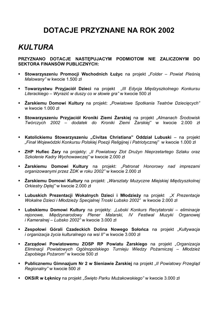 DOTACJE PRZYZNANE NA ROK 2002 KULTURA PRZYZNANO DOTACJE NASTĘPUJACYM SEKTORA FINANSÓW PUBLICZNYCH: PODMIOTOM NIE ZALICZONYM DO ! Stowarzyszeniu Promocji Wschodnich Łużyc na projekt „Folder – Powiat Pieśnią Malowany” w kwocie 1.500 zł ! Towarzystwu Przyjaciół Dzieci na projekt „III Edycja Międzyszkolnego Konkursu Literackiego – Wyrazić w duszy co w słowie gra” w kwocie 500 zł ! Żarskiemu Domowi Kultury na projekt: „Powiatowe Spotkania Teatrów Dziecięcych” w kwocie 1.000 zł ! Stowarzyszeniu Przyjaciół Kroniki Ziemi Żarskiej na projekt „Almanach Środowisk Twórczych 2002 – dodatek do Kroniki Ziemi Żarskiej” w kwocie 2.000 zł ! Katolickiemu Stowarzyszeniu „Civitas Christiana” Oddział Lubuski – na projekt „Finał Wojewódzki Konkursu Polskiej Poezji Religijnej i Patriotycznej” w kwocie 1.000 zł ! ZHP Hufiec Żary na projekty: „II Powiatowy Zlot Drużyn Nieprzetartego Szlaku oraz Szkolenie Kadry Wychowawczej” w kwocie 2.000 zł ! Żarskiemu Domowi Kultury na projekt: „Patronat Honorowy organizowanymi przez ŻDK w roku 2002” w kwocie 2.000 zł ! Żarskiemu Domowi Kultury na projekt: „Warsztaty Muzyczne Miejskiej Międzyszkolnej Orkiestry Dętej” w kwocie 2.000 zł ! Lubuskich Prezentacji Wokalnych Dzieci i Młodzieży na projekt „X Prezentacje Wokalne Dzieci i Młodzieży Specjalnej Troski Lubsko 2002” w kwocie 2.000 zł ! Lubskiemu Domowi Kultury na projekty: „Lubski Konkurs Recytatorski – eliminacje rejonowe, Międzynarodowy Plener Malarski, IV Festiwal Muzyki Organowej i Kameralnej – Lubsko 2002” w kwocie 3.000 zł ! Zespołowi Górali Czadeckich Dolina Nowego Sołońca na projekt „Kultywacja i organizacja życia kulturalnego na wsi II” w kwocie 3.000 zł ! Zarządowi Powiatowemu ZOSP RP Powiatu Żarskiego na projekt „Organizacja Eliminacji Powiatowych Ogólnopolskiego Turnieju Wiedzy Pożarniczej – Młodzież Zapobiega Pożarom” w kwocie 500 zł ! Publicznemu Gimnazjum Nr 2 w Sieniawie Żarskiej na projekt „II Powiatowy Przegląd Regionalny” w kwocie 500 zł ! OKSiR w Łęknicy na projekt „Święto Parku Mużakowskiego” w kwocie 3.000 zł nad imprezami PROMOCJA PRZYZNANO DOTACJE NASTĘPUJACYM SEKTORA FINANSÓW PUBLICZNYCH: PODMIOTOM NIE ZALICZONYM DO ! Polskiemu Towarzystwu Turystyczno-Krajoznawczemu Oddział Powiatu Żarskiego na projekt „Opracowanie i opublikowanie polsko-niemieckiego przewodnika po szlakach turystycznych powiatu żarskiego” w kwocie 2.000 zł ! Polskiemu Towarzystwu Turystyczno-Krajoznawczemu Oddział Powiatu Żarskiego na projekt „Ogólnopolski Młodzieżowy Konkurs Krajoznawczy – Poznajemy Ojcowiznę” w kwocie 3.000 zł ! Polskiemu Towarzystwu Turystyczno-Krajoznawczemu Oddział Powiatu Żarskiego na projekt „Ogólnopolski Sejmik Krajoznawczy Tarnopolanie” w kwocie 2.000 zł ! Katolickiemu Stowarzyszeniu „Civitas Christiana” Oddział Lubuski – na projekt „Międzygminne Dni Rodziny” ” w kwocie 1.000 zł ! Klubowi Tańca Sportowego DEKORA na projekt Towarzyskiego Żary 2002” w kwocie 1.000 zł „Ogólnopolski Turniej Tańca SPORT PRZYZNANO DOTACJE NASTĘPUJACYM SEKTORA FINANSÓW PUBLICZNYCH: PODMIOTOM NIE ZALICZONYM DO ! 5 000 zł Uczniowski Klub Sportowy Zespołu Szkół Rolniczych w Lubsku na realizację projektu pt.: „Organizacja imprez sportowych i szkolenia młodzieży w 3 sekcjach: koszykówki chł., LA i podnoszenia ciężarów”. ! 4 000 zł - Ludowy Klub Sportowy Zespołu Szkół Rolniczych "PIONIER" w Lubsku na realizację projektu pt.: „Szkolenie młodzieży, organizacja zawodów, udział w rozgrywkach sportowych drużyn dziewcząt w piłce siatkowej”. ! 1 500 zł - Uczniowski Klub Sportowy "NYSA" w Przewozie na realizację projektu pt.: „Organizacja zawodów powiatowych w sztafetowych biegach przełajowych”. ! 6 000 zł - Uczniowski Klub Sportowy "PRUS" przy Liceum Ogólnokształcącym w Żarach na realizację projektu pt.: „Udział drużyn unihokeja w rozgrywkach Mistrzostw Polski Juniorów”. ! 3 000 zł - Międzyzakładowy Ludowy Klub Sportowy "BUDOWLANI" w Lubsku na realizację projektu pt.: „Organizacja międzynarodowego turnieju z okazji „Dni Lubska”; udział w turnieju z okazji „Dni Vlotho”. ! 5 000 zł - Międzyzakładowy Ludowy Klub Sportowy "BUDOWLANI" w Lubsku na realizację projektu pt.: „Powiatowa Olimpiada Młodzieży w tenisie stołowym; Turniej Miast Partnerskich Vlotho-Lubsko; udział sekcji tenisa stołowego w zawodach sportowych”. ! 5 000 zł - Miejski Ludowy Klub Sportowy „AGROS" w Żarach – sekcja lekkoatletyczna na realizację projektu pt.: „Organizacja powiatowych zawodów w lekkoatletyce; Obozy: „Ferie z lekkoatletyką 2002” i „Wakacje z lekkoatletyką 2002”. ! 3 000 zł - Miejski Ludowy Klub Sportowy „AGROS" w Żarach – sekcja zapaśnicza na realizację projektu pt.: „Organizacja powiatowych zawodów w zapasach; Organizacja obozów „Ferie z zapasami”, „Lato z zapasami”. ! 5 000 zł - Miejski Ludowy Klub Sportowy „AGROS" w Żarach – sekcja zapaśnicza na realizację projektu pt.: „Promowanie Powiatu poprzez udział zawodników w imprezach krajowych i zagranicznych”. ! 700 zł - Stowarzyszenie Ju-Jitsu Kobudo w Lubsku - na realizację projektu pt.: „Otwarty Turniej Ju-Jitsu dla dzieci”. ! 1 500 zł - Stowarzyszenie Ju-Jitsu Kobudo w Lubsku - na realizację projektu pt.: „Otwarte Mistrzostwa Polski Ju-Jitsu kobudo”. ! 1 000 zł - Żarski Nurt Basketu Amatorskiego pt.: „Turniej koszykarski z okazji Dni Żar”. w Żarach – na realizację projektu ! 1 000 zł - Żarski Klub Sportowy Karate w Żarach – na realizację projektu pt.: „VII Mistrzostwa Województwa Juniorów w Karate Oyama o Puchar Starosty”. ! 500 zł - Lubski Klub Sportowy Karate „OYAMA” w Lubsku na realizację projektu pt.: „IV Mistrzostwa Województwa w Karate Oyama i Kick-boxingu Seniorów o Puchar Starosty.” ! 1 000 zł - Liga Obrony Kraju pt.: „Międzyszko