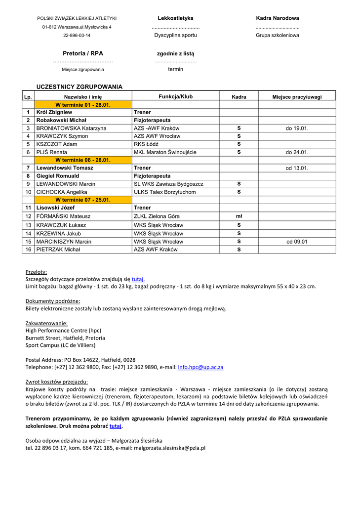 POLSKI ZWIĄZEK LEKKIEJ ATLETYKI Lekkoatletyka Kadra Narodowa 01-612 Warszawa,ul.Mysłowicka 4 ................................ ............................... 22-896-03-14 Dyscyplina sportu Grupa szkoleniowa Pretoria / RPA .................................... zgodnie z listą ............................ Miejsce zgrupowania termin UCZESTNICY ZGRUPOWANIA Lp. 1 2 3 4 5 6 7 8 Funkcja/Klub Nazwisko i imię W terminie 01 - 28.01. Król Zbigniew Robakowski Michał BRONIATOWSKA Katarzyna KRAWCZYK Szymon KSZCZOT Adam PLIŚ Renata W terminie 06 - 28.01. Lewandowski Tomasz Giegiel Romuald Trener Fizjoterapeuta AZS -AWF Kraków AZS AWF Wrocław RKS Łódź MKL Maraton Świnoujście Kadra Miejsce pracy/uwagi S do 19.01. S S S Trener Fizjoterapeuta do 24.01. od 13.01. 9 LEWANDOWSKI Marcin 10 CICHOCKA Angelika W terminie 07 - 25.01. 11 Lisowski Józef SL WKS Zawisza Bydgoszcz ULKS Talex Borzytuchom 12 FÓRMAŃSKI Mateusz ZLKL Zielona Góra mł 13 KRAWCZUK Łukasz WKS Śląsk Wrocław S 14 KRZEWINA Jakub 15 MARCINISZYN Marcin 16 PIETRZAK Michał WKS Śląsk Wrocław WKS Śląsk Wrocław AZS AWF Kraków S S S Trener S od 09.01 S Przeloty: Szczegóły dotyczące przelotów znajdują się tutaj. Limit bagażu: bagaż główny - 1 szt. do 23 kg, bagaż podręczny - 1 szt. do 8 kg i wymiarze maksymalnym 55 x 40 x 23 cm. Dokumenty podróżne: Bilety elektroniczne zostały lub zostaną wysłane zainteresowanym drogą mejlową. Zakwaterowanie: High Performance Centre (hpc) Burnett Street, Hatfield, Pretoria Sport Campus (LC de Villiers) Postal Address: PO Box 14622, Hatfield, 0028 Telephone: [+27] 12 362 9800, Fax: [+27] 12 362 9890, e-mail: [email protected] Zwrot kosztów przejazdu: Krajowe koszty podróży na trasie: miejsce zamieszkania - Warszawa - miejsce zamieszkania (o ile dotyczy) zostaną wypłacone kadrze kierowniczej (trenerom, fizjoterapeutom, lekarzom) na podstawie biletów kolejowych lub oświadczeń o braku biletów (zwrot za 2 kl. poc. TLK / IR) dostarczonych do PZLA w terminie 14 dni od daty zakończenia zgrupowania. Trenerom przypominamy, że po każdym zgrupowaniu (również zagranicznym) należy przesłać do PZLA sprawozdanie szkoleniowe. Druk można pobrać tutaj. Osoba odpowiedzialna za wyjazd – Małgorzata Ślesińska tel. 22 896 03 17, kom. 664 721 185, e-mail: [email protected]