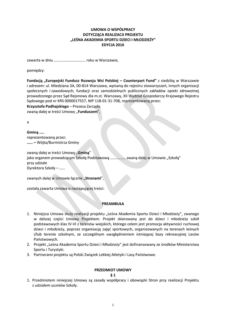 UMOWA O WSPÓŁPRACY DOTYCZĄCA REALIZACJI PROJEKTU „LEŚNA AKADEMIA SPORTU DZIECI I MŁODZIEŻY” EDYCJA 2016 zawarta w dniu …………………………… roku w Warszawie, pomiędzy: Fundacją „Europejski Fundusz Rozwoju Wsi Polskiej – Counterpart Fund” z siedzibą w Warszawie i adresem: ul. Miedziana 3A, 00-814 Warszawa, wpisaną do rejestru stowarzyszeń, innych organizacji społecznych i zawodowych, fundacji oraz samodzielnych publicznych zakładów opieki zdrowotnej prowadzonego przez Sąd Rejonowy dla m.st. Warszawy, XII Wydział Gospodarczy Krajowego Rejestru Sądowego pod nr KRS 0000017557, NIP 118-01-31-708, reprezentowaną przez: Krzysztofa Podhajskiego – Prezesa Zarządu zwaną dalej w treści Umowy „Funduszem”, a Gminą ….. reprezentowaną przez: …… – Wójta/Burmistrza Gminy zwaną dalej w treści Umowy „Gminą” jako organem prowadzącym Szkołę Podstawową ……………. zwaną dalej w Umowie „Szkołą” przy udziale Dyrektora Szkoły – …… zwanych dalej w Umowie łącznie „Stronami”, została zawarta Umowa o następującej treści: PREAMBUŁA 1. Niniejsza Umowa służy realizacji projektu „Leśna Akademia Sportu Dzieci i Młodzieży”, zwanego w dalszej części Umowy Projektem. Projekt skierowany jest do dzieci i młodzieży szkół podstawowych klas IV-VI z terenów wiejskich, którego celem jest promocja aktywności ruchowej dzieci i młodzieży, poprzez organizację zajęć sportowych, organizowanych na terenach leśnych i/lub terenie szkolnym, ze szczególnym uwzględnieniem istniejącej bazy rekreacyjnej Lasów Państwowych. 2. Projekt „Leśna Akademia Sportu Dzieci i Młodzieży” jest dofinansowany ze środków Ministerstwa Sportu i Turystyki. 3. Partnerami projektu są Polski Związek Lekkiej Atletyki i Lasy Państwowe. PRZEDMIOT UMOWY §1 1. Przedmiotem niniejszej Umowy są zasady współpracy i obowiązki Stron przy realizacji Projektu z udziałem uczniów Szkoły. 1 2. Fundusz oświadcza, że Szkoła została wytypowana do udziału w Projekcie w wyniku uzgodnień pomiędzy Funduszem oraz Gminą. Gmina wyraża zgodę na udział Szkoły w Projekcie oraz zobowiązuje się do podjęcia czynności, zgodnie z niniejszą Umową. Założenia Projektu stanowią załącznik nr 1 do niniejszej Umowy. 3. Dyrektor Szkoły oświadcza, że zapoznał się z treścią załącznika nr 1, o którym mowa w ust. 2 i deklaruje w imieniu Szkoły udział w Projekcie oraz zobowiązuje się do podjęcia czynności, o których mowa w niniejszej Umowie, a Gmina na to wyraża zgodę. 1. 2. 3. 4. 5. REALIZACJA PROJEKTU PRZEZ SZKOŁĘ §2 Programem edukacyjnym Projektu będą objęci uczniowie klas IV-VI szkoły podstawowej (wymienić nazwę szkoły). Program edukacyjny Projektu zostanie zrealizowany w ramach zajęć lekcyjnych przez aktywnego lub byłego sportowca, uprawiającego dyscyplinę lekkoatletyczną, we współpracy ze wskazanym imiennie przez Szkołę nauczycielem przedmiotu wychowania fizycznego (Fundusz nie dopuszcza odstępstw w zakresie kwalifikacji nauczyciela), który jednocześnie: 1) będzie pełnił obowiązki Koordynatora Projektu w Szkole, 2) będzie pełnił obowiązki opiekuna uczniów podczas zajęć. Nauczyciel, o którym mowa w ust. 2 wskazany przez Szkołę do realizacji Projektu: 1) udokumentuje posiadane kwalifikacje nauczyciela przedmiotu wychowanie fizyczne lub pochodnych (zał. 2); 2) zbierze zgody na przetwarzanie danych osobowych oraz wykorzystania wizerunku uczniów (zał. 3) i przekaże do Gminy; 3) wypełni sprawozdanie dotyczące realizacji Projektu (zał. nr 4). Szkoła wskaże dodatkowych opiekunów, którzy będą czuwali nad bezpieczeństwem uczniów podczas zajęć sportowych. Szkoła zobowiązuje się do poinformowania o realizacji projektu na stronie internetowej Szkoły. ZADANIA GMINY PRZY REALIZACJI PROJEKTU §3 1. W ramach realizacji Projektu Gmina z udziałem Szkoły zobowiązuje się do: 1) oddelegowania Nauczyciela – Koordynatora Projektu, o którym mowa w § 2 ust. 2, do zrealizowania Projektu, zgodnie z jego założeniami, dokumentując wraz ze zgłoszeniem posiadane przez Nauczyciela kwalifikacje, o których mowa w § 2 ust. 3 pkt. 1; 2) wskazania nauczycieli, którzy będą pełnić rolę opiekunów podczas zajęć sportowych, o których mowa w § 2 ust. 4; 3) zgłoszenia min. 50 uczniów do udziału w Projekcie; 4) umożliwienia skorzystania z boiska i/lub hali sportowej, w celu przeprowadzenia zajęć sportowych w ramach Projektu; 5) zapewnienia obligatoryjnie wszystkim uczniom uczestniczącym w Projekcie zamieszkałym poza miejscowością, w której będą prowadzone zajęcia, dowozu z i do miejsca zamieszkania (przed i po zajęciach); 6) zapewnienia, jeśli będzie to konieczne, transportu do kompleksu leśnego, w którym odbędą się zajęcia sportowe, przewidziane Projektem; 7) informowania Funduszu o wszelkich okolicznościach, mogących mieć wpływ na przebieg realizacji Projektu w Szkole; 8) poinformowania rodziców/opiekunów uczniów biorących udział w Projekcie o jego założeniach i sposobie sfinansowania; 9) archiwizowania zgód na przetwarzanie danych osobowych oraz wykorzystania wizerunku uczniów na czas trwania projektu; 2 10) zamieszczenia informacji o realizacji projektu na stronie internetowej Gminy oraz powiadomienia lokalnych środków masowego przekazu o udziale w Projekcie. OBOWIĄZKI FUNDUSZU §4 Fundusz w ramach niniejszej Umowy zobowiązuje się do: 1) przekazywania Gminie i Szkole wszelkich informacji dotyczących Projektu; 2) zorganizowania, we współpracy z Nauczycielem – Koordynatorem Projektu, zajęć sportowych dla uczniów Szkoły, w tym zapewnienia głównego prowadzącego zajęcia w osobie sportowca lekkoatletycznego; 3) zapewnienie odpowiedniego sprzętu sportowego do przeprowadzenia zajęć sportowych w Szkole, który po zakończeniu zajęć zostanie przekazany do dyspozycji Szkoły na podstawie protokołu przekazania, stanowiącego zał