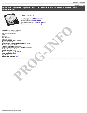 Informacje o produkcie Utworzono 02-03-2017 Dysk HDD Western Digital BLACK 2,5" 500GB SATA III 32MB 7200obr / min WD5000LPLX Cena : 255,31 zł PR -I N O G Gwarancja: 60 miesięcy gwarancji Kod Producenta: WD5000LPLX Kod UPC:: 718037829982 Opis: Typ: HDD Typ obudowy: 2,5 " Interfejs: SATA III Miejsce montażu: Wnęka obudowy Pojemność: 500 GB Zastosowanie w modelach serwerów: Nie dotyczy Pamięć podręczna: 32 MB Prędkość obrotowa: 7200 obr/min Średni czas bezawaryjnej pracy (MTBF): 1000000 h Funkcje dodatkowe: RoHS Poziom głośności: 25 dB Pobór mocy (spoczynek): 0,85 W Pobór mocy (praca): 2 W Wysokość: 7 mm Strona www produktu: Link FO Nr katalogowy : WD5000LPLX Producent : Western Digital Stan magazynowy : bardzo wysoki Średnia ocena : brak recenzji Wygenerowano w programie www.oscGold.com