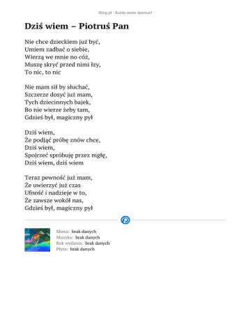 iSing.pl - Każdy może śpiewać! Dziś wiem – Piotruś Pan Nie chce dzieckiem już być, Umiem zadbać o siebie, Wierzą we mnie no cóż, Muszę skryć przed nimi łzy, To nic, to nic Nie mam sił by słuchać, Szczerze dosyć już mam, Tych dziecinnych bajek, Bo nie wierze żeby tam, Gdzieś był, magiczny pył Dziś wiem, Że podjąć próbę znów chce, Dziś wiem, Spojrzeć spróbuję przez mgłę, Dziś wiem, dziś wiem Teraz pewność już mam, Że uwierzyć już czas Ufność i nadzieje w to, Że zawsze wokół nas, Gdzieś był, magiczny pył Słowa: brak danych Muzyka: brak danych Rok wydania: brak danych Płyta: brak danych