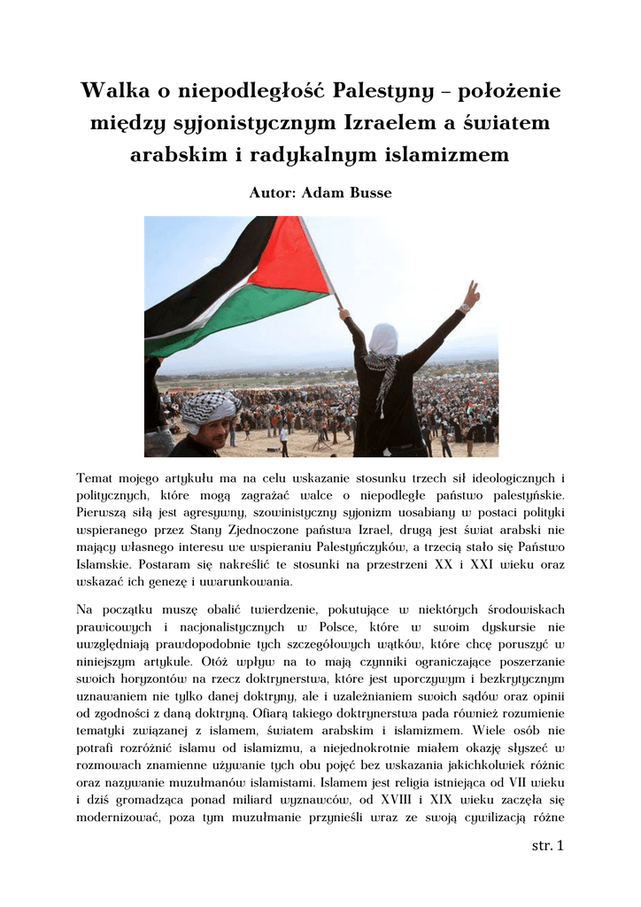 Walka o niepodległość Palestyny – położenie między syjonistycznym Izraelem a światem arabskim i radykalnym islamizmem Autor: Adam Busse Temat mojego artykułu ma na celu wskazanie stosunku trzech sił ideologicznych i politycznych, które mogą zagrażać walce o niepodległe państwo palestyńskie. Pierwszą siłą jest agresywny, szowinistyczny syjonizm uosabiany w postaci polityki wspieranego przez Stany Zjednoczone państwa Izrael, drugą jest świat arabski nie mający własnego interesu we wspieraniu Palestyńczyków, a trzecią stało się Państwo Islamskie. Postaram się nakreślić te stosunki na przestrzeni XX i XXI wieku oraz wskazać ich genezę i uwarunkowania. Na początku muszę obalić twierdzenie, pokutujące w niektórych środowiskach prawicowych i nacjonalistycznych w Polsce, które w swoim dyskursie nie uwzględniają prawdopodobnie tych szczegółowych wątków, które chcę poruszyć w niniejszym artykule. Otóż wpływ na to mają czynniki ograniczające poszerzanie swoich horyzontów na rzecz doktrynerstwa, które jest uporczywym i bezkrytycznym uznawaniem nie tylko danej doktryny, ale i uzależnianiem swoich sądów oraz opinii od zgodności z daną doktryną. Ofiarą takiego doktrynerstwa pada również rozumienie tematyki związanej z islamem, światem arabskim i islamizmem. Wiele osób nie potrafi rozróżnić islamu od islamizmu, a niejednokrotnie miałem okazję słyszeć w rozmowach znamienne używanie tych obu pojęć bez wskazania jakichkolwiek różnic oraz nazywanie muzułmanów islamistami. Islamem jest religia istniejąca od VII wieku i dziś gromadząca ponad miliard wyznawców, od XVIII i XIX wieku zaczęła się modernizować, poza tym muzułmanie przynieśli wraz ze swoją cywilizacją różne str. 1 odkrycia naukowe, ekonomiczne, matematyczne oraz kulturowe. Islamizm natomiast jest to ideologia polityczna powstała na przełomie XIX i XX wieku i odrzucająca zupełnie zachodnią cywilizację utożsamianą z historycznym wrogiem, jakim miało być chrześcijaństwo, a swoje koncepcje odbudowy świata opiera na prawie szariatu, wyszkolonych i zindoktrynowanych kadrach gotowych do walki, oraz przekształceniu wiary w ideologię polityczną odrzucającą jakiekolwiek podziały świata muzułmańskiego według ras, narodów, państw i cywilizacji na rzecz uniwersalnej wiary w jedynego Boga – Allaha oraz jego proroków. Głównymi reprezentantami tego nurtu są radykalne odłamy religii muzułmańskiej, czyli wahhabizm i salafizm. W tych samych kręgach opinii publicznej pojawiają się również głosy uznania, czy nawet otwartego poparcia dla Izraela, który ma stanowić rzekomo bastion cywilizacji zachodniej przed zalewem tysięcy imigrantów z krajów muzułmańskich, a przede wszystkim walczy z terroryzmem uosabianym w przypadku Palestyny przez Hamas i Islamski Dżihad. Należy tutaj wskazać parę istotnych elementów tej skomplikowanej układanki, które obalą te twierdzenia. Imigracja muzułmanów z Palestyny stanowi skutek nie tyle działań zbrojnych palestyńskich ugrupowań, ale między innymi polityki Izraela wobec Palestyńczyków. Dodatkowo państwo Izrael ze wszystkich stron graniczy z państwami z większością muzułmańską (Liban, Syria, Jordania i Egipt), a imigranci z innych krajów arabskich i północnoafrykańskich, które na przestrzeni wieków także przyjęły islam, omijają terytorium Izraela obierając za kierunek osiedlenia się najczęściej państwa Europy Zachodniej i Północnej. Spotkałem się też z twierdzeniem, iż Izrael jest obrońcą Europy przed islamem. Ta opinia może wzbudzić jedynie uśmiech politowania, ponieważ trzeba zadać pytanie, o jaką Europę chodzi. Czy chodzi o Europę zbudowaną na fundamencie chrześcijaństwa, rodzimych, przedchrześcijańskich korzeni krajów tworzących cywilizację europejską – starożytnej Grecji i Rzymu oraz ludów celtyckich, germańskich i słowiańskich, Europę zdolną do walki w obronie swoich praw, spuścizny oraz tradycyjnych wartości? A może o Europę toczoną przez chorobę demokracji liberalnej, multikulturalizmu i multirasowości, publicznego promowania wszelkich dewiacji i zboczeń seksualnych, które są niezgodne z prawem Boskim oraz prawami naturalnymi, dopuszczającą do stosowania represji wobec Kościoła w imię skrajnie laickiego państwa i prześladowań chrześcijan? Najpierw warto przedstawić stosunek Izraela do sprawy niepodległościowej Palestyńczyków. Palestyńczycy sprzeciwiali się syjonistycznej imigracji, której rezultatem były kończące się pogromami Żydów zamieszki w 1920, 1921 i 1929 roku. Wielka Brytania wspierała żydowską imigrację, ale w związku z narastającymi negatywnymi nastrojami w Palestynie wprowadziła jej ograniczenia. Po II wojnie światowej i doświadczeniach Holokaustu poparcie dla syjonizmu wzrosło wśród samych Żydów. Brytyjczycy stacjonujący w Palestynie byli atakowani przez syjonistyczne grupy, które usiłowały dzięki temu wymusić na nich zniesienie zakazu imigracji. Jednym z najgłośniejszych ataków było wysadzenie hotelu King David w 1946 roku przez grupę syjonistów - rewizjonistów, w wyniku zamachu zginęło 41 str. 2 Arabów, 26 Brytyjczyków, 17 Żydów i 5 ludzi innych narodowości. Nie potrafiąc rozwiązać konfliktu Brytyjczycy zwrócili się o pomoc do Organizacji Narodów Zjednoczonych, której specjalny komitet w 1947 roku zaproponował podział Palestyny na państwo żydowskie, państwo arabskie oraz terytorium kontrolowane przez ONZ (zwane Corpus separatum). 14 maja 1948 roku Agencja Żydowska pod kierownictwem Bena Guriona przejęła kontrolę nad Palestyną z rąk Brytyjczyków i proklamowała niepodległość Izraela. Polityka syjonistycznego państwa ma swoje negatywne i zbrodnicze oblicze w postaci wielu udokumentowanych i zbadanych zbrodni dokonanych na ludności arabskiej i palestyńskiej. Nie licząc dziesiątek tysięcy Palestyńczyków zabityc
