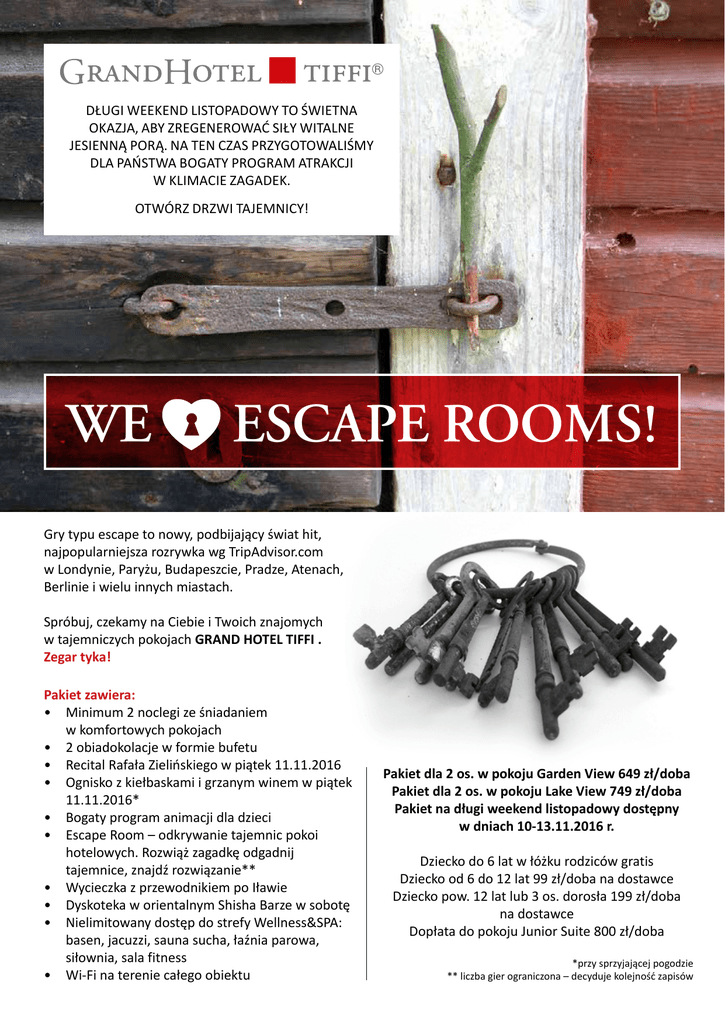 DŁUGI WEEKEND LISTOPADOWY TO ŚWIETNA OKAZJA, ABY ZREGENEROWAĆ SIŁY WITALNE JESIENNĄ PORĄ. NA TEN CZAS PRZYGOTOWALIŚMY DLA PAŃSTWA BOGATY PROGRAM ATRAKCJI W KLIMACIE ZAGADEK. OTWÓRZ DRZWI TAJEMNICY! WE ESCAPE ROOMS! Gry typu escape to nowy, podbijający świat hit, najpopularniejsza rozrywka wg TripAdvisor.com w Londynie, Paryżu, Budapeszcie, Pradze, Atenach, Berlinie i wielu innych miastach. Spróbuj, czekamy na Ciebie i Twoich znajomych w tajemniczych pokojach GRAND HOTEL TIFFI . Zegar tyka! Pakiet zawiera: • Minimum 2 noclegi ze śniadaniem w komfortowych pokojach • 2 obiadokolacje w formie bufetu • Recital Rafała Zielińskiego w piątek 11.11.2016 • Ognisko z kiełbaskami i grzanym winem w piątek 11.11.2016* • Bogaty program animacji dla dzieci • Escape Room – odkrywanie tajemnic pokoi hotelowych. Rozwiąż zagadkę odgadnij tajemnice, znajdź rozwiązanie** • Wycieczka z przewodnikiem po Iławie • Dyskoteka w orientalnym Shisha Barze w sobotę • Nielimitowany dostęp do strefy Wellness&SPA: basen, jacuzzi, sauna sucha, łaźnia parowa, siłownia, sala fitness • Wi-Fi na terenie całego obiektu Pakiet dla 2 os. w pokoju Garden View 649 zł/doba Pakiet dla 2 os. w pokoju Lake View 749 zł/doba Pakiet na długi weekend listopadowy dostępny w dniach 10-13.11.2016 r. Dziecko do 6 lat w łóżku rodziców gratis Dziecko od 6 do 12 lat 99 zł/doba na dostawce Dziecko pow. 12 lat lub 3 os. dorosła 199 zł/doba na dostawce Dopłata do pokoju Junior Suite 800 zł/doba *przy sprzyjającej pogodzie ** liczba gier ograniczona – decyduje kolejność zapisów