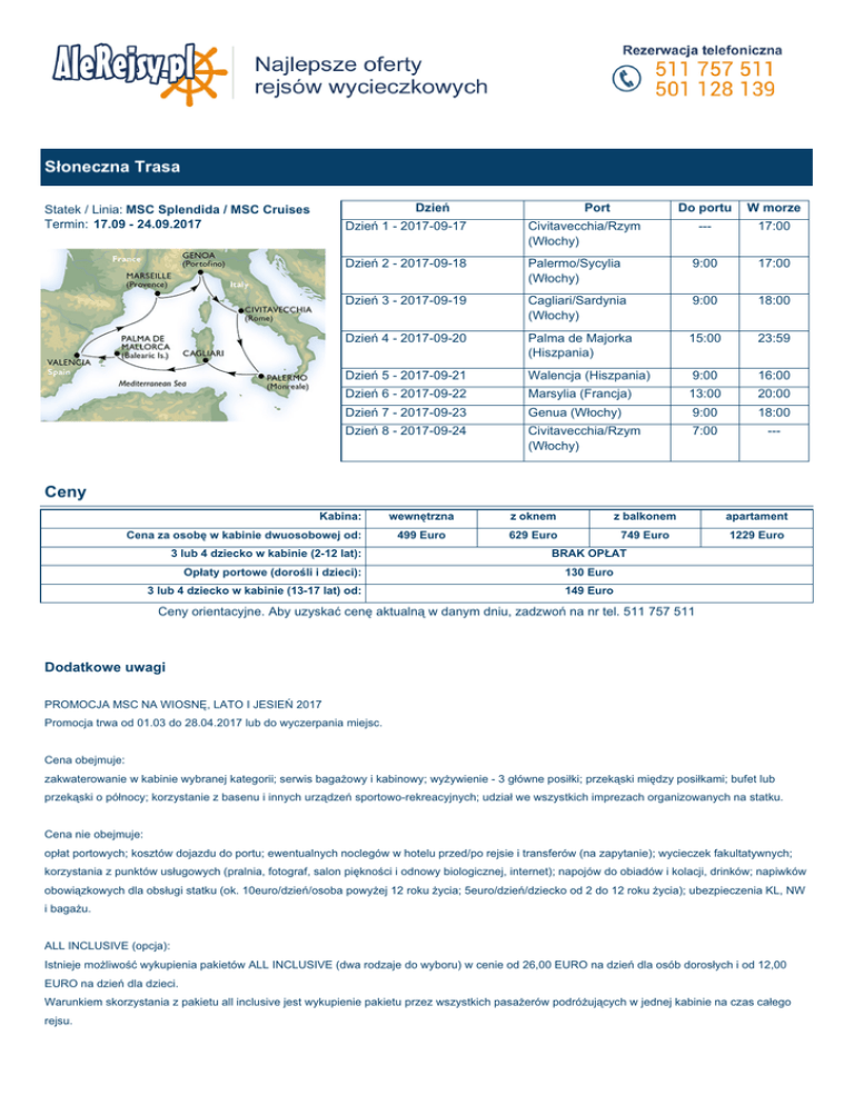 Słoneczna Trasa Dzień Statek / Linia: MSC Splendida / MSC Cruises Termin: 17.09 - 24.09.2017 Port Do portu W morze --- 17:00 Palermo/Sycylia (Włochy) 9:00 17:00 Dzień 3 - 2017-09-19 Cagliari/Sardynia (Włochy) 9:00 18:00 Dzień 4 - 2017-09-20 Palma de Majorka (Hiszpania) 15:00 23:59 Dzień 5 - 2017-09-21 Walencja (Hiszpania) 9:00 16:00 Dzień 6 - 2017-09-22 Marsylia (Francja) 13:00 20:00 Dzień 7 - 2017-09-23 Genua (Włochy) 9:00 18:00 Dzień 8 - 2017-09-24 Civitavecchia/Rzym (Włochy) 7:00 --- Dzień 1 - 2017-09-17 Civitavecchia/Rzym (Włochy) Dzień 2 - 2017-09-18 Ceny Kabina: Cena za osobę w kabinie dwuosobowej od: 3 lub 4 dziecko w kabinie (2-12 lat): wewnętrzna z oknem z balkonem apartament 499 Euro 629 Euro 749 Euro 1229 Euro BRAK OPŁAT Opłaty portowe (dorośli i dzieci): 130 Euro 3 lub 4 dziecko w kabinie (13-17 lat) od: 149 Euro Ceny orientacyjne. Aby uzyskać cenę aktualną w danym dniu, zadzwoń na nr tel. 511 757 511 Dodatkowe uwagi PROMOCJA MSC NA WIOSNĘ, LATO I JESIEŃ 2017 Promocja trwa od 01.03 do 28.04.2017 lub do wyczerpania miejsc. Cena obejmuje: zakwaterowanie w kabinie wybranej kategorii; serwis bagażowy i kabinowy; wyżywienie - 3 główne posiłki; przekąski między posiłkami; bufet lub przekąski o północy; korzystanie z basenu i innych urządzeń sportowo-rekreacyjnych; udział we wszystkich imprezach organizowanych na statku. Cena nie obejmuje: opłat portowych; kosztów dojazdu do portu; ewentualnych noclegów w hotelu przed/po rejsie i transferów (na zapytanie); wycieczek fakultatywnych; korzystania z punktów usługowych (pralnia, fotograf, salon piękności i odnowy biologicznej, internet); napojów do obiadów i kolacji, drinków; napiwków obowiązkowych dla obsługi statku (ok. 10euro/dzień/osoba powyżej 12 roku życia; 5euro/dzień/dziecko od 2 do 12 roku życia); ubezpieczenia KL, NW i bagażu. ALL INCLUSIVE (opcja): Istnieje możliwość wykupienia pakietów ALL INCLUSIVE (dwa rodzaje do wyboru) w cenie od 26,00 EURO na dzień dla osób dorosłych i od 12,00 EURO na dzień dla dzieci. Warunkiem skorzystania z pakietu all inclusive jest wykupienie pakietu przez wszystkich pasażerów podróżujących w jednej kabinie na czas całego rejsu. Uwagi: Kabiny 3/4 osobowe nie są dostępne we wszystkich kategoriach, a ich liczba jest ograniczona - sprzedaż tylko po potwierdzeniu; ceny wycieczek fakultatywnych, propozycje dojazdu do portu, hoteli przed/po rejsie na zapytanie.Na pokładzie statku obowiązuje bezgotówkowy system opłat. Należność reguluje się ostatniego dnia rejsu gotówką (wpłata depozytu ok. 250euro/kabina pierwszego dnia rejsu) lub kartą kredytową (VISA, Mastercard, American Express) na podstawie zbiorczego rachunku. Karty kredytowe należy zarejestrować zaraz po zaokrętowaniu. MSC Splendida MSC Splendida Tonaż: 133.500 ton Rok budowy 2009 Długość: 333 m Szerokość: 37,92 m Szybkość: 23 węzły Pokłady pasażerskie: 13 Załoga: 1.325 Pasażerowie: do 3.959 Basen: 5 Waluta: EURO Najnowsze technologie w połączeniu z luksusem stworzyły piękny statek. MSC Splendida jest jednostką nowoczesną, czerpie jednak i z przeszłości. Dodatkowo wyposażono ją w najnowsze systemy technologiczne zmniejszające zużycie energii i pomagające chronić środowisko, jak np. systemy przetwarzania wody. Wszystko to daje jej pełne prawo by dumnie nosić tytuł ECO SHIP.Pasażerowie znajdą tu mnóstwo zajęć i rozrywek, dzięki którym każdy dzień rejsu stanie się niepowtarzalny i fascynujący.