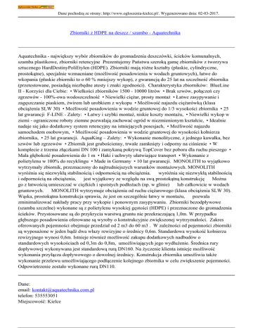 Dane pochodzą ze strony: http://www.ogloszenia-kielce.pl/. Wygenerowano dnia: 02-03-2017. Zbiorniki z HDPE na deszcz / szambo - Aquatechnika Aquatechnika - największy wybór zbiorników do gromadzenia deszczówki, ścieków komunalnych, szamba plastikowe, zbiorniki retencyjne Prezentujemy Państwu szeroką gamę zbiorników z tworzywa sztucznego HardDestinyPoliEtylen (HDPE). Zbiorniki mają różne kształty (płaskie, cylindryczne, prostokątne), specjalnie wzmacniane (możliwość posadowienia w wodach gruntowych), łatwe do wkopania (płaskie zbiorniki to o 60 % mniejszy wykop), z gwarancją do 25 lat na szczelność zbiornika (przetestowane, posiadają niezbędne atesty i znaki zgodności). Charakterystyka zbiorników: BlueLine II - Korzyści dla Ciebie: • Wielkości zbiorników 1500 - 10000 litrów • Brak szwów, połączeń czy zgrzewów - 100%-owa wodoszczelność • Niewielki ciężar, prosty montaż • Łatwe zasypywanie i zagęszczanie piaskiem, żwirem lub urobkiem z wykopu • Możliwość najazdu ciężarówką (klasa obciążenia SLW 30) • Możliwość posadowienia w wodzie gruntowej do 1/3 wysokości zbiornika • 25 lat gwarancji F-LINE - Zalety: • Łatwy i szybki montaż, niskie koszty montażu, • Niewielki wykop w ziemi - ograniczone roboty ziemne pozwalają zachować ogród w niezmienionym kształcie, • Idealnie nadaje się jako dodatkowy system retencyjny na istniejących posesjach, • Możliwość najazdu samochodem osobowym, • Możliwość posadowienia w wodzie gruntowej do wysokości kołnierza zbiornika, • 25 lat gwarancji. AquaKing – Zalety: • Wykonanie monolityczne, z jednego kawałka, bez szwów lub zgrzewów • Zbiornik jest grubościenny, trwale zamknięty i odporny na ciśnienie • W komplecie z trzema złączkami DN 100 i zamykaną pokrywą TopCover bez poboru dla ruchu pieszego • Mała głębokość posadowienia do 1 m • Haki i uchwyty ułatwiające transport • Wykonanie z polietylenu w 100% do recyklingu • Made in Germany • 10 lat gwarancji. MONOLITH to wyjątkowo wytrzymały zbiornik, przeznaczony do najtrudniejszych warunków montażowych. MONOLITH wyróżnia się niezwykłą stabilnością i odpornością na obciążenia. wyróżnia się niezwykłą stabilnością i odpornością na obciążenia, jest wyjątkowy ze względu na swą prostokątną konstrukcję Można go z łatwością umieszczać w ciężkich i spoistych podłożach (np. w glinie) lub całkowicie w wodach gruntowych. MONOLITH wytrzymuje obciążenia od ruchu ciężarowego (klasa obciążenia SLW 30). Wąska, prostokątna konstrukcja sprawia, że jest on szczególnie łatwy w montażu, pozwala zminimalizować nakłady pracy przy wykopie i ponownym zasypywaniu. Zbiorniki bezodpływowe (szamba szczelne) wykonane są z polietylenu wysokiej gęstości (HDPE) i przeznaczone do gromadzenia ścieków. Przystosowane są do przykrycia warstwą gruntu nie przekraczającą 1,0m. W przypadku głębszego posadowienia oferowane są wyroby o konstrukcyjnie zwiększonej wytrzymałości. Zakres oferowanych pojemności obejmuje przedział od 2 m3 do 60 m3 . W zależności od pojemności zbiorniki są wyposażone w jeden bądź dwa włazy rewizyjne o średnicy 0,6m. Standardowa wysokość kołnierza rewizyjnego wynosi 0,6m. Istnieje również możliwość zakupu dodatkowych nadbudów o standardowych wysokościach od 0,3m do 0,8m, umożliwiających jego wydłużenie. Średnica rury dopływowej wykonywana jest standardową rurą DN160. Na życzenie klienta istnieje możliwość wykonania przyłącza dopływowego o dowolnej średnicy. Konstrukcja zbiornika umożliwia także wykonanie przelewu umożliwiającego podłączenie kolejnego zbiornika w celu zwiększenie pojemności. Odpowietrzenie zostało wykonane rurą DN110. Dane: email: [email protected] telefon: 535553051 Miejscowość: Kielce Dane pochodzą ze strony: http://www.ogloszenia-kielce.pl/. Wygenerowano dnia: 02-03-2017.