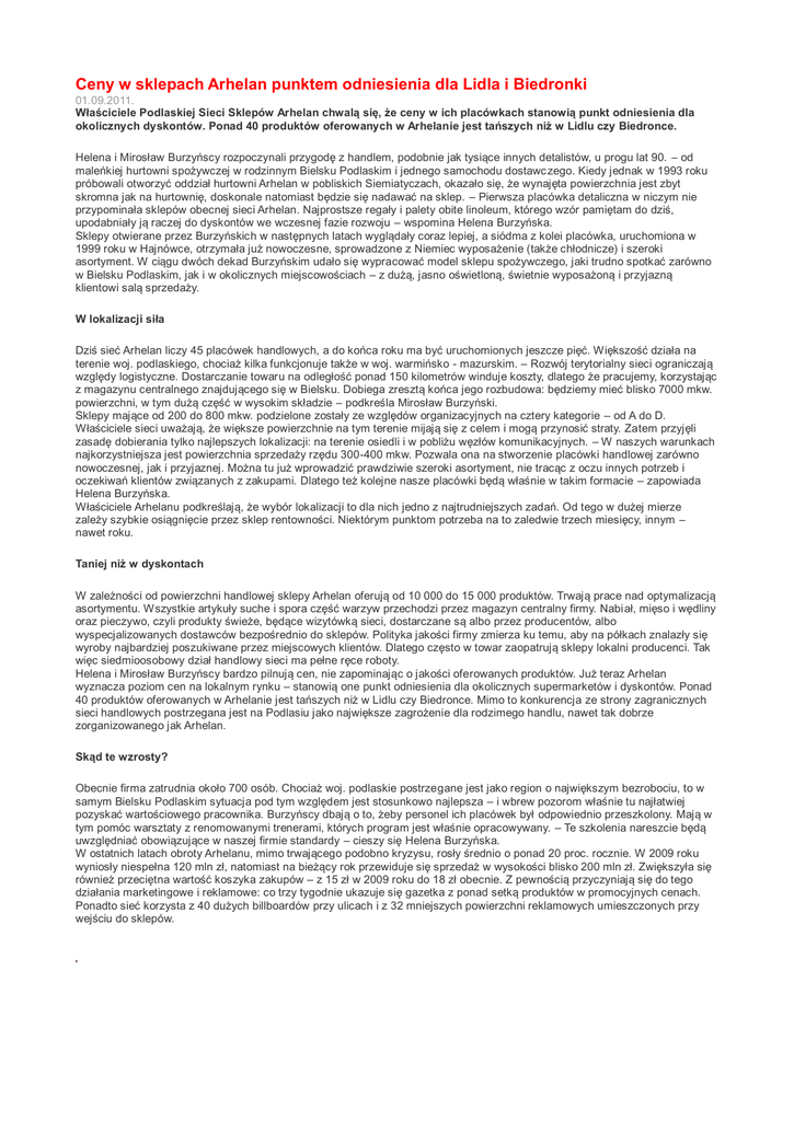 Ceny w sklepach Arhelan punktem odniesienia dla Lidla i Biedronki 01.09.2011. Właściciele Podlaskiej Sieci Sklepów Arhelan chwalą się, że ceny w ich placówkach stanowią punkt odniesienia dla okolicznych dyskontów. Ponad 40 produktów oferowanych w Arhelanie jest tańszych niż w Lidlu czy Biedronce. Helena i Mirosław Burzyńscy rozpoczynali przygodę z handlem, podobnie jak tysiące innych detalistów, u progu lat 90. – od maleńkiej hurtowni spożywczej w rodzinnym Bielsku Podlaskim i jednego samochodu dostawc zego. Kiedy jednak w 1993 roku próbowali otworzyć oddział hurtowni Arhelan w pobliskich Siemiatyczach, okazało się, że wynajęta powierzchnia jest zbyt skromna jak na hurtownię, doskonale natomiast będzie się nadawać na sklep. – Pierwsza placówka detaliczna w niczym nie przypominała sklepów obecnej sieci Arhelan. Najprostsze regały i palety obite linoleum, którego wzór pamiętam do dziś, upodabniały ją raczej do dyskontów we wczesnej fazie rozwoju – wspomina Helena Burzyńska. Sklepy otwierane przez Burzyńskich w następnych latach wyglądały coraz lepiej, a siódma z kolei placówka, uruchomiona w 1999 roku w Hajnówce, otrzymała już nowoczesne, sprowadzone z Niemiec wyposażenie (także chłodnicze) i szeroki asortyment. W ciągu dwóch dekad Burzyńskim udało się wypracować model sklepu spożywczego, jaki trudno spotkać zarówno w Bielsku Podlaskim, jak i w okolicznych miejscowościach – z dużą, jasno oświetloną, świetnie wyposażoną i przyjazną klientowi salą sprzedaży. W lokalizacji siła Dziś sieć Arhelan liczy 45 placówek handlowych, a do końca roku ma być uruchomionych jeszcze pięć. Większość działa na terenie woj. podlaskiego, chociaż kilka funkcjonuje także w woj. warmińsko - mazurskim. – Rozwój terytorialny sieci ograniczają względy logistyczne. Dostarczanie towaru na odległość ponad 150 kilometrów winduje koszty, dlatego że pracujemy, korzystając z magazynu centralnego znajdującego się w Bielsku. Dobiega zresztą końca jego rozbudowa: będziemy mieć blisko 7000 mkw. powierzchni, w tym dużą część w wysokim składzie – podkreśla Mirosław Burzyński. Sklepy mające od 200 do 800 mkw. podzielone zostały ze względów organizacyjnych na cztery kategorie – od A do D. Właściciele sieci uważają, że większe powierzchnie na tym terenie mijają się z celem i mogą przynosić straty. Zatem przyjęli zasadę dobierania tylko najlepszych lokalizacji: na terenie osiedli i w pobliżu węzłów komunikacyjnych. – W naszych warunkach najkorzystniejsza jest powierzchnia sprzedaży rzędu 300-400 mkw. Pozwala ona na stworzenie placówki handlowej zarówno nowoczesnej, jak i przyjaznej. Można tu już wprowadzić prawdziwie szeroki asortyment, nie tracąc z oczu innych potrzeb i oczekiwań klientów związanych z zakupami. Dlatego też kolejne nasze placówki będą właśnie w takim formacie – zapowiada Helena Burzyńska. Właściciele Arhelanu podkreślają, że wybór lokalizacji to dla nich jedno z najtrudniejszych zadań. Od tego w dużej mierze zależy szybkie osiągnięcie przez sklep rentowności. Niektórym punktom potrzeba na to zaledwie trzech miesięcy, innym – nawet roku. Taniej niż w dyskontach W zależności od powierzchni handlowej sklepy Arhelan oferują od 10 000 do 15 000 produktów. Trwają prace nad optymalizacją asortymentu. Wszystkie artykuły suche i spora część warzyw przechodzi przez magazyn centralny firmy. Nabiał, mięso i wędliny oraz pieczywo, czyli produkty świeże, będące wizytówką sieci, dostarczane są albo przez producentów, albo wyspecjalizowanych dostawców bezpośrednio do sklepów. Polityka jakości firmy zmierza ku temu, aby na półkach znalazły się wyroby najbardziej poszukiwane przez miejscowych klientów. Dlatego często w towar zaopatrują sklepy lokalni producenci. Tak więc siedmioosobowy dział handlowy sieci ma pełne ręce roboty. Helena i Mirosław Burzyńscy bardzo pilnują cen, nie zapominając o jakości oferowanych produktów. Już teraz Arhelan wyznacza poziom cen na lokalnym rynku – stanowią one punkt odniesienia dla okolicznych supermarketów i dyskontów. Ponad 40 produktów oferowanych w Arhelanie jest tańszych niż w Lidlu czy Biedronce. Mimo to konkurencja ze strony zagranicznych sieci handlowych postrzegana jest na Podlasiu jako największe zagrożenie dla rodzimego handlu, nawet tak dobrze zorganizowanego jak Arhelan. Skąd te wzrosty? Obecnie firma zatrudnia około 700 osób. Chociaż woj. podlaskie postrzegane jest jako region o największym bezrobociu, to w samym Bielsku Podlaskim sytuacja pod tym względem jest stosunkowo najlepsza – i wbrew pozorom właśnie tu najłatwiej pozyskać wartościowego pracownika. Burzyńscy dbają o to, żeby personel ich placówek był odpowiednio przeszkolony. Mają w tym pomóc warsztaty z renomowanymi trenerami, których program jest właśnie opracowywany. – Te szkolenia nareszcie będą uwzględniać obowiązujące w naszej firmie standardy – cieszy się Helena Burzyńska. W ostatnich latach obroty Arhelanu, mimo trwającego podobno kryzysu, rosły średnio o ponad 20 proc. rocznie. W 2009 roku wyniosły niespełna 120 mln zł, natomiast na bieżący rok przewiduje się sprzedaż w wysokości blisko 200 mln zł. Zwiększyła się również przeciętna wartość koszyka zakupów – z 15 zł w 2009 roku do 18 zł obecnie. Z pewnością przyczyniają się do tego działania marketingowe i reklamowe: co trzy tygodnie ukazuje się gazetka z ponad setką produktów w promocyjnych cenach. Ponadto sieć korzysta z 40 dużych billboardów przy ulicach i z 32 mniejszych powierzchni reklamowych umieszczonych przy wejściu do sklepów. Helena i Mirosław Burzyńscy stworzyli standard sklepu spożywczego, jaki trudno znaleźć na całym Podlasiu Nabiał, pieczywo, mięso i wędliny są wizytówką sieci – w dużej części pochodzą od lokalnych dostawców Witold N