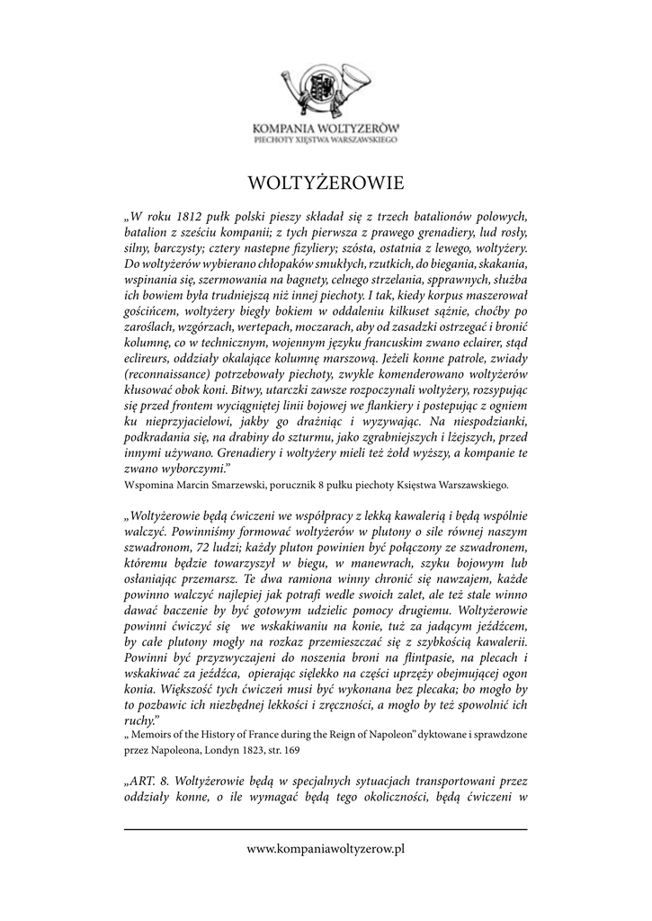 WOLTYŻEROWIE „W roku 1812 pułk polski pieszy składał się z trzech batalionów polowych, batalion z sześciu kompanii; z tych pierwsza z prawego grenadiery, lud rosły, silny, barczysty; cztery nastepne fizyliery; szósta, ostatnia z lewego, woltyżery. Do woltyżerów wybierano chłopaków smukłych, rzutkich, do biegania, skakania, wspinania się, szermowania na bagnety, celnego strzelania, spprawnych, służba ich bowiem była trudniejszą niż innej piechoty. I tak, kiedy korpus maszerował gościńcem, woltyżery biegły bokiem w oddaleniu kilkuset sążnie, choćby po zaroślach, wzgórzach, wertepach, moczarach, aby od zasadzki ostrzegać i bronić kolumnę, co w technicznym, wojennym języku francuskim zwano eclairer, stąd eclireurs, oddziały okalające kolumnę marszową. Jeżeli konne patrole, zwiady (reconnaissance) potrzebowały piechoty, zwykle komenderowano woltyżerów kłusować obok koni. Bitwy, utarczki zawsze rozpoczynali woltyżery, rozsypując się przed frontem wyciągniętej linii bojowej we flankiery i postepując z ogniem ku nieprzyjacielowi, jakby go drażniąc i wyzywając. Na niespodzianki, podkradania się, na drabiny do szturmu, jako zgrabniejszych i lżejszych, przed innymi używano. Grenadiery i woltyżery mieli też żołd wyższy, a kompanie te zwano wyborczymi.” Wspomina Marcin Smarzewski, porucznik 8 pułku piechoty Księstwa Warszawskiego. „Woltyżerowie będą ćwiczeni we współpracy z lekką kawalerią i będą wspólnie walczyć. Powinniśmy formować woltyżerów w plutony o sile równej naszym szwadronom, 72 ludzi; każdy pluton powinien być połączony ze szwadronem, któremu będzie towarzyszył w biegu, w manewrach, szyku bojowym lub osłaniając przemarsz. Te dwa ramiona winny chronić się nawzajem, każde powinno walczyć najlepiej jak potrafi wedle swoich zalet, ale też stale winno dawać baczenie by być gotowym udzielic pomocy drugiemu. Woltyżerowie powinni ćwiczyć się we wskakiwaniu na konie, tuż za jadącym jeźdźcem, by całe plutony mogły na rozkaz przemieszczać się z szybkością kawalerii. Powinni być przyzwyczajeni do noszenia broni na flintpasie, na plecach i wskakiwać za jeźdźca, opierając sięlekko na części uprzęży obejmującej ogon konia. Większość tych ćwiczeń musi być wykonana bez plecaka; bo mogło by to pozbawic ich niezbędnej lekkości i zręczności, a mogło by też spowolnić ich ruchy.” „ Memoirs of the History of France during the Reign of Napoleon” dyktowane i sprawdzone przez Napoleona, Londyn 1823, str. 169 „ART. 8. Woltyżerowie będą w specjalnych sytuacjach transportowani przez oddziały konne, o ile wymagać będą tego okoliczności, będą ćwiczeni w www.kompaniawoltyzerow.pl jeździe na końskim zadzie, za siedzącym w siodle kawalerzystą; zwinnym zeskakiwaniu; szybkim formowaniu się, i biec u boku jeźdźca w kłusie. Woltyżerowie będą także szkoleni w strzelaniu szybkim i bardzo celnym.” Zarządzenie o utworzeniu kompanii woltyżerów w każdym batalionie piechoty, Paris, 22 ventôse an XII (13 mars 1804) „ARTYKUŁ VIImy. MARSZ Woltyżery powinni bydź ćwiczeni nietylko w kroku zwyczaynym, lecz także w regularnym biegu, ponieważ w biegu, uskutecznić powinni odmiane kierunku, frontu, i nacieranie, chcąc opanować las, lub wieś, lub jakąkolwiek inną pozycyą, gdzie mogą bydź bezpieczni od ataku jazdy. Biegiem także cofnąć się powinni do swoich plotonów rezerwy, gdy jazda attakować ich zechce, chyba żeby się schronić potrafili do iakiego dołu lub fossy, albo za płot z kąd bezpiecznie strzelać do jazdy by mogli. W równinach Tyraliery marszerować powinni w naywiększym porządku, z nayzimnieyszą krwią i w cichości, niestrzelaiąc na próżno, i w pogotowiu do uskutecznienia wszystkich poruszeń które im nakazane będą” PRZEPIS MUSZTRY WOLTYŻERÓW czyli INNEY KOMPANII, NA MIEYSCU WOLTYŻERÓW UŻYTEY., WARSZAWA 1811 Wszystkie te fragmenty świadczą, że woltyżerowie byli formacją wysoko wyspecjalizowaną. Narażeni na wyjątkowe trudy i niebezpieczeństwo ciągłego przebywania na pierwszej linii, musieli jeszcze celnie strzelać i „szermować na bagnety”. Zastanawiające na ile byli oni w stanie dotrzymać faktycznie kroku lekkiej jeździe. W dziejach wojskowości lekka piechota, ściśle związana z kawalerią nie była zjawiskiem nowym. Germanie w początkach naszej ery posiadali takie oddziały, w których kawalerzysta miał przydzielonego piechura, który biegł stale przy nim trzymając się końskiej grzywy lub ogona. W czasach późniejszych też napotykamy na opisy biegającej piechoty chociażby szkockich górali, indian południowoamerykańskich, czy japońskich ashigaru. Okazuje się ze ludzie są zdolni do ciągłego biegu, nawet z tak niekomfortowym wyposażeniem jakie mieli woltyżerowie. Czako lub czapka na głowie, często ozdobiona kitą, jest straszną uciążliwością. Kita się gubi i zaczepia o gałęzie, nawet samo nakrycie głowy przez swą wysokość powoduje że trzeba się sporo natrudzić by nie zgubić go w biegu. www.kompaniawoltyzerow.pl Potwornie długi karabin, praktycznie dorównujący długością wzrostowi żołnierza, a kiedy ma osadzony bagnet to jest wyższy niż sam żołnierz, ten karabin jest przykrym ciężarem nawet w marszu czy podczas stania na warcie, a oni musieli z nim biegać. Do tego trzeba z nim biegać tak by: nie wypadł stempel, by nie zaplątać się w krzakach, by wreszcie nie wysypać z panewki prochu lub go nie zamoczyć, co z kolei wymusza podkreślony nawet regulaminem sposób noszenia tej broni; „pod lewe ramię broń” tak by lewy łokieć osłaniał zamkniętą panewkę przed deszczem. Poza tym jeszcze tasak, który ma potworny zwyczaj plątania się między nogami i zaczepiania się o zarośla. Plecak, który również lubi się zaczepiać, zahaczać i na wszelkie sposoby komplikować bieg, chociażby dlatego, że pasy mocujące go u dołu są