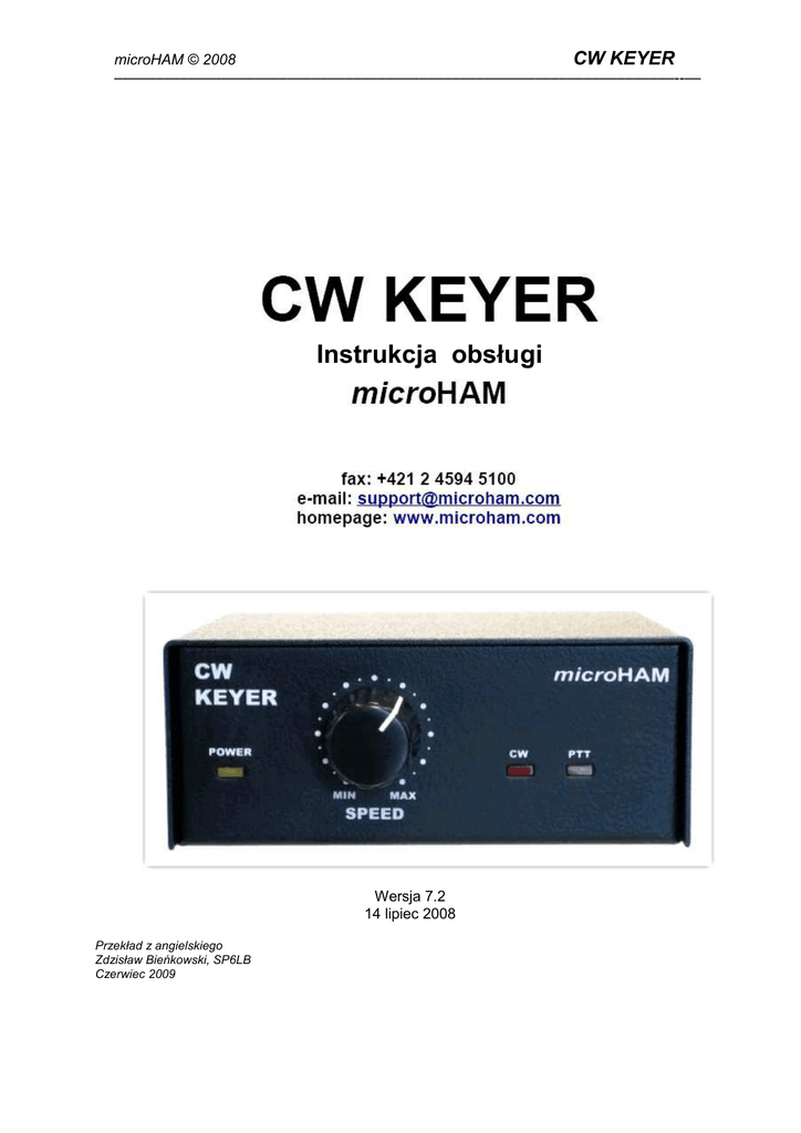 microHAM © 2008 CW KEYER ––––––––––––––––––––––––––––––––––––––––––––––––––––––––––––––––––––--–– Instrukcja obsługi Wersja 7.2 14 lipiec 2008 Przekład z angielskiego Zdzisław Bieńkowski, SP6LB Czerwiec 2009 microHAM © 2008 CW KEYER ––––––––––––––––––––––––––––––––––––––––––––––––––––––––––––––––––––--–– SPIS TREŚCI Rozdział Strona 1. Właściwości i funkcje .......................................................................... 3 2. WaŜne ostrzeŜenia .............................................................................. 3 3. Opis panelu ......................................................................................... 4 Panel przedni .................................................................................. 4 Panel tylny ...................................................................................... 4 4. Instalowanie ........................................................................................ 5 Przygotowanie do pracy ................................................................. 5 Instalowanie Routera urządzenia USB microHAM ........................ 6 Konfigurowanie Routera urządzenia USB microHAM .................... 7 Tworzenie i stosowanie Portu Wirtualnego ...................................... 8 5. Router urządzenia microHAM .............................................................. 9 Menu: Router ................................................................................. 9 Menu: Wstępne nastawienie (Preset) ............................................ 10 Menu: Urządzenie (Device) .......................................................... 11 Menu: Port Wirtualny (Virtual port) ................................................. 12 Menu: Pomoc (Help) .................................................................... 13 Konfiguracja urządzenia ............................................................... 13 Porty: CAT & 2nd CAT ................................................................ 15 Porty: CW ................................................................................ 17 Porty: PTT ................................................................................ 17 Porty: WinKey ........................................................................... 18 Porty: Sterowanie (control) ....................................................... 18 CW/WinKey : Nastawienie WinKey ............................................ 19 CW/WinKey : Klawiatura CW ................................................... 20 CW/WinKey : Automatyczne numerowanie ............................. 20 Komunikaty CW ....................................................................... 21 6. Zewnętrzna klawiatura .................................................................... 22 7. Zawartość pakietu ............................................................................ 23 8. Gwarancja ......................................................................................... 23 9. Specyfikacje ..................................................................................... 23 Uwagi na temat systemu .............................................................. 24 Specyfikacja osprzętu (hardware) ................................................ 24 Świadectwo zgodności .......................................................................... 25 Załącznik A – Uwagi na temat RFI ....................................................... 26 Załącznik B – Instalowanie APPLE OS 10 ............................................ 27 -------------------------------------------------------- 2 ----------------------------------------------------------Właściwości i funkcje microHAM © 2008 CW KEYER ––––––––––––––––––––––––––––––––––––––––––––––––––––––––––––––––––––--–– 1 – WŁAŚCIWOŚCI I FUNKCJE • Nie jest potrzebny port szeregowy lub równoległy, wystarczy tylko jeden port USB • Całkowita izolacja "Komputer ↔ Radio" • optyczna izolacja WSZYSTKICH sygnałów cyfrowych: → Radio Control, CW, PTT • Kompatybilne z wszystkimi programami logowania lub sterowania, bazującymi na MS Windows • specjalny program microHAM "USB Device Router" tworzy wirtualne porty COM dla pełnej współpracy ze standardowymi zastosowaniami (aplikacjami) Windows. • adaptowalne wstępne nastawienia (presets) pozwalają na natychmiastową zmianę parametrów CW Keyer, dla dopasowania do aktualnie uŜywanego programu. • Zintegrowany port sterowania komputerem dla wszystkich radiów CI-V, FIF-232, IF-232, RS-232 • pełna współpraca z radiami Icom, Kenwood, Ten-Tec, Yaesu i innymi radiami • nie jest potrzebny oddzielny konwerter poziomów • Zintegrowany chip K1EL WinKey™ z rozszerzoną moŜliwością dla najlepszego CW - gałka regulacji szybkości na przednim panelu - dziewięć (9) pamięci programowalnych przez uŜytkownika - klawiatura PS/2 obsługuje transmisję CW - klawiatura/ blok klawiszy PS/2 obsługuje odtwarzanie komunikatu i sterowanie - klawiatura PS/2 lub blok klawiszy CW pracuje bez podłączenia do komputera - precyzyjnie synchronizowane (timed) auto PTT - wybieralny ton boczny (podsłuchu) - wszystkie parametry są zachowane w nieulotnej pamięci i przeładowywane w czasie włączania zasilania • Wysoka odporność na zakłócenia RFI • • zintegrowane dławiki i filtry dla lepszej odporności na RFI nowoczesne ekranowanie i konstrukcja obwodów dla stłumienia produktów RFI • Podłączenia: • • • • Komputer – USB Radio: CAT-1/8", Manipulator (Paddle) – 1/4", CW w