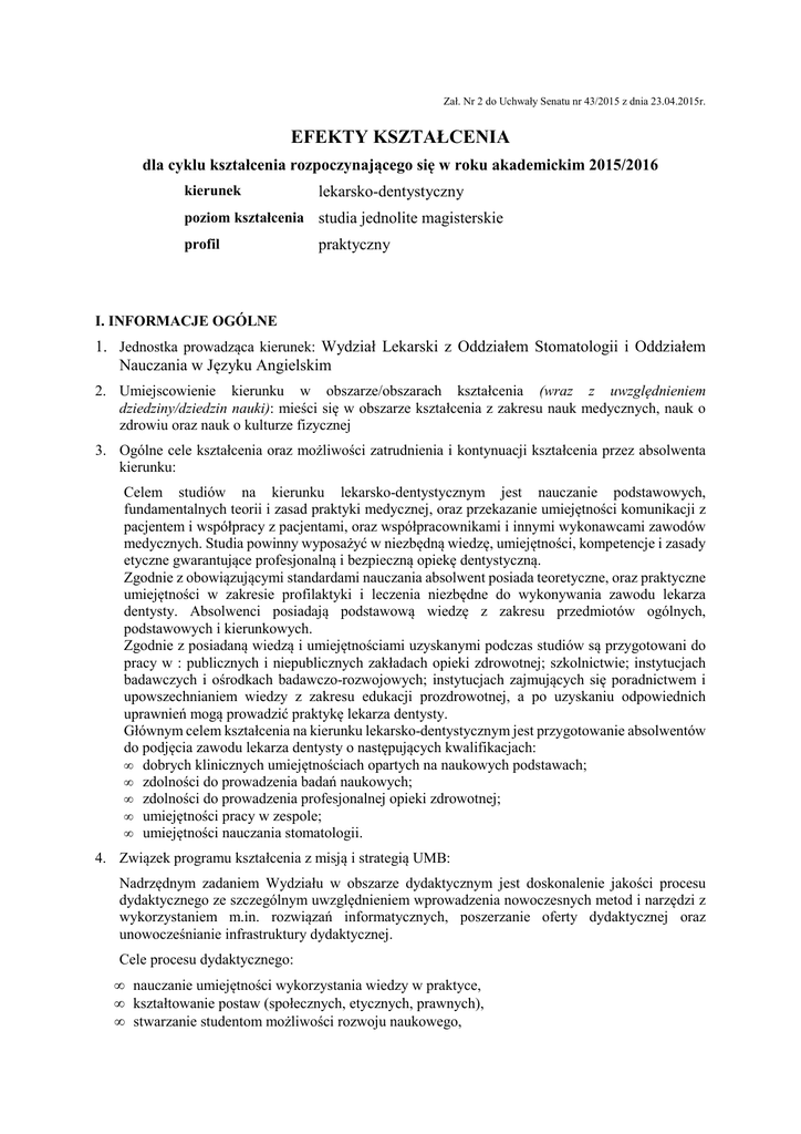Zał. Nr 2 do Uchwały Senatu nr 43/2015 z dnia 23.04.2015r. EFEKTY KSZTAŁCENIA dla cyklu kształcenia rozpoczynającego się w roku akademickim 2015/2016 kierunek lekarsko-dentystyczny poziom kształcenia studia jednolite magisterskie profil praktyczny I. INFORMACJE OGÓLNE 1. Jednostka prowadząca kierunek: Wydział Lekarski z Oddziałem Stomatologii i Oddziałem Nauczania w Języku Angielskim 2. Umiejscowienie kierunku w obszarze/obszarach kształcenia (wraz z uwzględnieniem dziedziny/dziedzin nauki): mieści się w obszarze kształcenia z zakresu nauk medycznych, nauk o zdrowiu oraz nauk o kulturze fizycznej 3. Ogólne cele kształcenia oraz możliwości zatrudnienia i kontynuacji kształcenia przez absolwenta kierunku: Celem studiów na kierunku lekarsko-dentystycznym jest nauczanie podstawowych, fundamentalnych teorii i zasad praktyki medycznej, oraz przekazanie umiejętności komunikacji z pacjentem i współpracy z pacjentami, oraz współpracownikami i innymi wykonawcami zawodów medycznych. Studia powinny wyposażyć w niezbędną wiedzę, umiejętności, kompetencje i zasady etyczne gwarantujące profesjonalną i bezpieczną opiekę dentystyczną. Zgodnie z obowiązującymi standardami nauczania absolwent posiada teoretyczne, oraz praktyczne umiejętności w zakresie profilaktyki i leczenia niezbędne do wykonywania zawodu lekarza dentysty. Absolwenci posiadają podstawową wiedzę z zakresu przedmiotów ogólnych, podstawowych i kierunkowych. Zgodnie z posiadaną wiedzą i umiejętnościami uzyskanymi podczas studiów są przygotowani do pracy w : publicznych i niepublicznych zakładach opieki zdrowotnej; szkolnictwie; instytucjach badawczych i ośrodkach badawczo-rozwojowych; instytucjach zajmujących się poradnictwem i upowszechnianiem wiedzy z zakresu edukacji prozdrowotnej, a po uzyskaniu odpowiednich uprawnień mogą prowadzić praktykę lekarza dentysty. Głównym celem kształcenia na kierunku lekarsko-dentystycznym jest przygotowanie absolwentów do podjęcia zawodu lekarza dentysty o następujących kwalifikacjach: • dobrych klinicznych umiejętnościach opartych na naukowych podstawach; • zdolności do prowadzenia badań naukowych; • zdolności do prowadzenia profesjonalnej opieki zdrowotnej; • umiejętności pracy w zespole; • umiejętności nauczania stomatologii. 4. Związek programu kształcenia z misją i strategią UMB: Nadrzędnym zadaniem Wydziału w obszarze dydaktycznym jest doskonalenie jakości procesu dydaktycznego ze szczególnym uwzględnieniem wprowadzenia nowoczesnych metod i narzędzi z wykorzystaniem m.in. rozwiązań informatycznych, poszerzanie oferty dydaktycznej oraz unowocześnianie infrastruktury dydaktycznej. Cele procesu dydaktycznego: • nauczanie umiejętności wykorzystania wiedzy w praktyce, • kształtowanie postaw (społecznych, etycznych, prawnych), • stwarzanie studentom możliwości rozwoju naukowego, • dbanie o dostęp do aktualnej literatury i czasopism, zarówno krajowych, jak i zagranicznych oraz elektronicznych baz danych, • wprowadzenie na zajęciach ze studentami nowoczesnych metod sprawdzania wiedzy (wdrożenie TesticoEdu), • rozszerzenie oferty edukacyjnej poprzez dążenie do utworzenia nowych kierunków studiów (anglojęzyczny kier. lek-dent., rozwój nauczania w standardach amerykańskich), • uczestnictwo w europejskim systemie szkolnictwa wyższego poprzez międzynarodową wymianę i współpracę w procesie kształcenia studentów, co będzie wymagało wzbogacenia oferty poprzez dwustronne i wielostronne umowy o współpracy z uczelniami europejskimi; zapewnienie najwyższej jakości w organizacji zagranicznych praktyk studenckich, • poprawa dostępności do sieci informatycznej uczelni (akademiki, biblioteka, dziekanaty oraz terminale w miejscach dostępnych dla studentów uruchamiane za pomocą legitymacji elektronicznej), • wprowadzenie e-indeksu, • dalsze doskonalenie jakości kształcenia i jego monitorowania, między innymi przez upowszechnianie elektronicznej ankiety studenckiej, • przygotowanie Uczelni do zmian w programach nauczania związanych z likwidacją stażu podyplomowego na kierunku lekarskim i lekarsko-dentystycznym; położenie nacisku na zajęcia praktyczne mające bezpośredni związek z wykonywanym zawodem, • utworzenie Centrum Symulacji Medycznej wyposażonego w fantomy, symulatory i specjalistyczne oprogramowanie. 5. Wskazanie, czy w procesie definiowania efektów kształcenia oraz tworzenia programu studiów uwzględniono opinie studentów, absolwentów i pracodawców : tak 6. Wymagania wstępne (oczekiwane kompetencje kandydata – szczególnie w przypadku studiów drugiego stopnia): zgodnie z uchwała rekrutacyjną 7. Tytuł zawodowy uzyskiwany przez absolwenta: lekarz dentysta II. KIERUNKOWE EFEKTY KSZTAŁCENIA OPIS KIERUNKOWYCH EFEKTÓW KSZTAŁCENIA Po ukończeniu studiów absolwent: WIEDZA AW1. wykazuje znajomość struktur organizmu ludzkiego: komórek, tkanek, narządów i systemów ze szczególnym uwzględnieniem układu stomatognatycznego; AW2. posiada wiedzę na temat rozwoju narządów i całego organizmu ze szczególnym uwzględnieniem narządu żucia; AW3. zna budowę ciała ludzkiego w ujęciu topograficznym i czynnościowym; AW4. rozumie rolę układu nerwowego dla funkcjonowania poszczególnych narządów; BW1. zna znaczenie pierwiastków głównych i śladowych w procesach zachodzących w organizmie z uwzględnieniem podaży, wchłaniania i transportu; BW2. zna znaczenie elektrolitów, układów buforowych i reakcji chemicznych w układach biologicznych; BW3. zna biochemiczne podstawy integralności organizmu ludzkiego; BW4. zna budowę i funkcje ważnych związków chemicznych występujących w organizmie ludzkim, a w szczególności właściwości, funkcje, metabolizm i energetykę reakcji: białek, kwasów nukleinowych, węglowodanów, lipidów, enzymów i hormonów; BW5. zna zasady gospodarki wapniowej i fosforanowej; BW6. zna rolę i z