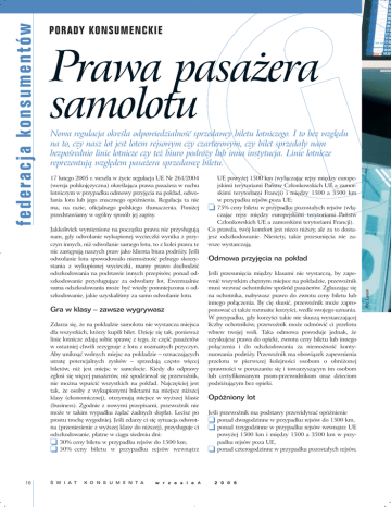 Prawa pasa˝era samolotu Nowa regulacja okreÊla odpowiedzialnoÊç sprzedawcy biletu lotniczego. I to bez wzgl´du na to, czy nasz lot jest lotem rejsowym czy czarterowym, czy bilet sprzeda∏y nam bezpoÊrednio linie lotnicze czy te˝ biuro podró˝y lub inna instytucja. Linie lotnicze reprezentujà wzgl´dem pasa˝era sprzedawc´ biletu. 17 lutego 2005 r. wesz∏a w ˝ycie regulacja UE Nr 261/2004 (wersja polskoj´zyczna) okreÊlajàca prawa pasa˝era w ruchu lotniczym w przypadku odmowy przyj´cia na pok∏ad, odwo∏ania lotu lub jego znacznego opóênienia. Regulacja ta nie ma, na razie, oficjalnego polskiego t∏umaczenia. Poni˝ej przedstawiamy w ogólny sposób jej zapisy. Jakkolwiek wymienione na poczàtku prawa nie przys∏ugujà nam, gdy odwo∏anie wykupionej wycieczki wynika z przyczyn innych, ni˝ odwo∏anie samego lotu, to z kolei prawa te nie zast´pujà naszych praw jako klienta biura podró˝y. JeÊli odwo∏anie lotu spowodowa∏o niemo˝noÊç pe∏nego skorzystania z wykupionej wycieczki, mamy prawo dochodziç odszkodowania na podstawie innych przepisów, ponad odszkodowanie przys∏ugujàce za odwo∏any lot. Ewentualnie suma odszkodowania mo˝e byç wtedy pomniejszona o odszkodowanie, jakie uzyskaliÊmy za samo odwo∏anie lotu. Gra w klasy – zawsze wygrywasz Zdarza si´, ˝e na pok∏adzie samolotu nie wystarcza miejsca dla wszystkich, którzy kupili bilet. Dzieje si´ tak, poniewa˝ linie lotnicze zdajà sobie spraw´ z tego, ˝e cz´Êç pasa˝erów w ostatniej chwili rezygnuje z lotu z rozmaitych przyczyn. Aby uniknàç wolnych miejsc na pok∏adzie – oznaczajàcych utrat´ potencjalnych zysków – sprzedajà cz´sto wi´cej biletów, ni˝ jest miejsc w samolocie. Kiedy do odprawy zg∏osi si´ wi´cej pasa˝erów, ni˝ spodziewa∏ si´ przewoênik, nie mo˝na wpuÊciç wszystkich na pok∏ad. Najcz´Êciej jest tak, ˝e osoby z wykupionymi biletami na miejsce ni˝szej klasy (ekonomicznej), otrzymujà miejsce w wy˝szej klasie (business). Zgodnie z nowymi przepisami, przewoênik nie mo˝e w takim wypadku ˝àdaç ˝adnych dop∏at. Lecisz po prostu troch´ wygodniej. JeÊli zdarzy ci si´ sytuacja odwrotna (przeniesienie z wy˝szej klasy do ni˝szej), przys∏uguje ci odszkodowanie, p∏atne w ciàgu siedmiu dni: o 30% ceny biletu w przypadku rejsów do 1500 km; o 50% ceny biletu w przypadku rejsów wewnàtrz 16  W I A T K O N S U M E N T A w r z e s i e ƒ UE powy˝ej 1500 km (wy∏àczajàc rejsy mi´dzy europejskimi terytoriami Paƒstw Cz∏onkowskich UE a zamorskimi terytoriami Francji) i mi´dzy 1500 a 3500 km w przypadku rejsów poza UE; o 75% ceny biletu w przypadku pozosta∏ych rejsów (w∏àczajàc rejsy mi´dzy europejskimi terytoriami Paƒstw Cz∏onkowskich UE a zamorskimi terytoriami Francji). Co prawda, twój komfort jest nieco ni˝szy, ale za to dostajesz odszkodowanie. Niestety, takie przesuni´cia nie zawsze wystarczajà. Odmowa przyj´cia na pok∏ad JeÊli przesuni´cia mi´dzy klasami nie wystarczà, by zapewniç wszystkim ch´tnym miejsce na pok∏adzie, przewoênik musi wezwaç ochotników spoÊród pasa˝erów. Zg∏aszajàc si´ na ochotnika, nabywasz prawo do zwrotu ceny biletu lub innego po∏àczenia. By ci´ skusiç, przewoênik mo˝e zaproponowaç ci tak˝e rozmaite korzyÊci, wedle swojego uznania. W przypadku, gdy korzyÊci takie nie skuszà wystarczajàcej liczby ochotników, przewoênik mo˝e odmówiç ci przelotu wbrew twojej woli. Taka odmowa powoduje jednak, ˝e uzyskujesz prawa do opieki, zwrotu ceny biletu lub innego po∏àczenia i do odszkodowania za niemo˝noÊç kontynuowania podró˝y. Przewoênik ma obowiàzek zapewnienia przelotu w pierwszej kolejnoÊci osobom o obni˝onej sprawnoÊci w poruszaniu si´ i towarzyszàcym im osobom lub certyfikowanym psom-przewodnikom oraz dzieciom podró˝ujàcym bez opieki. Opóêniony lot JeÊli przewoênik ma podstawy przewidywaç opóênienie o ponad dwugodzinne w przypadku rejsów do 1500 km, o ponad trzygodzinne w przypadku rejsów wewnàtrz UE powy˝ej 1500 km i mi´dzy 1500 a 3500 km w przypadku rejsów poza UE, o ponad czterogodzinne w przypadku pozosta∏ych rejsów, 2 0 0 6 fot. Luxair federacja konsumentów PORADY KONSUMENCKIE o dwa tygodnie przed odlotem lub o do siedmiu dni przed odlotem, jeÊli zaproponuje w zamian rejs, rozpoczynajàcy si´ nie wczeÊniej ni˝ dwie godziny przed planowanym odlotem i docierajàcy do celu nie póêniej ni˝ cztery godziny po zaplanowanym czasie przylotu lub o mniej ni˝ siedem dni przed planowanym odlotem, jeÊli zaproponuje w zamian rejs, rozpoczynajàcy si´ nie wczeÊniej ni˝ godzin´ przed zaplanowanym odlotem, a koƒczàcy si´ nie póêniej ni˝ dwie godziny po planowanym czasie przylotu. To na przewoêniku spoczywa obowiàzek udowodnienia, ˝e poinformowa∏ pasa˝era odpowiednio wczeÊnie. Przewoênik jest zwolniony z odszkodowania, jeÊli wyka˝e, ˝e odwo∏anie nastàpi∏o z przyczyn wyjàtkowych (np. kataklizmy, strajki, z∏a pogoda), którym nie móg∏ zapobiec, stosujàc wszelkie uzasadnione dzia∏ania. Prawo do opieki JeÊli, na skutek odmowy przyj´cia na pok∏ad lub opóênienia albo odwo∏ania lotu, czekasz na lotnisku d∏u˝ej, ni˝ mog∏eÊ si´ spodziewaç, przys∏uguje ci wy˝ywienie i nocleg w hotelu, odpowiednio do czasu oczekiwania na nast´pny lot (zawsze, jeÊli musisz czekaç dodatkowà noc lub kilka dni), wraz z darmowym transportem mi´dzy hotelem a lotniskiem. Taka opieka powinna byç stosowna do czasu dodatkowego oczekiwania. Przewoênik ma obowiàzek zapewnienia opieki w pierwszej kolejnoÊci osobom o obni˝onej sprawnoÊci w poruszaniu si´ i towarzyszàcym im osobom lub psom, oraz dzieciom podró˝ujàcym bez opieki. Masz tak˝e prawo do dwóch bezp∏atnych po∏àczeƒ telefonicznych, teleksów, faksów lub wiadomoÊci e-mail. lub gdy takie opóênienie ju˝ nastàpi∏o, przys∏uguje ci prawo do opieki. Dodatkowo, jeÊli przewidywane opóênienie wynosi ponad pi´ç godzin, masz 