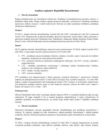 Analiza regionów Republiki Kazachstanu 1. Obwód Akmoliński Region charakteryzuje się rozwiniętym rolnictwem. Produkcja wysokojakościowej pszenicy stanowi ¼ produkcji całego kraju. Drugie miejsce zajmuje przemysł mineralny i przetwórczy. Dominuje produkcja spożywcza, budowy maszyn i metali kolorowych. Rozwija się także produkcja molibdenu, produkcja chemiczna i budownictwo. Eksport W 2014 r. eksport obwodu Akmolińskiego wyniósł 482 mln USD i wstosunku do roku 2013 zanotował wzrost o 6%. Eksportowane są głównie produkty spożywcze (pszenica, siemię lniane, mąka, jęczmień), a głównymi rynkami zbytu jest Uzbekistan, Iran, Tadżykistan, Afganistan, Belgia, Kirgistan, Rosja, Polska, Dania i Łotwa. Obwód eksportuje również produkcję chemiczną, głównie do Chin i Rosji. Import 98,7% improtu obwodu Akmolińskiego stanowią towary przetworzone. W 2014r. import wyniósł 623,3 mln USD, z czego import towarów przetworzonych to 615,4 mln USD. 47% - produkcja maszyn (kombajny zbożowe, traktory, siewniki, części i akcesoria do środków transportu, urządzenia do wyposażenia ferm drobiu) 21% - przemysł chemiczny (polietylen, polipropylen, herbicydy, rury PCV, wyroby z plastiku i węgiel aktywny) 11% - produkty pochodzenia zwierzęcego i roślinnego (mleko skondensowane, kiełbasa, słodycze, sosy i przyprawy, mięso drobiowe) 8,4% - metale i wyroby metalowe 3,8% - surowce naturalne 47% produktów jest importowanych z Rosji (maszyny, przemysł chemiczny i spożywczy). Wartość importu rur polietylenowych wyniósł 7,3 mln USD (3,4 tysiące ton), wyrobów mięsnych – 8,1 mln USD. Import z krajów Euroazjatyckiej Unii Gospodarczej stanowi 52% wartości. Z tych krajów importowany jest polietylen, produkty naftowe, pręty ze stali stopowej, maszyny rolnicze do zbioru żniw. Import z krajów UE stanowi 21%, z Chin – 7,4%. Podsumowanie Obwód Akmoliński mimo dość wysokiego udziału importu (56%) w wymianie handlowej dąży do jego substytucji. W ciągu ostatnich 5 lat w ramach programu industrializacji w kraju wybudowano 19 zakładów produkcji rur polietylenowych; na terenie kraju działa także ponad 9 zakładów produkcji mięsnej. 2. Obwód Aktobiński Głównymi kierunkami rozwoju gospodarki obwodu Aktobińskiego jest produkcja przemysłowa i rolnicza. W regionie znajdują się rudy chromitowe, zakład produkcji żelazostopów i zakład producji związków chromu. Obwód jest jedynym regionem w Kazachstanie, gdzie ekspolatowne są złoża niklu. Eksport W 2014 r. eksport obwodu Aktobińskiego wyniósł 5,4 mld USD. Z regionu eksportowane są przede wszystkim produkty mineralne: ropa naftowa, produkty naftowe, rudy miedzi, rudy chromu, propan, 1 kwarcyt, rudy cynku. Wartość eksportu tych produktów stanowi 70,8%. Główne rynki zbytu to Chiny, Holandia, Rosja, Włochy, Austria. Na drugim miejscu znajdują się metale i wyroby metalowe (25,4%), które eksportowane są do Japoni, Chin, Niemiec i USA. Import 93,3% importu obwodu Aktobińskiego stanowią towary przetworzone. W 2014 r. zmniejszył się on w stosunku do roku poprzedniego o 26,5% i wyniósł 1,6 mld USD. 37,1% - maszyny 16,6% - produkcja chemiczna 12,9% - produkcja spożywcza 12,7% – metale i wyroby metalowe 11,8% – surowce naturalne Obwód Aktobiński w głównej mierze importuje towary z krajów Euroazjatyckiej Unii Gospodarczej i Chin. Ich udział w łącznej wartości importu obwodu wynosi 76%. Z krajów EaUG importowane są przede wszystkim produkty naftowe, cement portlandzki, koks, opakowania ze szkła, rury metalowe, a także towary przemysłowe. Z Chin importowany jest sprzęt laboratoryjny, zawory do instalacji budowlanych. Wartość importu rur metalowych to 57,5 mln USD. Importowane są one z Chin (29,8 mln USD) i Rosji (21,2 mln USD). Do regionu trafiają również zawory do rurociągów o wartości 52,9 mln USD. Główni importerzy to Chiny, Niemcy, USA i Rosja. W 2014 r. obwód Aktobiński importuje również ryż z Rosji, o łącznej wartości 13,8 mln USD. Podsumowanie W ramach programu uprzemysłowienia w ciągu ostatnich 5 lat w regionie zrealizowano 74 projekty, które dotyczą produkcji 32 rodzajów towarów. Do najważniejszych eksportowych produktów regionu należą rury polietylenowe, produkcja farb i lakierów, a także wyroby makaronowe. Eksport obwodu Aktobińskiego jest słabo zdywersyfikowany i skoncentrowany przede wszystkim na dwóch produktach, jakimi są ropa naftowa i żelazostopy. 3. Obwód Ałmatyński Przez swoje położenie geograficzne, dostęp do zbiorników wodnych, żyzne gleby i bliskie sąsiedztwo z innymi krajami, jest to jeden z najlepiej prosperujących regionów. Gospodarka obwodu ałmatyńskiego oprata jest przede wszystkim na produkcji rolniczo-przemysłowej. Region jest krajowym liderem w uprawie soi, kukurydzy na ziarno, warzyw, mięsa, jajek i wełny; zajmuje drugie miejsce pod względem wielkości upraw winorośli i buraka cukrowego. Obwód przoduje także w produkcji wyrobów tytoniowych, wina winogronowego i opakowań z tektury falistej. Pozostaje również jedynym w kraju producentem słodu, akumulatorów elektrycznych, wyrobów gipsowo-kartonowych, żelbetonowych i metalowych konstrukcji wsporczych dla linii energetycznych wysokiego napięcia, hydrantów przeciwpożarowych, ocieplacza krawieckiego i ocynkowanych konstrukcji stalowych. Eksport W 2014 r. łączna suma eksportu obwodu Ałmatyńskiego wyniosła 365 mln USD. W stosunku do roku 2013 r. eksport wzrósł o 3%. Do krajów Euroazjatyckiej Unii Gospodarczej trafiło 15,1% produkcji, reszta była eksportowana do Chin, Kirgistanu i Tadżykistanu. Największą grupę towarów eksportowych stanowią produkty spożywcze: papierosy, filety rybne, mąka pszeniczna, słodycze, słód. Te produkty 2 stanowia 45,7% całości eksportu regionu. Główne rynki zbytu to Mongolia, Kirgistan, Uzbekistan, Rosja, Afganistan. Import 93,4% importu obwodu Ałmatyńskiego stanowią towary przetworzon