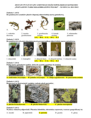 ZESTAW PYTAŃ ETAPU GMINNEGO OGÓLNOPOLSKIEGO KONKURSU ,,POZNAJEMY PARKI KRAJOBRAZOWE POLSKI” – XI EDYCJA 2011/2012 Zadanie 1. (0-5) Do poniższych rysunków płazów dopasuj odpowiednią nazwę gatunkową. A. B. C. 1. rzekotka drzewna 2. traszka grzebieniasta D. 3. grzebiuszka ziemna A-5, B-4, C-2, E. 4. kumak nizinny D-1, E-3 5. salamandra plamista Zadanie 2. (0-5) Do poniższych sylwetek dzięciołowatych przyporządkuj odpowiednią nazwę gatunkową. A. B. C. D. E. 1. dzięciołek 2. krętogłów 3. dzięcioł duży 4. dzięcioł zielony 5. dzięcioł czarny A-5, B-1, C-4, D-2, E-3 Zadanie 3. (0-4) Podaj nazwy gatunkowe gadów, których rysunki znajdują się poniżej. A. B. A. zaskroniec zwyczajny C. B. padalec zwyczajny D. C. żmija zygzakowata D. jaszczurka zwinka Zadanie 4. (0-3) Rozpoznaj na ilustracjach i podpisz rodzaje plech porostów: A. B. A. plecha krzaczkowata C. B. plecha listkowata C. plecha skorupiasta Zadanie 5. (0-1) Wybierz właściwą odpowiedź. Płucnica islandzka, obrostnica rzęsowata, wzorzec geograficzny to: A. mszaki B. paprotniki C. porosty D. grzyby E. glony Zadanie 6. (0-1) Zaznacz prawidłowe skojarzenia. A. mszaki, mech płonnik, chwytniki C. paprotniki, orlica pospolita, chwytniki B. płazy, stałocieplność, jajorodność D. ssak, dostojka malinowiec, żyworodność Zadanie 7. (0-1) Wybierz prawidłową odpowiedź. Wśród krajowych gatunków iglastych jedynym gatunkiem tracącym liście na zimę jest: A. cis pospolity B. modrzew europejski C. sosna limba D. jodła pospolita E. świerk pospolity Zadanie 8. (0-1) Kwiatostan typu koszyczek występuje u: A. babki lancetowatej B. mniszka lekarskiego C. maku polnego D. jasnoty białej Zadanie 9. (0-1) Który zestaw wskazuje na poprawne rozpoznanie roślin iglastych: 1. 2. 3. 4. 5. A. 1- jałowiec pospolity, 2-cis pospolity, 3- świerk pospolity, 4-jodła pospolita, 5- modrzew europejski B. 1- jodła pospolita, 2- modrzew europejski, 3- cis pospolity, 4- świerk pospolity, 5- jałowiec pospolity C. 1- świerk pospolity, 2- jałowiec pospolity, 3- modrzew europejski, 4- cis pospolity, 5- jodła pospolita D. 1. jodła pospolita, 2- modrzew europejski, 3- cis pospolity, 4- jałowiec pospolity, 5- świerk pospolity Zadanie 10. (0-1) Wybierz prawidłową odpowiedź. Izolinia na mapie łącząca punkty o takim samym stopniu zasolenia to: A. izohalina B. izobata C. izohieta D. izoterma E. izobronta Zadanie 11. (0-3) Różne pokroje sosny są przykładem zmienności modyfikacyjnej (środowiskowej). Dopasuj pokrój sosny do środowiska w którym występuje. A 1- sosna na wydmie B 2- sosna w nasadzonym lesie A-3, B-2, C-1 C 3- samotna sosna na polanie Zadanie 12. (0-1) Dokończ zdanie. Do elementów krajobrazu kulturowego należą: A. połoniny, zapory wodne, łąki C. pola uprawne, sady, bagna B. drogi, wodospady, pola uprawne D. zabudowania, pola uprawne, lasy bagienne Zadanie 13. (0-4) Rysunki przedstawiają obszary występowania wybranych gatunków drzew na terenie Polski. Do cyfry, którą oznaczono rysunki, dobierz nazwę drzewa. A. buk zwyczajny B. jarząb szwedzki C. jodła pospolita D. sosna zwyczajna 1-D, 2-B, 3-A, 4-C Zadanie 14. (0-6) Uzupełnij schemat, wpisując cyfry oznaczające odpowiednie nazwy procesów prowadzących do zmiany stanu skupienia wody: A. topnienie B. kondensacja C. sublimacja D. krystalizacja E. parowanie F. resublimacja 6 1 5 2 3 4 A-4, B-2, C-5, D-3, E-1, F-6 Zadanie 15. (0-4) Połącz w pary terminy z odpowiednim znaczeniem. A. stalaktyt B. kras C. wywierzysk D. stalagmit 1- zjawisko rozpuszczania przez wodę skał wapiennych, 2- naciek zwisający ze stropu jaskini, najczęściej w kształcie sopla, 3- naciek tworzący się na dnie jaskini, w kształcie sopla lub guza, 4- otwór w skale, z którego wypływa na powierzchnię źródło. A-2, B-1, C-4, D-3 Zadanie 16. (0-1) Poniżej podano opis wsi znajdującej się na terenie Zaborskiego Parku Krajobrazowego. Przeczytaj poniższy tekst i podaj nazwę miejscowości o której mowa. Jako osada leśna notowana była w II połowie XVIII w. Jest malowniczo położona między jeziorami Charzykowskim, Długim i Karsińskim. Wymieniana w średniowiecznych dokumentach augustianów pod nazwą Zwierzyniec. Małe Swornegacie Zadanie 17. (0-1) Dokończ zdanie. Rzeką przepływającą przez wieś Rolbik jest: A. Brda B. Zbrzyca C. Kulawa D. Kłonecznica E. Czerwona Struga Zadanie 18. (0-1) Dokończ zdanie. Najgłębszym jeziorem położonym na terenie Zaborskiego Parku Krajobrazowego jest: A. Płęsno C. Somińskie B. Parzyn D. Milachowo E. Charzykowskie Zadanie 19. (0-1) Dokończ zdanie. Z inicjatywą uznania np. drzewa, głazu za pomnik przyrody może wystąpić: A. służba ochrony przyrody D. minister środowiska B. organizacja społeczna E. wszystkie odpowiedzi są prawidłowe C. osoba prywatna Zadanie 20. (0-1) Dokończ zdanie. Pomnikiem przyrody na terenie Zaborskiego Parku Krajobrazowego nie jest: A. dąb ,,Łokietka” D. topole białe w Starym Młynie B. dąb ,,Bartuś” E. prawidłowa odpowiedź B i C C. dąb ,,Bartek” Zadanie 21. (0-1) Dokończ zdanie. Czerwony Szlak Kaszubski prowadzący z Chojnic do Wiela nosi imię: A. Anny Łajming B. Józefa Bruskiego C. Jana Karnowskiego D. Juliana Rydzkowskiego E. Izydora Gulgowskiego Zadanie 22. (0-1) Dokończ zdanie. Ścieżka lichenologiczno – kulturowa Zaborskiego Parku Krajobrazowego znajduję się w : A. Kaszubie B. Leśnie C. Rolbiku D. Kokoszce E. Widnie Zadanie 23. (0-1) Dokończ zdanie. Jeziora przepływowe Zaborskiego Parku Krajobrazowego to: A. Piecki, Małe Głuche, Duże Głuche – przepływa rzeka Kulawa, B. Charzykowskie, Karsińskie, Moczadło – przepływa rzeka Brda, C. Parzyn, Milachowo, Laska – przepływa rzeka Zbrzyca, D. Małołąckie, Łąckie, Dybrzk – przepływa rzeka Chocina. Zadanie 24. (0-7) Wymień w kolejności malejącej siedem największych jezior (powyżej 100 ha) Zaborskiego Parku Krajobrazowego. A. Somińskie E. Charzykowskie B. Witoczno F. Łą