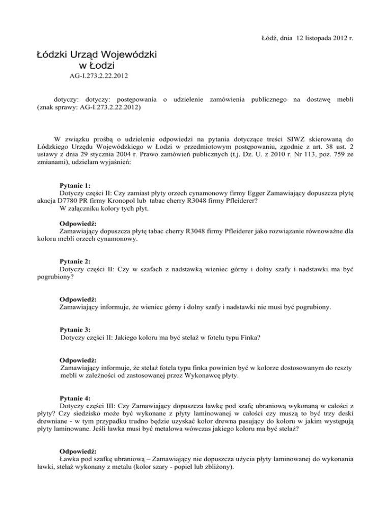 Łódź, dnia 12 listopada 2012 r. Łódzki Urząd Wojewódzki w Łodzi AG-I.273.2.22.2012 dotyczy: dotyczy: postępowania o udzielenie zamówienia publicznego na dostawę mebli (znak sprawy: AG-I.273.2.22.2012) W związku prośbą o udzielenie odpowiedzi na pytania dotyczące treści SIWZ skierowaną do Łódzkiego Urzędu Wojewódzkiego w Łodzi w przedmiotowym postępowaniu, zgodnie z art. 38 ust. 2 ustawy z dnia 29 stycznia 2004 r. Prawo zamówień publicznych (t.j. Dz. U. z 2010 r. Nr 113, poz. 759 ze zmianami), udzielam wyjaśnień: Pytanie 1: Dotyczy części II: Czy zamiast płyty orzech cynamonowy firmy Egger Zamawiający dopuszcza płytę akacja D7780 PR firmy Kronopol lub tabac cherry R3048 firmy Pfleiderer? W załączniku kolory tych płyt. Odpowiedź: Zamawiający dopuszcza płytę tabac cherry R3048 firmy Pfleiderer jako rozwiązanie równoważne dla koloru mebli orzech cynamonowy. Pytanie 2: Dotyczy części II: Czy w szafach z nadstawką wieniec górny i dolny szafy i nadstawki ma być pogrubiony? Odpowiedź: Zamawiający informuje, że wieniec górny i dolny szafy i nadstawki nie musi być pogrubiony. Pytanie 3: Dotyczy części II: Jakiego koloru ma być stelaż w fotelu typu Finka? Odpowiedź: Zamawiający informuje, że stelaż fotela typu finka powinien być w kolorze dostosowanym do reszty mebli w zależności od zastosowanej przez Wykonawcę płyty. Pytanie 4: Dotyczy części III: Czy Zamawiający dopuszcza ławkę pod szafę ubraniową wykonaną w całości z płyty? Czy siedzisko może być wykonane z płyty laminowanej w całości czy muszą to być trzy deski drewniane - w tym przypadku trudno będzie uzyskać kolor drewna pasujący do koloru w jakim występują płyty laminowane. Jeśli ławka musi być metalowa wówczas jakiego koloru ma być stelaż? Odpowiedź: Ławka pod szafkę ubraniową – Zamawiający nie dopuszcza użycia płyty laminowanej do wykonania ławki, stelaż wykonany z metalu (kolor szary - popiel lub zbliżony). Siedzisko powinno być wykonane z trzech desek wymiary podane w opisie części III - sosna lub ewentualnie inne drewno lakierowane bezbarwnym lakierem. Pytanie 5: Część III - poz. VI jakie są wymiary zewnętrzne zabudowy, czy to jest wnęka, ile jest miejsca? Czy monitory mogą być układane po 2 szt. jeden za drugim? Ze względu na ciężar zaleca się zrobienie półek pogrubionych lub oddzielnych "boksów" na sprzęt. Odpowiedź: Zamawiający informuje, że regały konkretnie mają służyć pod kątem magazynowania opakowań na sprzęt, z tego powodu nie muszą być wzmacniane i mogą być układane jeden na drugim. Regał ma mieć wymiary Wysokość - 290,4 cm + cokół, szerokość 345,8 cm, głębokość 62 cm. Od lewej 3 rzędy po 4 półki wysokości 70 cm, szerokości 65 cm, następne dwa rzędy półek szerokości 70 cm wysokości 70 cm. Nie jest to zabudowa wnęki, ale przestrzeni przy jednej ze ścian pomieszczenia. Dostępne miejsce ma wymiary wysokość 295 cm i szerokość 625 cm. Pytanie 6: Dotyczy części VII: Proszę o więcej informacji odnośnie wyglądu krzeseł - czy mają być na metalowym stelażu z siedziskiem wykonanym ze sklejki? Jakiego koloru ma być stelaż oraz siedzisko? Odpowiedź: Zamawiający doprecyzowuje: krzesła do kuchni z ramą, stelażem i oparciem metalowym, lakierowanym lub chromowanym. Siedziska ze sklejki lub drewna w kolorze pasującym do zabudowy kuchennej. Pytanie 7: Dotyczy części VII: Proszę o podanie wielkości ścieralności oraz innych ewentualnych wymogów dotyczących tkaniny jaką ma posiadać fotel? Odpowiedź: Zamawiający doprecyzowuje: kolor tapicerki zostanie uzgodniony według wzornika Wykonawcy. Zamawiający określa minimalną klasę ścieralności na 70000 cykli Martindale’a. W związku z powyższym na stronie internetowej Zamawiającego został zamieszczony aktualny szczegółowy opis przedmiotu zamówienia stanowiący Załącznik Nr 1 oraz opis oferowanych mebli stanowiący Załącznik Nr 4. Dyrektor Generalny Urzędu Sławomir Wasilczyk