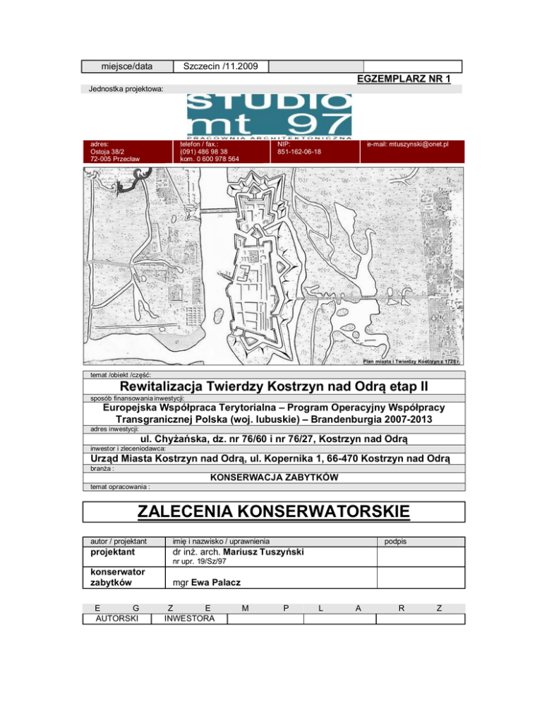 miejsce/data Szczecin /11.2009 EGZEMPLARZ NR 1 Jednostka projektowa: adres: Ostoja 38/2 72-005 Przecław telefon / fax.: (091) 486 98 38 kom. 0 600 978 564 NIP: 851-162-06-18 e-mail: [email protected] Plan miasta i Twierdzy Kostrzyn z 1728 r. temat /obiekt /część: Rewitalizacja Twierdzy Kostrzyn nad Odrą etap II sposób finansowania inwestycji: Europejska Współpraca Terytorialna – Program Operacyjny Współpracy Transgranicznej Polska (woj. lubuskie) – Brandenburgia 2007-2013 adres inwestycji: ul. Chyżańska, dz. nr 76/60 i nr 76/27, Kostrzyn nad Odrą inwestor i zleceniodawca: Urząd Miasta Kostrzyn nad Odrą, ul. Kopernika 1, 66-470 Kostrzyn nad Odrą branża : KONSERWACJA ZABYTKÓW temat opracowania : ZALECENIA KONSERWATORSKIE autor / projektant imię i nazwisko / uprawnienia projektant dr inż. arch. Mariusz Tuszyński podpis nr upr. 19/Sz/97 konserwator zabytków E G AUTORSKI mgr Ewa Palacz Z E INWESTORA M P L A R Z SPIS TREŚCI 1. Przedmiot, zakres i cel opracowania 2. Inwestor i Zleceniodawca 3. Podstawa opracowania i wykorzystane materiały 4. Ogólna koncepcja prac konserwatorskich 5. Prace wstępne (przygotowawcze) 6. Zakres rzeczowy prac konserwatorskich 6.1. Bastion Brandenburgia 6.2. Promenada von Kattego (pomiędzy bastionami Brandenburgia i Filip) 6.3. Bastion Filip z sąsiednimi obiektami i elementami zagospodarowania terenu 7. Część fotograficzna – wybrane zdjęcia z opisem ubytków i uszkodzeń 1. Przedmiot, zakres i cel opracowania Podstawowym przedmiotem opracowania są Bastiony Brandenburgia i Filip, grodza przed bastionem Filip, promenada von Kattego i Brama Chyżańska z mostem wchodzące w skład zespołu fortyfikacji nowożytnych twierdzy Kostrzyn wpisanego do rejestru zabytków pod nr KOK – I – 81/76. Zakres (szczegółowe granice) opracowania przedstawiono w programie funkcjonalnym-przestrzennym dla planowanego zadania pt.: Rewitalizacja Twierdzy Kostrzyn nad Odrą etap II (plansza nr 1) wykonanym w 11.2009 r. przez Pracownię Architektoniczną STUDIO MT’97 w Przecławiu (w posiadaniu Zleceniodawcy). Celem pracy jest ogólne określenie zaleceń (programu robót) konserwatorskich dla w/w zadania. 2. Inwestor i Zleceniodawca Urząd Miasta Kostrzyn nad Odrą, ul. Kopernika 1, 66-470 Kostrzyn nad Odrą. 3. Podstawa opracowania i wykorzystane materiały • Umowa z Inwestorem Nr A-IR/225/2009 z dnia 21.09.2009 r. • Inwentaryzacja wykonana przez BP-R Sp. z o.o. REDAN ze Szczecina z 2004 r. • Wizja lokalna w październiku 2009r. • Materiały archiwalne dot.: Twierdzy Kostrzyn nad Odrą • Konsultacje z WOZU w Zielonej Górze Delegatura Gorzów Wielkopolski w październiku 2009 r. • Opinia Lubuskiego WKZ (pismo znak: ZN-G.421-1/10 (Kos) z dnia 29.01.2010r.) – zatwierdzająca wytyczne konserwatorskie dla planowanej inwestycji, które zawarto w niniejszym opracowaniu (w załączeniu). 4. Ogólna koncepcja prac konserwatorskich Biorąc pod uwagę wartość historyczną, artystyczną oraz użytkową obiektów proponuje się konserwację zachowawczą z elementami rekonstrukcji. Należy przy tym uwzględnić poszanowanie oryginalnej substancji zabytku tj.: historycznych materiałów oraz nawarstwień stylistycznych. 5. Prace wstępne (przygotowawcze) Przed rozpoczęciem prac należy: • Wykonać opis i dokumentację fotograficzną stanu zachowania • Wykonać niezbędne badania: m.in. badania materiałoznawcze (petrograficzne), na zawartości soli. • Opracować szczegółowy program prac konserwatorskich. • Wykonać ekspertyzę konstrukcyjno-budowlaną, oraz inne niezbędne badania wilgotnościowe, geologiczne i hydrotechniczne. • Sprawdzić możliwość założenia izolacji przeciwwilgociowej, wykonać projekt izolacji. W trakcie prowadzenia prac niezbędne będą dodatkowe badania pomagające uszczegółowić ich program. 6. Zakres rzeczowy prac konserwatorskich 6.1. Bastion Brandenburgia Taras Uporządkowanie tarasu bastionu Brandenburgia wraz z usunięciem części nasypu ziemnego i dziko rosnącej roślinności. Schody zewnętrzne Pozostałości schodów na tarasie bastionu Brandenburgia należy zdemontować, oczyścić, zamontować na nowo, uzupełnić o brakujące elementy, uzupełnić ubytki w zachowanych elementach. Po przeprowadzonej naprawie i renowacji schody zabezpieczyć przed zawilgoceniem (zahydrofobizować). Czoło i barki bastionu (mur kurtynowy od strony Odry) − Mur ceglany - lico Należy dokonać dokładnego rozpoznania stanu lica, identyfikacji spękań i odspojeń muru. Lico muru należy zabezpieczyć przez konsolidację, kotwienie. Należy usunąć roślinność wrastającą w mur. Usunąć wtórne uzupełnienia i wyprawy tynkarskie cementowe. Obszary skażone mikrobiologicznie należy poddać dezynfekcji. Zasolone partie muru należy oczyścić z nawarstwień powierzchniowych soli mechanicznie, a następnie odsolić metodą migracji do rozszerzonego środowiska. Wziąć pod uwagę należy partie muru historycznego w sąsiedztwie nowych uzupełnień, szczególnie z użyciem zaprawy cementowej i do wysokości podciągania kapilarnego muru. Zabieg stabilizacji soli- przeprowadzić w nierozpuszczalne związki. Rysy, pęknięcia i rozwarstwienia muru należy wypełnić zaprawą iniekcyjną, która jest porowata, z możliwością doboru kruszywa i szybkości penetracji. Do murów, które nie wymagają wzmocnienia pustek (w tym wzmocnienia konstrukcyjnego) należy użyć materiałów spełniających wymogi WTA. Silnie zdezintegrowane partie muru należy rozebrać i przemurować na nowo używając materiału rozbiórkowego, uzupełniając ewentualnie cegłą, której parametry są zbliżone do cegły historycznej występującej w zabytku. Ubytki w murze należy uzupełnić cegłą rozbiórkową lub nową o zbliżonych parametrach do oryginalnej. Ubytki w cegle powyżej 40 % cegły należy uzupełnić cegłą rozbiórkową lub nową o parametrach zbliżonych do oryginalnych cegieł (szczególnie w kwestii nasiąkliwo