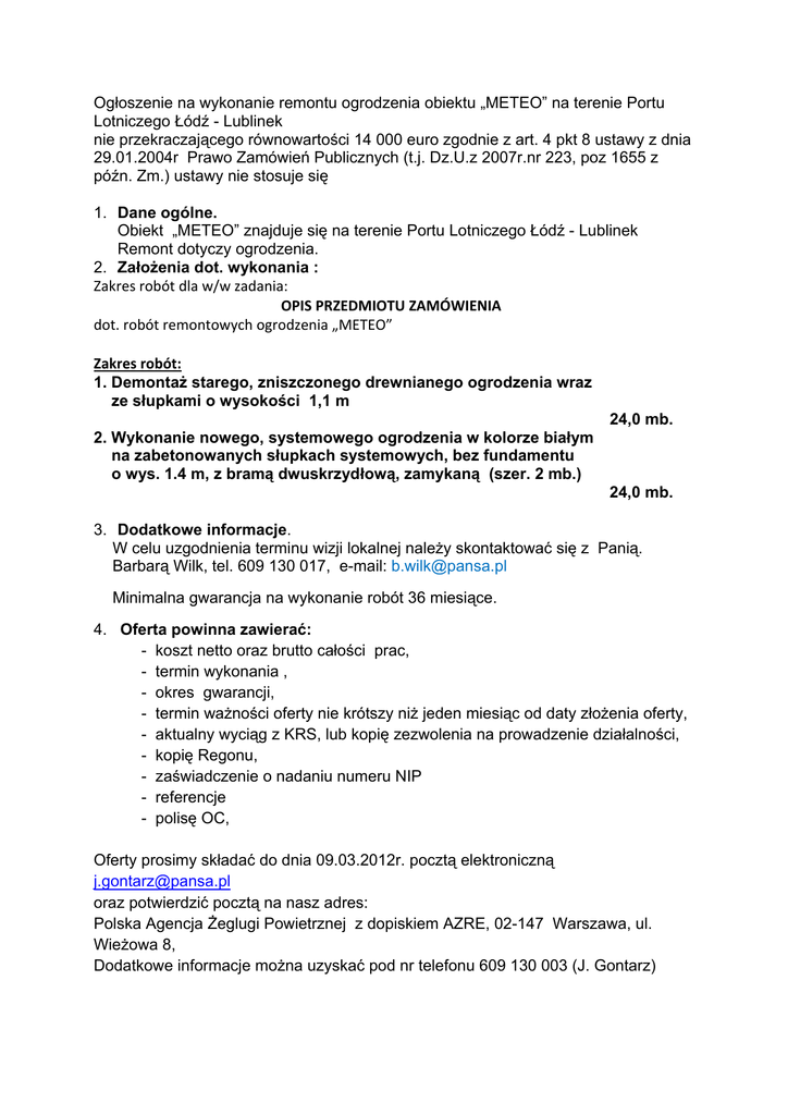 Ogłoszenie na wykonanie remontu ogrodzenia obiektu „METEO” na terenie Portu Lotniczego Łódź - Lublinek nie przekraczającego równowartości 14 000 euro zgodnie z art. 4 pkt 8 ustawy z dnia 29.01.2004r Prawo Zamówień Publicznych (t.j. Dz.U.z 2007r.nr 223, poz 1655 z późn. Zm.) ustawy nie stosuje się 1. Dane ogólne. Obiekt „METEO” znajduje się na terenie Portu Lotniczego Łódź - Lublinek Remont dotyczy ogrodzenia. 2. Założenia dot. wykonania : Zakres robót dla w/w zadania: OPIS PRZEDMIOTU ZAMÓWIENIA dot. robót remontowych ogrodzenia „METEO” Zakres robót: 1. Demontaż starego, zniszczonego drewnianego ogrodzenia wraz ze słupkami o wysokości 1,1 m 24,0 mb. 2. Wykonanie nowego, systemowego ogrodzenia w kolorze białym na zabetonowanych słupkach systemowych, bez fundamentu o wys. 1.4 m, z bramą dwuskrzydłową, zamykaną (szer. 2 mb.) 24,0 mb. 3. Dodatkowe informacje. W celu uzgodnienia terminu wizji lokalnej należy skontaktować się z Panią. Barbarą Wilk, tel. 609 130 017, e-mail: [email protected] Minimalna gwarancja na wykonanie robót 36 miesiące. 4. Oferta powinna zawierać: - koszt netto oraz brutto całości prac, - termin wykonania , - okres gwarancji, - termin ważności oferty nie krótszy niż jeden miesiąc od daty złożenia oferty, - aktualny wyciąg z KRS, lub kopię zezwolenia na prowadzenie działalności, - kopię Regonu, - zaświadczenie o nadaniu numeru NIP - referencje - polisę OC, Oferty prosimy składać do dnia 09.03.2012r. pocztą elektroniczną [email protected] oraz potwierdzić pocztą na nasz adres: Polska Agencja Żeglugi Powietrznej z dopiskiem AZRE, 02-147 Warszawa, ul. Wieżowa 8, Dodatkowe informacje można uzyskać pod nr telefonu 609 130 003 (J. Gontarz)