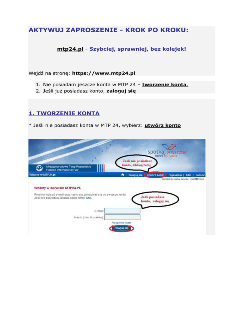 AKTYWUJ ZAPROSZENIE - KROK PO KROKU: mtp24.pl - Szybciej, sprawniej, bez kolejek! Wejdź na stronę: https://www.mtp24.pl 1. Nie posiadam jeszcze konta w MTP 24 – tworzenie konta. 2. Jeśli już posiadasz konto, zaloguj się 1. TWORZENIE KONTA * Jeśli nie posiadasz konta w MTP 24, wybierz: utwórz konto * Przeczytaj i zaakceptuj Regulamin * Wypełnij Formularz * Po kliknięciu na przycisk UTWÓRZ KONTO na podanego przez Państwa maila zostanie wysłany e-mail aktywacyjny. Prosimy o sprawdzenie poczty. Gdyby nie znaleźli Państwo wiadomości z serwisu MTP 24 w skrzynce odbiorczej, prosimy o sprawdzenie folderu SPAM. W automatycznej wiadomości wysłanej przez serwis znajdą Państwo link potwierdzający utworzenie konta. Prosimy o jego kliknięcie. UWAGA! Na jeden adres e-mail istnieje możliwość założenia tylko jednego konta. Jeżeli na stronie pojawia się komunikat: „Użytkownik o podanym adresie email już istnieje w bazie!”, oznacza to, iż na dany adres e-mail zostało już utworzone konto na portalu www.mtp24.pl. W takim przypadku należy wrócić na stronę główną i skorzystaj z opcji „Przypomnij hasło”. Nowe hasło do konta zostanie automatyczne wysłane na podany adres e-mail. * Teraz mogą się Państwo zalogować do serwisu. 2. POSIADAM KONTO – ZALOGUJ SIĘ - AKTYWACJA ZAPROSZENIA: * Jeśli posiadasz już konto w MTP 24, wybierz: zaloguj się * Z listy imprez targowych, wybierz: TTM * Wybierz drugą opcję, aby aktywować zaproszenie * Wypełnij ankietę * Wybierz siebie lub pracownika, podaj kod zaproszenia i aktywuj * Przyjedź na targi z aktywowanym zaproszeniem NIE ZAPOMNIJ ZABRAĆ ZE SOBĄ AKTYWOWANEGO ZAPROSZENIA STANOWI ONO TWÓJ DOKUMENT WSTĘPU NA TARGI! W przypadku pytań lub wątpliwości – prosimy o kontakt: Emilia Kusion tel. 61 869 20 39 e-mail: [email protected]