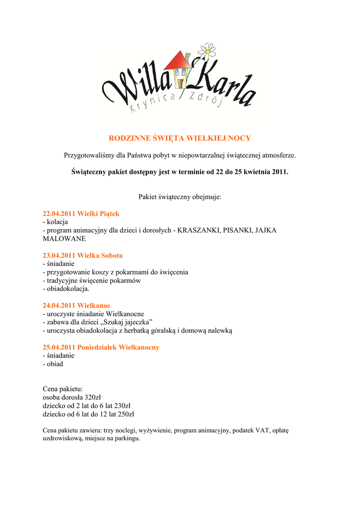 RODZINNE ŚWIĘTA WIELKIEJ NOCY Przygotowaliśmy dla Państwa pobyt w niepowtarzalnej świątecznej atmosferze. Świąteczny pakiet dostępny jest w terminie od 22 do 25 kwietnia 2011. Pakiet świąteczny obejmuje: 22.04.2011 Wielki Piątek - kolacja - program animacyjny dla dzieci i dorosłych - KRASZANKI, PISANKI, JAJKA MALOWANE 23.04.2011 Wielka Sobota - śniadanie - przygotowanie koszy z pokarmami do święcenia - tradycyjne święcenie pokarmów - obiadokolacja. 24.04.2011 Wielkanoc - uroczyste śniadanie Wielkanocne - zabawa dla dzieci „Szukaj jajeczka” - uroczysta obiadokolacja z herbatką góralską i domową nalewką 25.04.2011 Poniedziałek Wielkanocny - śniadanie - obiad Cena pakietu: osoba dorosła 320zł dziecko od 2 lat do 6 lat 230zł dziecko od 6 lat do 12 lat 250zł Cena pakietu zawiera: trzy noclegi, wyżywienie, program animacyjny, podatek VAT, opłatę uzdrowiskową, miejsce na parkingu.
