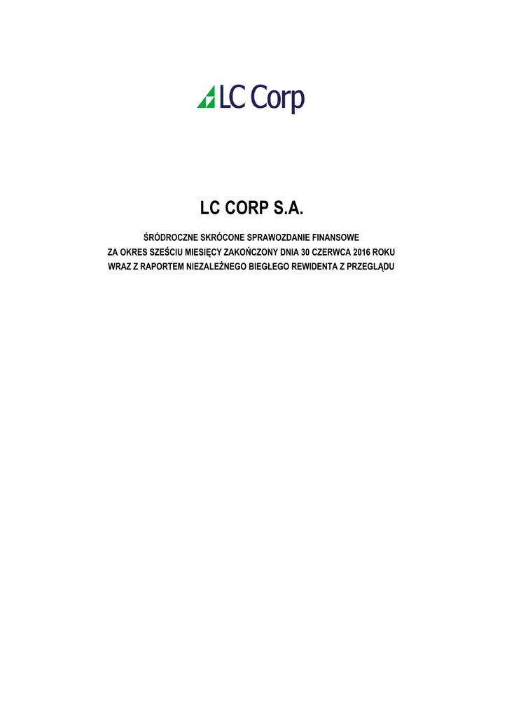 LC CORP S.A. ŚRÓDROCZNE SKRÓCONE SPRAWOZDANIE FINANSOWE ZA OKRES SZEŚCIU MIESIĘCY ZAKOŃCZONY DNIA 30 CZERWCA 2016 ROKU WRAZ Z RAPORTEM NIEZALEŻNEGO BIEGŁEGO REWIDENTA Z PRZEGLĄDU LC Corp S.A. Śródroczne skrócone sprawozdanie finansowe za okres 6 miesięcy zakończony 30 czerwca 2016 roku (w tysiącach złotych) Śródroczne skrócone sprawozdanie z sytuacji finansowej……………………………………………………………… 3 Śródroczne skrócone sprawozdanie z całkowitych dochodów………………………………………………………….. 4 Śródroczne skrócone sprawozdanie z przepływów pieniężnych……………………………………………………….. 5 Śródroczne skrócone sprawozdanie ze zmian w kapitale własnym……………………………………………………. 6 Zasady (polityka) rachunkowości oraz Dodatkowe noty objaśniające…………………………………………………. 8 1. Informacje ogólne………………… .......................................................................................................................... 8 2. Identyfikacja śródrocznego skróconego skonsolidowanego sprawozdania finansowego....................................... 8 3. Inwestycje Spółki .................................................................................................................................................... 8 4. Podstawa sporządzenia śródrocznego skróconego sprawozdania finansowego ................................................. 10 5. Zasady rachunkowości przyjęte przy sporządzaniu śródrocznego skróconego sprawozdania finansowego .......... 10 6. Nowe standardy i interpretacje, które zostały opublikowane, a nie weszły jeszcze w życie..................................... 11 7. Istotne wartości oparte na profesjonalnym osądzie i szacunkach ........................................................................... 11 Niepewność szacunków ........................................................................................................................................ 12 8. Sezonowość lub cykliczność w działalności ......................................................................................................... 13 9. Informacje dotyczące segmentów działalności ..................................................................................................... 13 10. Podatek dochodowy ............................................................................................................................................. 14 10.1. Obciążenie podatkowe ............................................................................................................................. 14 10.2. Uzgodnienie efektywnej stawki podatkowej ............................................................................................. 14 10.3. Odroczony podatek dochodowy ............................................................................................................... 15 11. Rzeczowe aktywa trwałe....................................................................................................................................... 15 12. Inwestycje długoterminowe ................................................................................................................................... 16 13. Pożyczki i należności długoterminowe.................................................................................................................. 17 14. Krótkoterminowe aktywa finansowe...................................................................................................................... 17 15. Zapasy .................................................................................................................................................................. 17 16. Należności z tytułu dostaw i usług oraz pozostałe należności .............................................................................. 18 17. Środki pieniężne i ich ekwiwalenty........................................................................................................................ 19 18. Kapitały ................................................................................................................................................................. 19 18.1. Kapitał podstawowy .................................................................................................................................. 19 18.2. Kapitał zapasowy ..................................................................................................................................... 20 18.3. Pozostałe kapitały rezerwowe .................................................................................................................. 21 18.4. Pozostałe kapitały .................................................................................................................................... 21 19. Zobowiązania finansowe....................................................................................................................................... 21 19.1. Oprocentowane kredyty bankowe i obligacje ........................................................................................... 21 19.2. Emisja, wykup kapitałowych papierów wartościowych ............................................................................. 23 19.3. Zaciągnięcie, spłaty kredytów bankowych i pożyczek .............................................................................. 23 19.4. Zobowiązania z tytułu nabycia jednostki zależnej .................................................................................... 23 20. Rezerwy ................................................................................................................................................................ 23 21. Zabezpieczenia ......................