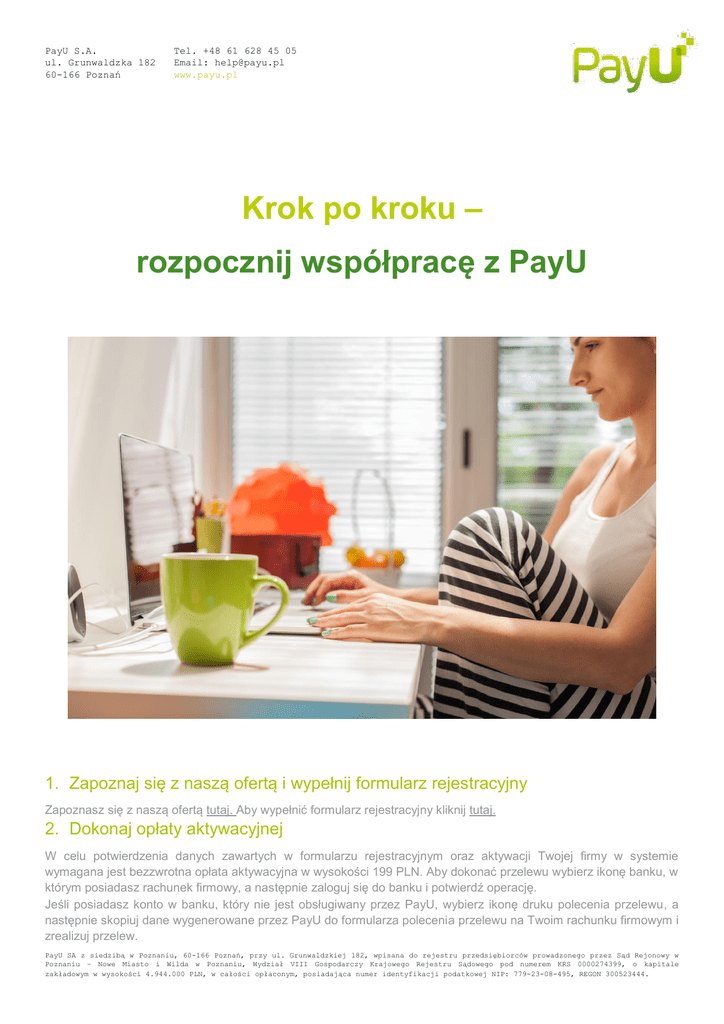 PayU S.A. ul. Grunwaldzka 182 60-166 Poznań Tel. +48 61 628 45 05 Email: [email protected] www.payu.pl Krok po kroku – rozpocznij współpracę z PayU 1. Zapoznaj się z naszą ofertą i wypełnij formularz rejestracyjny Zapoznasz się z naszą ofertą tutaj. Aby wypełnić formularz rejestracyjny kliknij tutaj. 2. Dokonaj opłaty aktywacyjnej W celu potwierdzenia danych zawartych w formularzu rejestracyjnym oraz aktywacji Twojej firmy w systemie wymagana jest bezzwrotna opłata aktywacyjna w wysokości 199 PLN. Aby dokonać przelewu wybierz ikonę banku, w którym posiadasz rachunek firmowy, a następnie zaloguj się do banku i potwierdź operację. Jeśli posiadasz konto w banku, który nie jest obsługiwany przez PayU, wybierz ikonę druku polecenia przelewu, a następnie skopiuj dane wygenerowane przez PayU do formularza polecenia przelewu na Twoim rachunku firmowym i zrealizuj przelew. PayU SA z siedzibą w Poznaniu, 60-166 Poznań, przy ul. Grunwaldzkiej 182, wpisana do rejestru przedsiębiorców prowadzonego przez Sąd Rejonowy w Poznaniu – Nowe Miasto i Wilda w Poznaniu, Wydział VIII Gospodarczy Krajowego Rejestru Sądowego pod numerem KRS 0000274399, o kapitale zakładowym w wysokości 4.944.000 PLN, w całości opłaconym, posiadająca numer identyfikacji podatkowej NIP: 779-23-08-495, REGON 300523444. PayU S.A. ul. Grunwaldzka 182 60-166 Poznań Tel. +48 61 628 45 05 Email: [email protected] www.payu.pl Pamiętaj: opłata musi być dokonana z rachunku bankowego, który podałeś w formularzu rejestracyjnym. W każdym innym przypadku rejestracja będzie niepotwierdzona i zostaniesz poproszony o ponowne dokonanie przelewu. Po otrzymaniu przelewu weryfikacyjnego przez PayU, strona Twojego serwisu zostanie wstępnie zweryfikowana pod kątem wymagań jakie musi spełniać sklep internetowy. Zbiór wymagań znajdziesz w „Przewodniku po elementach strony” klikając tutaj. Jeśli chcesz przyspieszyć nawiązanie współpracy zadbaj, aby strona zawierała wszystkie wspomniane w tym dokumencie elementy. Dane do zalogowania się do Panelu Menedżerskiego PayU otrzymasz drogą mailową. 3. Wyślij dokumenty rejestrowe firmy, jeśli nie dodałeś ich w procesie rejestracji Jeśli nie zrobiłeś tego wcześniej, dokumenty należy przesłać na adres [email protected], wpisując w tytule maila pełną nazwę Twojej firmy: skan zaświadczenia o nadaniu nr NIP, skan zaświadczenia o nadaniu nr REGON, skan wpisu do Ewidencji Działalności Gospodarczej lub link do wpisu CEIDG (lub dla spółek: skan KRS-u nie starszy niż trzy miesiące lub umowa spółki cywilnej), skan dowodu osobistego lub paszportu właściciela firmy i/lub osoby/osób upoważnionych do podpisania umowy Pamiętaj: umowa może być przygotowywana tylko dla serwisów, których strona www działa, jest dostępna online i można ją zweryfikować. Weryfikacja polega na sprawdzeniu zawartości strony pod względem wymagań określonych w Przewodniku po elementach strony dostępnym tutaj . 4. Skonfiguruj sklep w Panelu Menadżerskim Do prawidłowego działania płatności online niezbędne jest skonfigurowanie sklepu oraz punktu płatności w Panelu Menadżerskim PayU. Po zalogowaniu do Panelu należy kliknąć przycisk ‘Płatności elektroniczne’, a następnie ‘Moje sklepy’. W dalszej kolejności kliknij przycisk ‘Dodaj sklep’ oraz wybierz z listy jeden z adresów stron podanych w formularzu rejestracyjnym i nadaj sklepowi nazwę. Sugerujemy, aby była ona tożsama z adresem www strony. Następnie zdefiniuj punkt płatności. Uzupełnij pozostałe pola oraz wybierz przycisk ‘Dodaj sklep’. Pamiętaj: dodanie punktu płatności jest niezbędne do prawidłowego odbioru płatności. Jeśli sklep został dodany przez firmę, której zleciłeś techniczne wdrożenie systemu PayU, upewnij się, że został również skonfigurowany punkt płatności - klikając w link „Punkty płatności” znajdujący się w zakładce ‘Płatności elektroniczne’ w ‘Moje sklepy’. 5. Przyjmuj płatności Od tego momentu możesz przyjmować płatności online i zarządzać transakcjami w Panelu Menadżerskim. Życzymy wielu udanych transakcji! PayU SA z siedzibą w Poznaniu, 60-166 Poznań, przy ul. Grunwaldzkiej 182, wpisana do rejestru przedsiębiorców prowadzonego przez Sąd Rejonowy w Poznaniu – Nowe Miasto i Wilda w Poznaniu, Wydział VIII Gospodarczy Krajowego Rejestru Sądowego pod numerem KRS 0000274399, o kapitale zakładowym w wysokości 4.944.000 PLN, w całości opłaconym, posiadająca numer identyfikacji podatkowej NIP: 779-23-08-495, REGON 300523444. PayU S.A. ul. Grunwaldzka 182 60-166 Poznań Tel. +48 61 628 45 05 Email: [email protected] www.payu.pl Przydatne linki: Przewodnik po elementach strony: https://www.payu.pl/system/files_force/przewodnik_po_elementach_strony_0.pdf?download=1 Pierwsze kroki po rozpoczęciu współpracy: https://www.payu.pl/system/files_force/payu_pierwsze_kroki.pdf?download=1 Dokumentacja techniczna: http://developers.payu.com/pl/ Wnioski, oświadczenia, regulaminy oraz inne dokumenty: https://www.payu.pl/pliki-do-pobrania PayU SA z siedzibą w Poznaniu, 60-166 Poznań, przy ul. Grunwaldzkiej 182, wpisana do rejestru przedsiębiorców prowadzonego przez Sąd Rejonowy w Poznaniu – Nowe Miasto i Wilda w Poznaniu, Wydział VIII Gospodarczy Krajowego Rejestru Sądowego pod numerem KRS 0000274399, o kapitale zakładowym w wysokości 4.944.000 PLN, w całości opłaconym, posiadająca numer identyfikacji podatkowej NIP: 779-23-08-495, REGON 300523444.