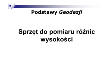 Podstawy Geodezji Sprzęt do pomiaru różnic wysokości mgr inż. Geodeta Tomasz Miszczak e-mail: [email protected] Niwelatory Niwelator jest to instrument geodezyjny umożliwiający wykonywanie pomiarów różnic wysokości pomiędzy punktami terenowymi Części niwelatora Podstawowe części niwelatora optycznego to: - spodarka, - alidada, - luneta, -libela niwelacyjna lub kompensator (w niwelatorach automatycznych), - libela okrągła. Osie główne niwelatora - oś obrotu instrumentu – v, - oś celowa lunety – c, - oś główna libeli niwelacyjnej – l (w niwelatorach libelowych), - płaszczyzna główna libeli okrągłej – Q. Warunki geometryczne Realizacja warunków geometrycznych wynikających z konstrukcji niwelatora zapewnia prawidłowe jego działanie. Warunki geometryczne niwelatora libelowego: prostopadłość osi głównej libeli niwelacyjnej do osi obrotu instrumentu, prostopadłość płaszczyzny głównej libeli okrągłej do osi obrotu instrumentu, równoległość osi głównej libeli niwelacyjnej i osi celowej lunety (w płaszczyźnie poziomej i pionowej), pozioma kreska siatki kresek powinna być prostopadła do osi obrotu instrumentu. Dokładność niwelatorów Klasa niwelatora Dokładność w mm/km Dokładność poziomowania osi celowej Powiększenie lunety precyzyjny ≤± 1 mm/km ± 0,2" »40» techniczny ± 2,5 mm/km 0,5"-1" 25 - 30x budowlany ±8 mm/km ±7-10" ≤20x Podział niwelatorów Pod względem konstrukcji dzielimy na: niwelatory libelowe, których oś celowa jest poziomowana ręcznie, na podstawie obserwacji wskazań libeli niwelacyjnej, niwelatory automatyczne optyczne – oś celowa jest poziomowana automatycznie za pomocą kompensatora, a odczyt wykonywany jest przez obserwatora dokonującego szacowania położenia kreski poziomej na tle podziału łaty, niwelatory automatyczne cyfrowe – oś celowa jest poziomowana automatycznie za pomocą kompensatora,, a odczyt na łacie, wyposażonej w kod paskowy jest samoczynnie wykonywany przez instrument i wyświetlany w postaci cyfrowej, niwelatory laserowe, które realizują płaszczyznę poziomą przez generowanie obrotowej wiązki światła laserowego. Pomocniczy sprzęt niwelacyjny Łaty niwelacyjne-przymiary sztywne (drewniane bądź aluminiowe) służące do wyznaczenia odległości pionowych pomiędzy niwelowanymi punktami, a płaszczyzną poziomą wyznaczoną przez oś celową niwelatora, statyw, libele okrągłe (pudełkowe), żabki niwelacyjne (trójkątna lub okrągła podstawa zaopatrzona w zaokrąglony trzpień, na którym ustawia się łatę). Wykonanie odczytów z łat niwelacyjnych Łata niwelacyjna jest najczęściej wykonana z drewna lub z aluminium o przekroju prostokątnym. Łata ma naniesiony opis, umożliwiający wykonanie odczytu, czyli dokładne określenie odległości pionowej od stopy łaty do punktu, przez który przechodzi pozioma oś celowa lunety niwelatora. Łatę niwelacyjną ustawiamy na bolcu (trzpieniu) żabki niwelacyjnej w pozycji pionowej. Do ustawienia łaty w pionie wykorzystuje się libelę, zazwyczaj zamontowaną na stałe na korpusie łaty. Przed wykonaniem odczytu z łaty niwelacyjnej należy: 1) spoziomować niwelator, 2) ustawić ostrość krzyża kresek, 3) wycelować na łatę, 4) ustawić ostrość obrazu celu, 5) wykonać odczyt z łaty. Wykonanie odczytu polega na oszacowaniu położenia kreski poziomej krzyża kresek na tle podziału widocznego na obrazie łaty. Obliczenie różnicy wysokości W celu określenia przewyższenia jako różnicy wysokości ∆h pomiędzy punktami A i B należy dokonać odczytów z łat Ot i Op. B Jak widać Ot = ∆h + Op Stąd ∆h = Ot - Op A Pytania sprawdzające Jakie zastosowanie w pomiarach geodezyjnych mają niwelatory? Jakie znasz rodzaje niwelatorów, jeżeli za kryterium podziału przyjmiesz sposób wyznaczania płaszczyzny poziomej? Jakie znasz rodzaje niwelatorów, jeżeli za kryterium podziału przyjmiesz osiągane dokładności? Jakie są podstawowe części niwelatora? Jakie osie występują w niwelatorze? Jakie warunki geometryczne musi spełniać prawidłowo działający niwelator automatyczny? Do czego służy kompensator w niwelatorze? Co określa termin niwelator automatyczny? Jakie znasz rodzaje nowoczesnych niwelatorów? Jakie przybory i instrumenty zaliczysz do sprzętu niwelacyjnego? W jaki sposób określamy różnicę wysokości pomiędzy dwoma punktami?