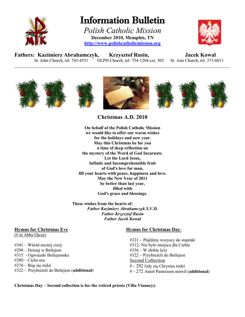 Information Bulletin Polish Catholic Mission December 2010, Memphis, TN http://www.polishcatholicmission.org Fathers: Kazimierz Abrahamczyk, Krzysztof Rusin, Jacek Kowal St. John Church, tel: 743-4551 OLPH Church, tel: 754-1204 ext. 303 St. Ann Church, tel: 373-6011 __________________________________________________________________________________________________ Christmas A.D. 2010 On behalf of the Polish Catholic Mission we would like to offer our warm wishes for the holidays and new year. May this Christmas be for you a time of deep reflection on the mystery of the Word of God Incarnate. Let the Lord Jesus, Infinite and Incomprehensible fruit of God's love for man, fill your hearts with peace, happiness and love. May the New Year of 2011 be better than last year, filled with God's grace and blessings. These wishes from the hearts of: Father Kazimierz Abrahamczyk S.V.D. Father Krzysztof Rusin Father Jacek Kowal Hymns for Christmas Eve Hymns for Christmas Day: (# in Abba Ojcze) #341 – Wśród nocnej ciszy #290 – Dzisiaj w Betlejem #315 - Ogwiazdo Betlejemska #280 – Cicha noc #276 – Bóg się rodzi #322 - Przybieżeli do Betlejem (additional) #321 - Pójdźmy wszyscy do stajenki #312- Nie było miejsca dla Ciebie #336 – W żłobie leży #322 – Przybieżeli do Betlejem Second Collection # - 292 Gdy się Chrystus rodzi # - 272 Anioł Pasterzom mówił (additional) Christmas Day – Second collection is for the retired priests (Villa Vianney). Christmas Day Mass 1:00 p.m. On Christmas Day, Holy Mass will be held, the 25th of December (Saturday), at 1:00 p.m., at St. Ann church on Stage Rd. in Bartlett (St. John Chapel). The second collection that day will be to help the retired priests of our diocese in Memphis. After Holy Mass, we invite everyone to the reception hall under the chapel for cake and coffee as well as breaking the traditional wafer- “Opłatek”. We cordially invite you to participate as well as bringing from home baked goods for the reception table. Church fair at St. John Church – December 26 (Sunday) Father Kazimierz cordially invites everyone to participate in the Polish-American Holy Mass on Sunday, December 26, 12 noon, at St. John Church (Lamar Ave.). Fr. Kazimierz invites everyone immediately after Holy Mass to the celebration at St. John's, during which there will be a small wine tasting event. We ask you to bring cakes, cookies or fruit for the reception table. Cordially we invite you! Holy Mass for New Year's – January 8 (Saturday) First Polish Holy Mass of the New Year 2011 – we cordially invite everyone to participate on Saturday, January 8 at 6:30 p.m. at St. John Church (Lamar Ave.). Immediately after Mass ( St. Jude Hall) we invite everyone for coffee and cake and also a sing-along of our beautiful Christmas carols. We ask that you bring a cake, dessert or some fruit to the sing-along for the dessert table. Cordially we invite you !!!! Traditional "Caroling" that is, Pastoral Visit Anyone who would like to open the doors of their home and invite our priests for the traditional Christmas time visits, we ask that you make telephone arrangements directly with Father Kasimierz, Father Krzysztof or Father Jacek. Their telephone numbers can be found at the top of this bulletin. 40th Anniversary of the Diocese of Memphis Father Kazimierz invites all Polish people to participate in the Holy Mass that will be celebrated by Bishop J. Terry Steib, S.V.D. for the 40th anniversary of the Diocese of Memphis. The Mass will take place in the Cathedral, 1695 Central Ave. on Thursday, the 6th of January at 6:30 p.m. We ask anyone who has regional Polish dress to wear your outfits as a part of the Diocesan cultural corner.