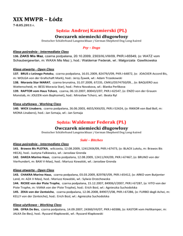XIX MWPR – Łódz 7-8.05.2011 r. Sędzia: Andrzej Kazmierski (PL) Owczarek niemiecki długowłosy Deutscher Schäferhund Langstockhaar / German Shepherd Dog Long-haired Psy – Dogs Klasa pośrednia - Intermediate Class 136. ZAKS Mis Maz, czarna podpalana, 20.10.2009, 2303/XLVIII/09, PKR.I-65549, (o: WATZ vom Schaubergewrlan, m: WAXA Mis Maz ), hod.: Waldemar Federak, wł.: Małgorzata Gawlikowska Klasa otwarta - Open Class 137. BRUS z Leśnego Potoku, czarna podpalana, 16.01.2009, 82479/I/09, PKR.I-64872, (o: JOACKER Accord Bis, m: WOLGA von der Grafschaft Mark), hod.: Jerzy Żywek, wł.: Adam Trzaskowski 138. Moravia Star MARAT, czarno brunatna, 31.07.2009, 67235, CMKU/DS74750/09, , (o: BAQUERO aus Wattenscheid, m: BESS Moravia Star), hod.: Petra Novakova, wł.: Blanka Perlikova 139. RAPTOR vom Haus Tchorz, czarna, 06.10.2007, 80043/I/07, PKR.I-62547, (o: ENZO von der Grauen Monstab, m: JOLEEN vom Baphomet), hod.: Mirosław Tchorz, wł.: Beata Ryl Klasa użytkowa - Working Class 140. WICK Linabero, czarna podpalana, 26.06.2003, 4655/XXX/03, PKR.I-52424, (o: RIKKOR von Bad Boll, m: MONA Linabero), hod.: Jan Szmaja, wł.: Jan Szmaja Sędzia: Waldemar Federak (PL) Owczarek niemiecki długowłosy Deutscher Schäferhund Langstockhaar / German Shepherd Dog Long-haired Suki – Bitches Klasa pośrednia - Intermediate Class 141. Brawos Bis PLOTKA, wilczasta, 12.08.2009, 12412XIX/09, PKR.I-67473, (o: BLACK Lutolu, m: Brawos Bis HECA), hod.: Justyna Falkiewicz, wł.: Jarosław Grenda 142. DARZA Marino Haus, czarna podpalana, 12.08.2009, 12411/XIX/09, PKR.I-67467, (o: BRUNO von der Vierhundert, m: BAXI V-Max), hod.: Mariusz Kowalski, wł.: Jarosław Grenda Klasa otwarta - Open Class 143. CHAKRA Marino Haus, czarna podpalana, 03.03.2009, 82978/I/09, PKR.I-65412, (o: ARKO vom Butjenter Land, m: AZA V-Max), hod.: Mariusz Kowalski, wł.: Sylwia Orzechowska 144. RICKIE von der Piste Trophe, czarna podpalana, 15.12.2007, 84906/I/2007, PKR.I-67287, (o: VITO von der Piste Trophe, m: VIANA von der Piste Trophe), hod.: Erich Bosl, wł.: Agnieszka Suchodolska 145. ZEKA von der Zenteiche, czarna podpalana, 12.06.2008, 84907/I/08, PKR.I-67286, (o: FURBO degli Achei, m: KELLY von der Zenteiche), hod.: Erich Bosl, wł.: Agnieszka Suchodolska Klasa użytkowa - Working Class 146. OFRA De Bes, czarna podpalana, 14.09.2007, 24360/VII/07, PKR.I-60386, (o: KASTOR vom Holtkamper, m: JALKA De-Bes), hod.: Ryszard Kłapkowski, wł.: Ryszard Kłapkowski Sędzia: Andrzej Kazmierski (PL) Owczarek niemiecki krótkowłosy Deutscher Schäferhund Stockhaar / German Shepherd Dog Short-haire Psy – Dogs Klasa baby - Baby Class 147. OSKAR Szenberg, czarna podpalana, 03.01.2011, 26330/VII/2011, w przygotowaniu, (o: ARON Szenberg, m: JOOPY Szenberg), hod.: Wiktor Kowalski, wł.: Wiktor i Svetlana Kowalscy Klasa szczeniąt - Puppy Class 148. OLIMP Woj-Bas, czarna podpalana, 18.09.2010, 33843/XXII/10, w przygotowaniu, (o: GECK di Casa Mibili, m: FANTA Woj-Bas), hod.: Wojciech Pustelnik, wł.: Karolina Kubiak, Wojciech Pustelnik Klasa młodzieży - Junior Class 149. DAX Ontopus, czarna podpalana, 14.05.2010, 33416/XXII/10, PKR.I-66-507, (o: DUX v.der Glockenheide, m: MAUSI ze Skalnego Wzgórza), hod.: Robert Rubacha, wł.: Anna Grzelak 150. FANTO z Borówna, czarna podpalana, 11.07.2010, 7954/XX/10, PKR.I-66877, (o: VEGAS du Haut Mansard, m: VIVIEN Nove Kasio), hod.: Joanna Filipecka, wł.: Joanna Filipecka 151. ILBO Wolf Jar, czarna podpalana, 02.01.2010, 3678/XI/10, PKR.I-65429, (o: PEAR von Hassenborn, m: BESI Wolf Jar), hod.: Marek Zgorzelski, wł.: Artur Figiel 152. UWER Germanius Ortus, czarna podpalana, 01.03.2010, 33727/XXII/10, w przygotowaniu, (o: XANO von der Freiheit Westerholt, m: LANA vom Farbenspiel), hod.: Bogusław Chmiel, wł.: Elżbieta i Tadeusz Stępniak Klasa pośrednia - Intermediate Class 153. BAX z Leśnego Justynowa, czarna podpalana, 02.09.2009, 33026/XXII/09, PKR.I-65274, (o: VANOS van Noort, m: DONA Scania), hod.: Sylwester Lisowski, wł.: Sylwester Lisowski 154. ENRICO vom Klostermoor, czarna podpalana, 02.08.2009, 11976/XIX.09, PKR.I-65029, (o: USTINOW vom Romerland, m: HANNI von der Waldgraben), hod.: Bernhard Norda, wł.: Krzysztof Wysocki 155. FALK vom Friendlander, czarna podpalana, 12.08.2009, 33211/XXI/09, PKR.I-65780, (o: AIKO vom Friendlander, m: DEISTRA vom Trafalga), hod.: Axel Oehemke, wł.: Krzysztof Kowalczyk 156. NAZIR ze Skalnego Wzgórza, czarna podpalana, 08.102009, 32959/XXI/09, PKR.I-65132, (o: OBER von Bad Boll, m: DELI ze Skalnego Wzgórza), hod.: Gertruda Jureczko, wł.: Paweł Krych Klasa otwarta - Open Class 157. ERIK vom Friendlander, czarna podpalana, 01.01.2009, 1994/XXXVII/11, PKR.I-67168, (o: NORIK dei Colli Storici, m: DEISTRA vom Trafalga), hod.: Axel Oehemke, wł.: Dariusz Piekarski Klasa użytkowa - Working Class 158. Haker Equus, czarna podpalana, 31.122007, 7596/XX/07, PKR.I-61560, (o: RICO vom Altenberger Land, m: FARINA Equus), hod.: Aneta Bilińska, wł.: Joanna Filipecka 159. LUTER z Zacisza, czarna podpalana, 25.02.2009, 20062/XII/09, PKR.I-64804, (o: SANTOS Kamienna Twierdza, m: ELZA z Zacisza), hod.: Stefan Piątkowski, wł.: Mariusz Piątkowski 160. RAPTORS Asarko Lordana, czarna podpalana, 24.05.2007, 5596/XXX/07, PKR.I-61158, (o: PAKROS D'Ulmental, m: RA Asarko Lordana), hod.: Grzegorz Okrasa, wł.: Grzegorz, Piotr Pilc 161. VAX Artrox, czarna podpalana, 18.10.2007, 6491/XXIX/07, PKR.I-60861, (o: VEGAS du Haus Mansard, m: KSANDI V-Max), hod.: Artur Dąbrowski, wł.: Stanisław Pełka Sędzia: Waldemar Federak (PL) Owczarek niemiecki krótkowłosy Deutscher Schäferhund Stockhaar / German Shepherd Dog Short-haire Suki – Bitches Klasa baby - Baby Class 162. CUMA z Leśnego Justynowa, czarna podpalana, 19.11.2010, 33759/XXII/10, w przygotowaniu, (o: VEGAS du Haus Mansard, m: DONA Skania), hod.: Sylwester Lisowski, wł.: Mateusz Dranicki 163. ENOLA z Hetmańskiej Sfory, wilczasta, 03.01.2011, 33793/XXI/11, w przygotowaniu, (o: UMBERTO Tensor, m: PEDROLA z Hetm