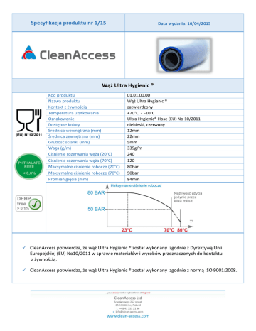 Specyfikacja produktu nr 1/15 Data wydania: 16/04/2015 Wąż Ultra Hygienic ® Kod produktu Nazwa produktu Kontakt z żywnością Temperatura użytkowania Oznakowanie Dostępne kolory Średnica wewnętrzna (mm) Średnica zewnętrzna (mm) Grubość ścianki (mm) Waga (g/m) Ciśnienie rozerwania węża (20°C) Ciśnienie rozerwania węża (70°C) Maksymalne ciśnienie robocze (20°C) Maksymalne ciśnienie robocze (70°C) Promień gięcia (mm) 01.01.00.00 Wąż Ultra Hygienic ® zatwierdzony +70°C - -10°C Ultra Hygienic® Hose (EU) No 10/2011 niebieski, czerwony 12mm 22mm 5mm 335g/m 240 120 80bar 50bar 84mm CleanAccess potwierdza, że wąż Ultra Hygienic ® został wykonany zgodnie z Dyrektywą Unii Europejskiej (EU) No10/2011 w sprawie materiałów i wyrobów przeznaczonych do kontaktu z żywnością. CleanAccess potwierdza, że wąż Ultra Hygienic ® został wykonany zgodnie z normą ISO 9001:2008. Struktura węża Pakowanie Jednostka Wymiary Waga Dłuść węża Krążki Europaleta 120cmx80cmx190cm brutto około 392kg netto 1400m 14 szt.