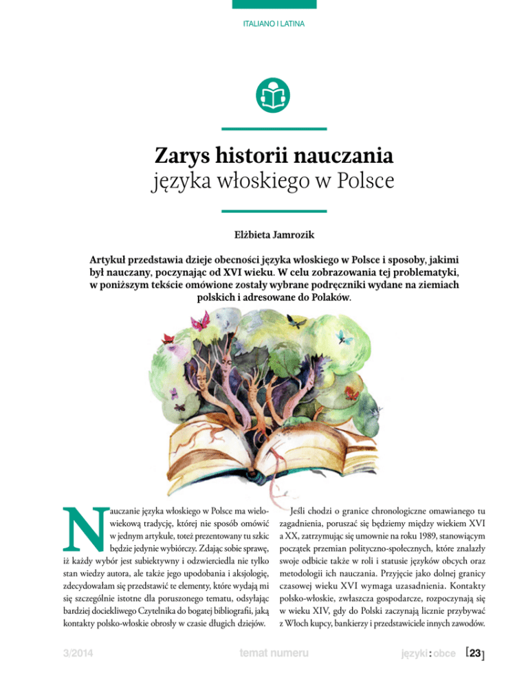 ITALIANO I LATINA Zarys historii nauczania języka włoskiego w Polsce Elżbieta Jamrozik Artykuł przedstawia dzieje obecności języka włoskiego w Polsce i sposoby, jakimi był nauczany, poczynając od XVI wieku. W celu zobrazowania tej problematyki, w poniższym tekście omówione zostały wybrane podręczniki wydane na ziemiach polskich i adresowane do Polaków. N auczanie języka włoskiego w Polsce ma wielowiekową tradycję, której nie sposób omówić w jednym artykule, toteż prezentowany tu szkic będzie jedynie wybiórczy. Zdając sobie sprawę, iż każdy wybór jest subiektywny i odzwierciedla nie tylko stan wiedzy autora, ale także jego upodobania i aksjologię, zdecydowałam się przedstawić te elementy, które wydają mi się szczególnie istotne dla poruszonego tematu, odsyłając bardziej dociekliwego Czytelnika do bogatej bibliografii, jaką kontakty polsko-włoskie obrosły w czasie długich dziejów. 3/2014 Jeśli chodzi o granice chronologiczne omawianego tu zagadnienia, poruszać się będziemy między wiekiem XVI a XX, zatrzymując się umownie na roku 1989, stanowiącym początek przemian polityczno-społecznych, które znalazły swoje odbicie także w roli i statusie języków obcych oraz metodologii ich nauczania. Przyjęcie jako dolnej granicy czasowej wieku XVI wymaga uzasadnienia. Kontakty polsko-włoskie, zwłaszcza gospodarcze, rozpoczynają się w wieku XIV, gdy do Polski zaczynają licznie przybywać z Włoch kupcy, bankierzy i przedstawiciele innych zawodów. temat numeru [ 23 ] ITALIANO I LATINA Natomiast właśnie wiek XVI jest swoistym „złotym wiekiem” Włoch w Europie, naznaczonym nie tylko rozkwitem sztuk pięknych, ale także ekspansją ekonomiczną. Prestiż ten uwidacznia się silnymi wpływami językowymi: w tym okresie język włoski zaznacza trwale swój ślad w takich językach, jak francuski, niemiecki czy angielski, wnosząc do ich dziedzictwa leksykalnego terminologię z zakresu muzyki, architektury i sztuk pięknych (Stammerjohann 2008). W Polsce dodatkowym czynnikiem decydującym o roli języka włoskiego są względy polityczne: gdy w 1518 r. Zygmunt Jagiellończyk poślubia włoską księżniczkę Bonę Sforzę, rodacy królowej tłumnie przybywają na dwór królewski, umacniając status społeczny Włochów w Krakowie. Tak więc u źródeł prestiżu języka włoskiego w Polsce w XVI wieku leży, z jednej strony – aspekt kulturowy, paneuropejski, wyznaczany fascynacją włoską sztuką i architekturą oraz podróżami do Włoch przedstawicieli szlachty i mieszczaństwa1, z drugiej zaś strony – sytuacja wewnętrzna określana obecnością w kraju i na dworze królewskim licznej grupy Włochów. Polacy ich albo podziwiali, albo krytykowali, jedno jest pewne: nikt wobec przedstawicieli tego narodu nie pozostawał obojętny. Fascynację tę potwierdzają liczne świadectwa pisemne z tego okresu: na znajomość języka włoskiego w wyższych warstwach społeczeństwa (wśród „wytworniejszych Polaków”) zwraca uwagę zarówno szesnastowieczny historyk Marcin Kromer2, jak i nuncjusz apostolski Mons. Fulvio Ruggieri3. Jak istotna w tym okresie wydawała się znajomość nie tylko łaciny, powszechnej w komunikacji międzynarodowej, ale także języków tych nacji, z którymi Rzeczpospolita utrzymywała 1 Odnośnie do relacji polsko-włoskich w tym tak istotnym dla rozwoju kontaktów językowych okresie możemy odesłać Czytelnika do kilku pozycji literatury historycznokulturowej: H. Barycz (1965), A. Sajkowski (1973), T. Ulewicz (1999), W. Tygielski (2005). 2 Penetrarunt et Itali mercatores atque opifices in urbas primarias nostra fere memoriał, estque nunnullus eius linguae usus etami apud Polonos elegantiores, libenter enim ii peregrinantur in Italia (Kromer 1901:40). Kromer wskazuje także na łatwość, z jaką przyswajają sobie ten język: Complures libenter peregrinantur […] Itaque linguas earum gentium, ad quas pervenerint, cupide et facile discunt (50). 3 Pisze on o Polakach w swej relacji z podróży po Polsce z 1565 r.: Z niewypowiedzianą łatwością przejmują zwyczaje i język obcych narodów, a ze wszystkich zaalpejskich uczą się obyczajności i języka włoskiego, który jest u nich bardzo używany i lubiony równie jak strój włoski mianowicie na dworze. […] Odkąd królowa Bona, z domu Sforzów, matka teraźniejszego króla, wprowadziła język, strój i wiele innych zwyczajów włoskich, niektórzy panowie zaczęli budować się po miastach w Małej Polsce i w Mazowszu (Rykaczewski 1864:128). Jednocześnie jednak, jak wynika ze stereotypu Włocha, jaki ukształtował się w tym okresie, część szlachty zachowywała do Włochów, w szczególności do ich kuchni i obyczajów, jakże odmiennych od rodzimych, stosunek o wiele bardziej krytyczny (Tygielski 2005: 547-576). Sprzyjał temu także fakt, iż Włosi kojarzeni byli w Polsce ze zbytkiem, bowiem zajmowali się m.in. bankowością i handlem towarami luksusowymi (Manikowski 1983). [ 24 ] kontakty polityczne i gospodarcze, świadczy postulat humanisty Jakuba Górskiego sformułowany w traktacie Rada Pańska (l597), iż …Królowi Polskiemu trzeba ludzi, którzy by umieli nie tylko po polsku mówić, ale też po łacinie, po niemiecku, po tatarsku, po hiszpańsku, po włosku [...] Ów, który nie umie, jedno swój język przyrodzony, nie może panu posługi czynić, jedno w domu. (Czermak 1892:47-48). Jak wynika z przywołanej wypowiedzi z tamtej epoki, stosunek do języka włoskiego wśród szlachty i mieszczaństwa był na ogół pozytywny i język ten był postrzegany ze względów wspomnianych powyżej jako użyteczny, niemniej jednak należy nieustannie mieć na uwadze, iż nauczanie języka włoskiego, zarówno w wieku XVI, jak i w wiekach późniejszych, dotyczyło prawie wyłącznie inteligencji, duchowieństwa i zamożnych warstw społeczeństwa i było prowadzone prywatnie. Analiza podręczników wykorzystywanych do nauki włoskieg