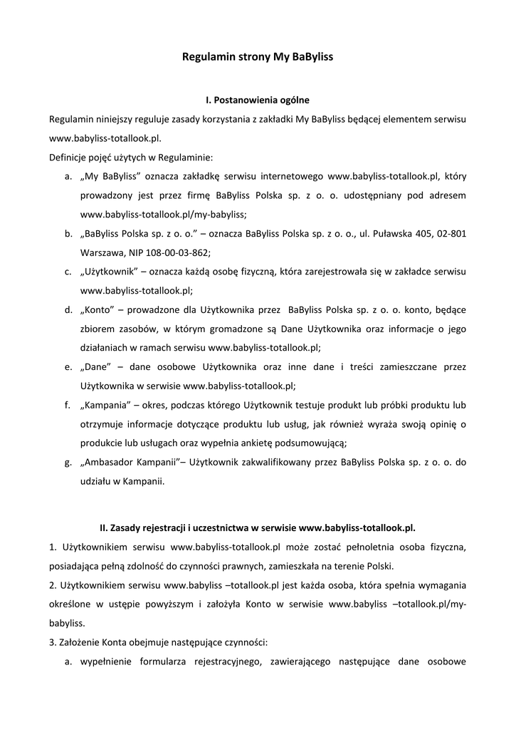 Regulamin strony My BaByliss I. Postanowienia ogólne Regulamin niniejszy reguluje zasady korzystania z zakładki My BaByliss będącej elementem serwisu www.babyliss-totallook.pl. Definicje pojęć użytych w Regulaminie: a. „My BaByliss” oznacza zakładkę serwisu internetowego www.babyliss-totallook.pl, który prowadzony jest przez firmę BaByliss Polska sp. z o. o. udostępniany pod adresem www.babyliss-totallook.pl/my-babyliss; b. „BaByliss Polska sp. z o. o.” – oznacza BaByliss Polska sp. z o. o., ul. Puławska 405, 02-801 Warszawa, NIP 108-00-03-862; c. „Użytkownik” – oznacza każdą osobę fizyczną, która zarejestrowała się w zakładce serwisu www.babyliss-totallook.pl; d. „Konto” – prowadzone dla Użytkownika przez BaByliss Polska sp. z o. o. konto, będące zbiorem zasobów, w którym gromadzone są Dane Użytkownika oraz informacje o jego działaniach w ramach serwisu www.babyliss-totallook.pl; e. „Dane” – dane osobowe Użytkownika oraz inne dane i treści zamieszczane przez Użytkownika w serwisie www.babyliss-totallook.pl; f. „Kampania” – okres, podczas którego Użytkownik testuje produkt lub próbki produktu lub otrzymuje informacje dotyczące produktu lub usług, jak również wyraża swoją opinię o produkcie lub usługach oraz wypełnia ankietę podsumowującą; g. „Ambasador Kampanii”– Użytkownik zakwalifikowany przez BaByliss Polska sp. z o. o. do udziału w Kampanii. II. Zasady rejestracji i uczestnictwa w serwisie www.babyliss-totallook.pl. 1. Użytkownikiem serwisu www.babyliss-totallook.pl może zostać pełnoletnia osoba fizyczna, posiadająca pełną zdolność do czynności prawnych, zamieszkała na terenie Polski. 2. Użytkownikiem serwisu www.babyliss –totallook.pl jest każda osoba, która spełnia wymagania określone w ustępie powyższym i założyła Konto w serwisie www.babyliss –totallook.pl/mybabyliss. 3. Założenie Konta obejmuje następujące czynności: a. wypełnienie formularza rejestracyjnego, zawierającego następujące dane osobowe Użytkownika: imię i nazwisko, adres e-mail, kod pocztowy, płeć, datę urodzenia, informację czy użytkownik jest rodzicem, a jeśli tak to jakiej płci są dzieci oraz data urodzenia dzieci, jak również nazwę Użytkownika na potrzeby serwisu (login) oraz hasło; b. wyrażenie zgody na przetwarzanie danych osobowych Użytkownika przez BaByliss Polska sp. z o. o. w brzmieniu wskazanym przez BaByliss Polska sp. z o. o.; c. akceptację niniejszego Regulaminu oraz Polityki Prywatności; 4. Założenie Konta oraz korzystanie z serwisu www.babyliss –totallook.pl jest dobrowolne i bezpłatne. Zakreślenie odpowiedniego pola obok formułki „Zapoznałem się i akceptuję warunki i zasady Regulaminu strony oraz politykę prywatności” umieszczonej w serwisie www.babyliss – totallook.pl oznacza, że Użytkownik zapoznał się i akceptuje postanowienia Regulaminu i Polityki Prywatności oraz zobowiązuje się do przestrzegania Regulaminu. Brak akceptacji powyższej klauzuli uniemożliwia założenie Konta oraz korzystanie z serwisu www.babyliss –totallook.pl. 5. Formularz wypełniony nieprawidłowo lub niekompletnie uniemożliwia dokonanie rejestracji. 6. Prawidłowe wypełnienie i przesłanie formularza rejestracyjnego oraz innych czynności związanych z założeniem Konta, po dokonaniu rejestracji Konta – zgodnie z warunkami niniejszego Regulaminu - w systemie informatycznym BaByliss Polska sp. z o. o. jest równoznaczne z zawarciem umowy o zapewnienie dostępu do zawartości serwisu www.babyliss –totallook.pl i świadczeń objętych niniejszym Regulaminem. 7. W terminie 10 dni od zawarcia umowy, o której mowa w pkt 8, Użytkownik może od niej odstąpić bez podania przyczyn składając stosowne oświadczenie drogą elektroniczną lub na piśmie, przy czym do zachowania terminu wystarczy wysłanie pisma przed jego upływem. Użytkownik wyraża zgodę na rozpoczęcie świadczenia usług, w szczególności poprzez przystąpienie przez Użytkownika do Kampanii, przed upływem 10 dni od daty zawarcia umowy; przyjmuje nadto do wiadomości, że w takim przypadku prawo do odstąpienia od umowy nie przysługuje. 8. BaByliss Polska sp. z o. o. informuje, że serwis www.babyliss –totallook.pl zawiera chronione prawem autorskim dokumenty, znaki towarowe oraz inne materiały, w szczególności teksty, artykuły, opracowania, zdjęcia, grafikę. 9. Korzystanie z serwisu www.babyliss –totallook.pl nie oznacza nabycia przez Użytkownika jakichkolwiek praw do utworów w nim zawartych. Użytkownik może korzystać z tych utworów jedynie w zakresie dozwolonym w przepisach ustawy z dnia 4 lutego 1994 roku o prawie autorskim i prawach pokrewnych (t.j. Dz. U. z 2006 r., nr 90, poz. 631). 10. BaByliss Polska sp. z o. o. zastrzega sobie prawo do krótkotrwałego zaprzestania świadczenia usług i dostępu do serwisu Rekomenduj.pl ze względu na czynności konserwacyjne lub związane z modyfikacją serwisu internetowego, mogących powodować utrudnienie lub uniemożliwienie Użytkownikom korzystanie z serwisu www.babyliss –totallook.pl. Terminy prac i przewidywany czas ich trwania będą publikowane na stronie internetowej www.rekomenduj.to przed rozpoczęciem prac. 11. W przypadkach szczególnych, mających wpływ na bezpieczeństwo i stabilność systemu teleinformatycznego, BaByliss Polska sp. z o. o. ma prawo do czasowego zaprzestania lub ograniczenia świadczenia usług, i przeprowadzenia prac konserwacyjnych mających na celu przywrócenie bezpieczeństwa i stabilności systemu teleinformatycznego. 12. Zakazane jest dostarczanie przez i do systemu teleinformatycznego BaByliss Polska sp. z o. o. przez Użytkownika treści o charakterze bezprawnym, w szczególności: a. powodujących zachwianie pracy lub przeciążenie systemów teleinformatycznych BaByliss Polska sp. z o. o. lub innych podmiotów biorących bezpośredni lub pośredni udział w świadczeniu usłu