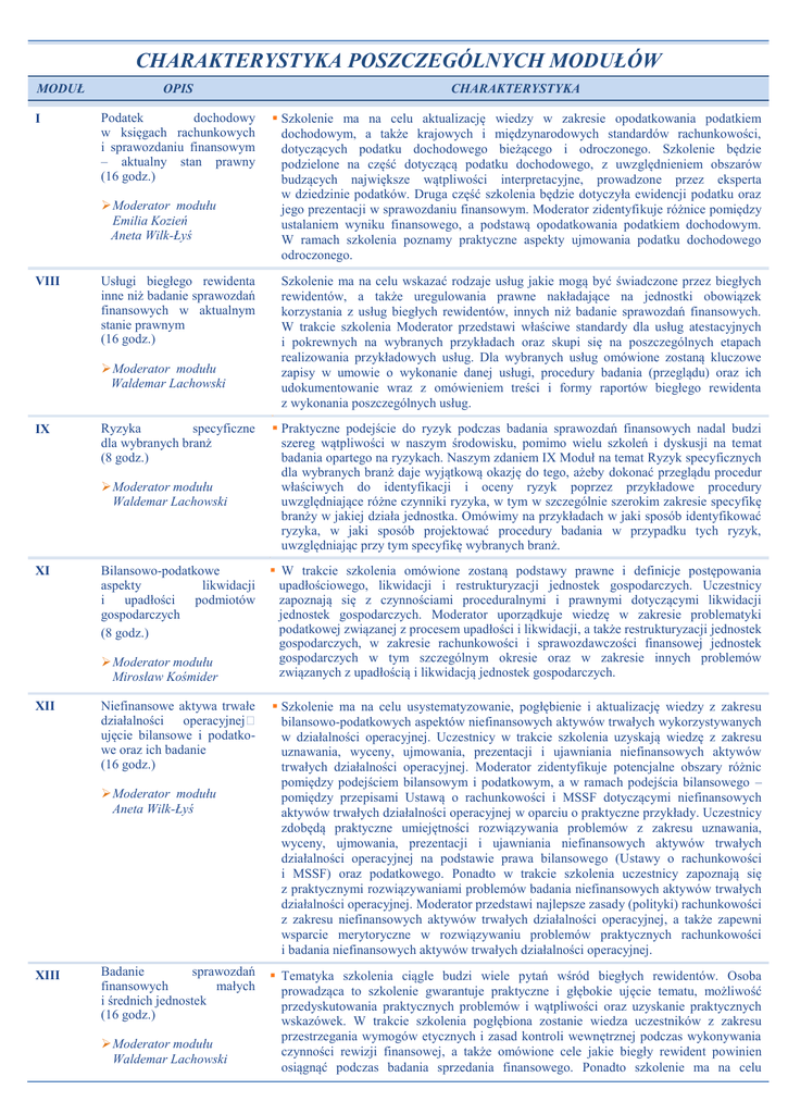 CHARAKTERYSTYKA POSZCZEGÓLNYCH MODUŁÓW MODUŁ I OPIS CHARAKTERYSTYKA Podatek dochodowy w księgach rachunkowych i sprawozdaniu finansowym – aktualny stan prawny (16 godz.) Szkolenie ma na celu aktualizację wiedzy w zakresie opodatkowania podatkiem dochodowym, a także krajowych i międzynarodowych standardów rachunkowości, dotyczących podatku dochodowego bieżącego i odroczonego. Szkolenie będzie podzielone na część dotyczącą podatku dochodowego, z uwzględnieniem obszarów budzących największe wątpliwości interpretacyjne, prowadzone przez eksperta w dziedzinie podatków. Druga część szkolenia będzie dotyczyła ewidencji podatku oraz jego prezentacji w sprawozdaniu finansowym. Moderator zidentyfikuje różnice pomiędzy ustalaniem wyniku finansowego, a podstawą opodatkowania podatkiem dochodowym. W ramach szkolenia poznamy praktyczne aspekty ujmowania podatku dochodowego odroczonego. Moderator modułu Emilia Kozień Aneta Wilk-Łyś VIII Usługi biegłego rewidenta inne niż badanie sprawozdań finansowych w aktualnym stanie prawnym (16 godz.) Szkolenie ma na celu wskazać rodzaje usług jakie mogą być świadczone przez biegłych rewidentów, a także uregulowania prawne nakładające na jednostki obowiązek korzystania z usług biegłych rewidentów, innych niż badanie sprawozdań finansowych. W trakcie szkolenia Moderator przedstawi właściwe standardy dla usług atestacyjnych i pokrewnych na wybranych przykładach oraz skupi się na poszczególnych etapach realizowania przykładowych usług. Dla wybranych usług omówione zostaną kluczowe zapisy w umowie o wykonanie danej usługi, procedury badania (przeglądu) oraz ich udokumentowanie wraz z omówieniem treści i formy raportów biegłego rewidenta z wykonania poszczególnych usług. Moderator modułu Waldemar Lachowski IX Praktyczne podejście do ryzyk podczas badania sprawozdań finansowych nadal budzi szereg wątpliwości w naszym środowisku, pomimo wielu szkoleń i dyskusji na temat badania opartego na ryzykach. Naszym zdaniem IX Moduł na temat Ryzyk specyficznych dla wybranych branż daje wyjątkową okazję do tego, ażeby dokonać przeglądu procedur właściwych do identyfikacji i oceny ryzyk poprzez przykładowe procedury uwzględniające różne czynniki ryzyka, w tym w szczególnie szerokim zakresie specyfikę branży w jakiej działa jednostka. Omówimy na przykładach w jaki sposób identyfikować ryzyka, w jaki sposób projektować procedury badania w przypadku tych ryzyk, uwzględniając przy tym specyfikę wybranych branż. Ryzyka specyficzne dla wybranych branż (8 godz.) Moderator modułu Waldemar Lachowski XI Bilansowo-podatkowe aspekty likwidacji i upadłości podmiotów gospodarczych (8 godz.) Moderator modułu Mirosław Kośmider XII Niefinansowe aktywa trwałe działalności operacyjnej ujęcie bilansowe i podatkowe oraz ich badanie (16 godz.) Moderator modułu Aneta Wilk-Łyś XIII Badanie sprawozdań finansowych małych i średnich jednostek (16 godz.) Moderator modułu Waldemar Lachowski W trakcie szkolenia omówione zostaną podstawy prawne i definicje postępowania upadłościowego, likwidacji i restrukturyzacji jednostek gospodarczych. Uczestnicy zapoznają się z czynnościami proceduralnymi i prawnymi dotyczącymi likwidacji jednostek gospodarczych. Moderator uporządkuje wiedzę w zakresie problematyki podatkowej związanej z procesem upadłości i likwidacji, a także restrukturyzacji jednostek gospodarczych, w zakresie rachunkowości i sprawozdawczości finansowej jednostek gospodarczych w tym szczególnym okresie oraz w zakresie innych problemów związanych z upadłością i likwidacją jednostek gospodarczych. Szkolenie ma na celu usystematyzowanie, pogłębienie i aktualizację wiedzy z zakresu bilansowo-podatkowych aspektów niefinansowych aktywów trwałych wykorzystywanych w działalności operacyjnej. Uczestnicy w trakcie szkolenia uzyskają wiedzę z zakresu uznawania, wyceny, ujmowania, prezentacji i ujawniania niefinansowych aktywów trwałych działalności operacyjnej. Moderator zidentyfikuje potencjalne obszary różnic pomiędzy podejściem bilansowym i podatkowym, a w ramach podejścia bilansowego – pomiędzy przepisami Ustawą o rachunkowości i MSSF dotyczącymi niefinansowych aktywów trwałych działalności operacyjnej w oparciu o praktyczne przykłady. Uczestnicy zdobędą praktyczne umiejętności rozwiązywania problemów z zakresu uznawania, wyceny, ujmowania, prezentacji i ujawniania niefinansowych aktywów trwałych działalności operacyjnej na podstawie prawa bilansowego (Ustawy o rachunkowości i MSSF) oraz podatkowego. Ponadto w trakcie szkolenia uczestnicy zapoznają się z praktycznymi rozwiązywaniami problemów badania niefinansowych aktywów trwałych działalności operacyjnej. Moderator przedstawi najlepsze zasady (polityki) rachunkowości z zakresu niefinansowych aktywów trwałych działalności operacyjnej, a także zapewni wsparcie merytoryczne w rozwiązywaniu problemów praktycznych rachunkowości i badania niefinansowych aktywów trwałych działalności operacyjnej. Tematyka szkolenia ciągle budzi wiele pytań wśród biegłych rewidentów. Osoba prowadząca to szkolenie gwarantuje praktyczne i głębokie ujęcie tematu, możliwość przedyskutowania praktycznych problemów i wątpliwości oraz uzyskanie praktycznych wskazówek. W trakcie szkolenia pogłębiona zostanie wiedza uczestników z zakresu przestrzegania wymogów etycznych i zasad kontroli wewnętrznej podczas wykonywania czynności rewizji finansowej, a także omówione cele jakie biegły rewident powinien osiągnąć podczas badania sprzedania finansowego. Ponadto szkolenie ma na celu zapewnienie wsparcia merytorycznego w zakresie oszacowania czynników ryzyka istotnego zniekształcenia na poziomie stwierdzeń oraz opracowania ogólnej strategii badania sprawozdania finansowego, a następnie procedur odpowiadających na te ryzyka. XIV Organizacja systemu kont