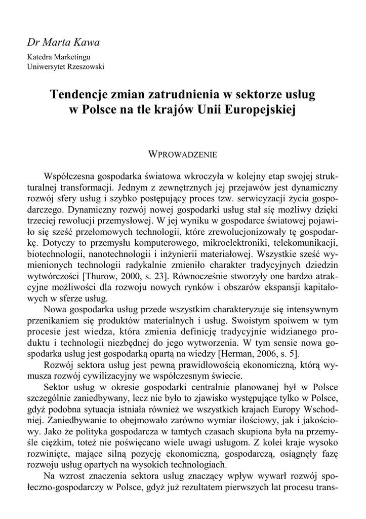 Tendencje zmian zatrudnienia w sektorze usług w Polsce... 413 Dr Marta Kawa Katedra Marketingu Uniwersytet Rzeszowski Tendencje zmian zatrudnienia w sektorze usług w Polsce na tle krajów Unii Europejskiej WPROWADZENIE Współczesna gospodarka światowa wkroczyła w kolejny etap swojej strukturalnej transformacji. Jednym z zewnętrznych jej przejawów jest dynamiczny rozwój sfery usług i szybko postępujący proces tzw. serwicyzacji życia gospodarczego. Dynamiczny rozwój nowej gospodarki usług stał się możliwy dzięki trzeciej rewolucji przemysłowej. W jej wyniku w gospodarce światowej pojawiło się sześć przełomowych technologii, które zrewolucjonizowały tę gospodarkę. Dotyczy to przemysłu komputerowego, mikroelektroniki, telekomunikacji, biotechnologii, nanotechnologii i inżynierii materiałowej. Wszystkie sześć wymienionych technologii radykalnie zmieniło charakter tradycyjnych dziedzin wytwórczości [Thurow, 2000, s. 23]. Równocześnie stworzyły one bardzo atrakcyjne możliwości dla rozwoju nowych rynków i obszarów ekspansji kapitałowych w sferze usług. Nowa gospodarka usług przede wszystkim charakteryzuje się intensywnym przenikaniem się produktów materialnych i usług. Swoistym spoiwem w tym procesie jest wiedza, która zmienia definicję tradycyjnie widzianego produktu i technologii niezbędnej do jego wytworzenia. W tym sensie nowa gospodarka usług jest gospodarką opartą na wiedzy [Herman, 2006, s. 5]. Rozwój sektora usług jest pewną prawidłowością ekonomiczną, którą wymusza rozwój cywilizacyjny we współczesnym świecie. Sektor usług w okresie gospodarki centralnie planowanej był w Polsce szczególnie zaniedbywany, lecz nie było to zjawisko występujące tylko w Polsce, gdyż podobna sytuacja istniała również we wszystkich krajach Europy Wschodniej. Zaniedbywanie to obejmowało zarówno wymiar ilościowy, jak i jakościowy. Jako że polityka gospodarcza w tamtych czasach skupiona była na przemyśle ciężkim, toteż nie poświęcano wiele uwagi usługom. Z kolei kraje wysoko rozwinięte, mające silną pozycję ekonomiczną, gospodarczą, osiągnęły fazę rozwoju usług opartych na wysokich technologiach. Na wzrost znaczenia sektora usług znaczący wpływ wywarł rozwój społeczno-gospodarczy w Polsce, gdyż już rezultatem pierwszych lat procesu trans- 414 MARTA KAWA formacji był spadek udziału przemysłu w wytwarzaniu wartości dodanej, przy wzroście udziału sektora usług, który ciągle się rozwija i ma duży wpływ na rozwój społeczno-gospodarczy kraju. Ekspansja sektora usług i jego efektywność stają się obecnie głównymi wyznacznikami wysokiego tempa rozwoju gospodarczego. Celem artykułu jest przedstawienie, w jaki sposób rozwój społeczno-gospodarczy przyczynił się do wzrostu znaczenia sfery usług oraz jak zmieniał się poziom zatrudnienia w sektorze usług w Polsce w latach 1989–2007 oraz w Unii Europejskiej. Usługi są sektorem dynamicznie rozwijającym się, zwiększającym zapotrzebowanie na wykwalifikowaną siłę roboczą, dlatego coraz więcej ludzi znajduje zatrudnienie w tym sektorze. USŁUGOWA OPCJA ROZWOJU GOSPODARCZEGO W ekonomii wyróżniamy pojęcia wzrostu oraz rozwoju gospodarczego. Wzrost gospodarczy jest procesem tworzenia oraz powiększania rzeczywistych rozmiarów społecznego produktu. Procesowi temu towarzyszą zmiany struktury produktu narodowego, a także całej gospodarki. Wzrost gospodarczy oraz towarzyszące mu zmiany strukturalne określane są łącznie jako rozwój gospodarczy. Wzrost gospodarczy jest powszechnie wiązany z procesem zwiększania w kraju produkcji i usług, a ogólniej mówiąc produktu krajowego. Wzrost gospodarczy jest nieodzownym elementem rozwoju społeczno-gospodarczego, gdy wykorzystywany jest do osiągania poprawy szeroko rozumianych warunków życia ludności, do kreowania jakościowych zmian w strukturze i funkcjonowaniu gospodarki jako całości. Podstawowe problemy wzrostu w każdej gospodarce można sprowadzić do trzech sfer: 1) identyfikacji oraz rozbudzania potrzeb, a także kreowania warunków dla powstawania możliwości wykorzystujących istniejące zasoby społeczne oraz naturalne dla zaspokajania tych potrzeb; 2) sprzyjanie innowacjom, pobudzanie oraz ułatwianie modernizacji aparatu wytwórczego, aktualizowanie oraz doskonalanie technologii, a także rozwój kwalifikacji; 3) tworzenie warunków dla powstawania oszczędności oraz ich przekształcania w inwestycje w najbardziej wydajnych dziedzinach gospodarki oraz w najbardziej efektywne przedsięwzięcia [Kłosiński, 2002, s. 10]. Każda ze sfer jest realizowana w określonych warunkach na płaszczyźnie instytucjonalnej, prawnej i ekonomicznej. Zmiany w tych sferach przyspieszają bądź opóźniają przebieg procesów w każdej z nich. Całokształt tych zmian określany jest jako strategia rozwoju gospodarczego. Tendencje zmian zatrudnienia w sektorze usług w Polsce... 415 Można przedstawić rozległą sferę przyczyn wzrostu aktywności w procesie świadczenia usług. K.A. Kłosiński przedstawia je w następujących grupach zagadnień: • wzrost zawiłości, komplikacji, specjalizacji we współczesnych procesach społeczno-gospodarczych, a w szczególności wzrost interwencjonizmu państwowego oraz regulacji stwarzają w firmach potrzebę sięgania do usług prawników, księgowych oraz innych specjalistów; • rosnący podział pracy, łącząc się ze wzrostem specjalizacji, elastyczności oraz zróżnicowania produktów, powoduje umiędzynarodowienie rynku oraz wzrost konkurencji. Aby być zdolnym do konkurencji w niezrównoważonym środowisku firmy muszą w coraz większym stopniu korzystać z usług badania rynku jak też pobudzać wysiłki marketingowe; • wzrastający strumień dóbr, osób, płatności oraz informacji przekazywany pomiędzy firmami oraz regionami musi być sprawnie obsłużony przez wyspecjalizowane przedsiębiorstwa świadczenia tyc