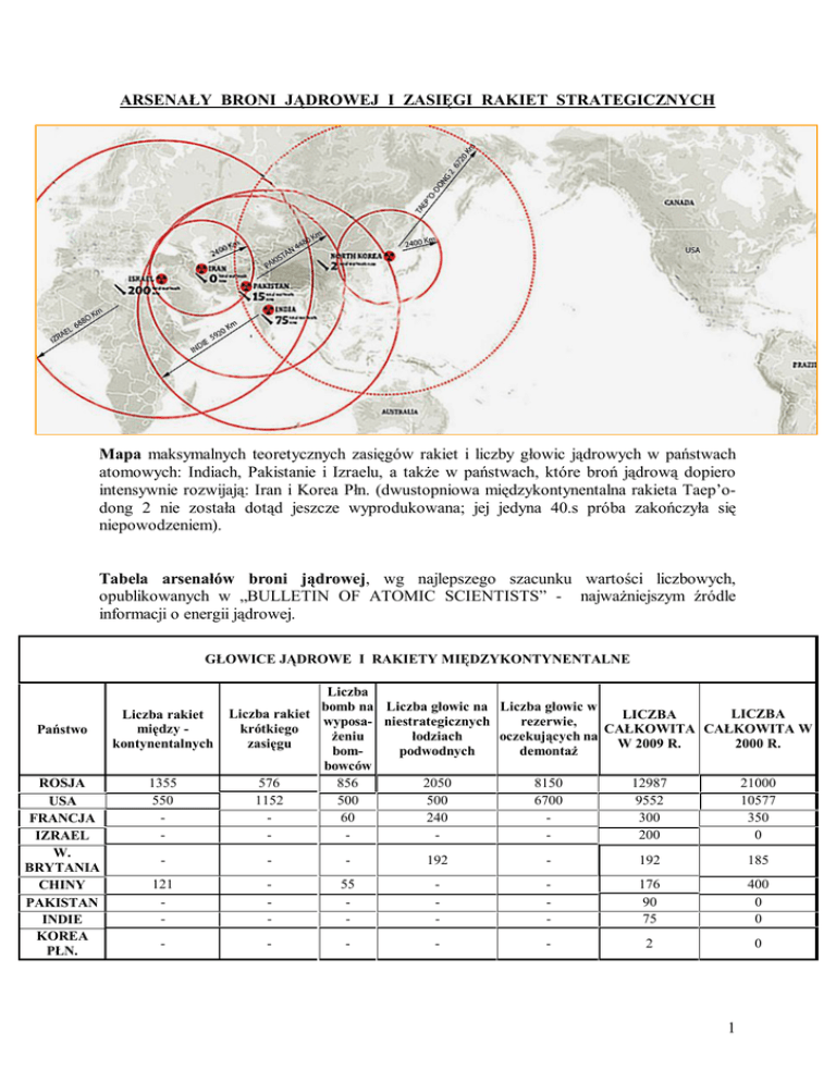 ARSENAŁY BRONI JĄDROWEJ I ZASIĘGI RAKIET STRATEGICZNYCH Mapa maksymalnych teoretycznych zasięgów rakiet i liczby głowic jądrowych w państwach atomowych: Indiach, Pakistanie i Izraelu, a także w państwach, które broń jądrową dopiero intensywnie rozwijają: Iran i Korea Płn. (dwustopniowa międzykontynentalna rakieta Taep’odong 2 nie została dotąd jeszcze wyprodukowana; jej jedyna 40.s próba zakończyła się niepowodzeniem). Tabela arsenałów broni jądrowej, wg najlepszego szacunku wartości liczbowych, opublikowanych w „BULLETIN OF ATOMIC SCIENTISTS” - najważniejszym źródle informacji o energii jądrowej. GŁOWICE JĄDROWE I RAKIETY MIĘDZYKONTYNENTALNE Państwo ROSJA USA FRANCJA IZRAEL W. BRYTANIA CHINY PAKISTAN INDIE KOREA PŁN. Liczba rakiet między kontynentalnych 1355 550 - Liczba bomb na Liczba głowic na Liczba głowic w LICZBA Liczba rakiet LICZBA wyposa- niestrategicznych rezerwie, krótkiego CAŁKOWITA CAŁKOWITA W łodziach żeniu oczekujących na 2000 R. zasięgu W 2009 R. podwodnych bomdemontaż bowców 576 856 2050 8150 12987 21000 1152 500 500 6700 9552 10577 60 240 300 350 200 0 - - - 192 - 192 185 121 - - 55 - - - 176 90 75 400 0 0 - - - - - 2 0 1 Iran pracuje nad ładunkami jądrowymi, zawierającymi rozszczepialny izotop uranu U - 235, a Korea Płn. obrała inną drogę: produkuje bomby ze sztucznie otrzymanego izotopu plutonu Pu - 239 (patrz np.: J. Kubowski, Broń jądrowa, wyd. WNT, Warszawa, 2008 r.) Powyższe dane nie zawierają ładunków jądrowych do takiej broni o krótkim zasięgu, jak broń taktyczna (z nabojami artyleryjskimi), bomby do głębokiej podziemnej penetracji i rakiety antybalistyczne; wg szacunków, ich liczba w USA wynosi ok. 500., a w Rosji - ok. 2000. Broń ta nie stanowi natychmiastowego zagrożenia dla supermocarstw, aczkolwiek jej posiadanie - z powodu względnie małych rozmiarów – zwiększa ryzyko grabieży lub kradzieży. Rozróżnia się głowice rozmieszczone na wyrzutniach, znajdujące się w rezerwie, lub jako przestarzale – na składach, do likwidacji. Rezerwowe arsenały głowic zgromadzone w bunkrach podlegają stałej konserwacji. W sytuacjach krytycznych, umieszczenie zapasowych głowic na wyrzutniach jest kwestią dni, lub tygodni. W przypadku bomb grawitacyjnych, różnica między ładunkami rezerwowymi a rozmieszczonymi na wyrzutniach prawie się zupełnie zaciera. Na przykład, w przypadku USA jest ona zależna od miejsca dyslokacji: w bazach europejskich, czy amerykańskich Głowice o przestarzałej technologii przeznacza się do rozbiórki. Pozbawia się je urządzeń napędowych, a konserwacji nie podlegają. W niektórych przypadkach – w celu zabezpieczenia przed nieprzewidywalnym wybuchem – mechanizmy spustowe się demontuje. W rzeczywistości tego rodzaju prace odkłada się na lata. W USA z 4200. przestarzałych głowic demontuje się rocznie zaledwie 270. Przypuszcza się, iż Rosja poza wyrzutniami posiada ok. 8000 głowic. Jednakże nie jest wiadome, jaka liczba przypada na głowice rezerwowe, a jaka – na technicznie przestarzale. Według oceny niezależnych ekspertów, przeważająca cześć z tej liczby należy do tych ostatnich; jest przeznaczona do demontażu. * * * Żródło danych: Simon Rogers, The Guardian - dziennik brytyjski, 2009 r. Opracował J. K., styczeń 2010 r. 2