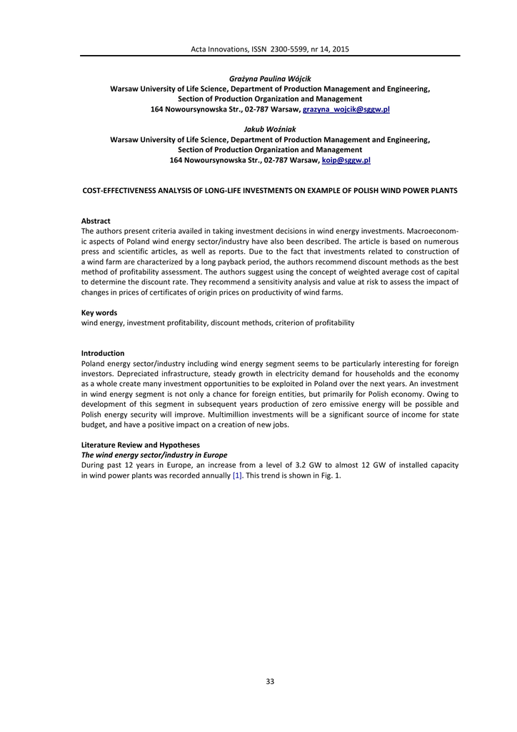Acta Innovations, ISSN 2300-5599, nr 14, 2015 Grażyna Paulina Wójcik Warsaw University of Life Science, Department of Production Management and Engineering, Section of Production Organization and Management 164 Nowoursynowska Str., 02-787 Warsaw, [email protected] Jakub Woźniak Warsaw University of Life Science, Department of Production Management and Engineering, Section of Production Organization and Management 164 Nowoursynowska Str., 02-787 Warsaw, [email protected] COST-EFFECTIVENESS ANALYSIS OF LONG-LIFE INVESTMENTS ON EXAMPLE OF POLISH WIND POWER PLANTS Abstract The authors present criteria availed in taking investment decisions in wind energy investments. Macroeconomic aspects of Poland wind energy sector/industry have also been described. The article is based on numerous press and scientific articles, as well as reports. Due to the fact that investments related to construction of a wind farm are characterized by a long payback period, the authors recommend discount methods as the best method of profitability assessment. The authors suggest using the concept of weighted average cost of capital to determine the discount rate. They recommend a sensitivity analysis and value at risk to assess the impact of changes in prices of certificates of origin prices on productivity of wind farms. Key words wind energy, investment profitability, discount methods, criterion of profitability Introduction Poland energy sector/industry including wind energy segment seems to be particularly interesting for foreign investors. Depreciated infrastructure, steady growth in electricity demand for households and the economy as a whole create many investment opportunities to be exploited in Poland over the next years. An investment in wind energy segment is not only a chance for foreign entities, but primarily for Polish economy. Owing to development of this segment in subsequent years production of zero emissive energy will be possible and Polish energy security will improve. Multimillion investments will be a significant source of income for state budget, and have a positive impact on a creation of new jobs. Literature Review and Hypotheses The wind energy sector/industry in Europe During past 12 years in Europe, an increase from a level of 3.2 GW to almost 12 GW of installed capacity in wind power plants was recorded annually [1]. This trend is shown in Fig. 1. 33 Acta Innovations, ISSN 2300-5599, nr 14, 2015 GW 14 2008 0,874 0,883 0,575 0,373 2007 2010 2011 10,729 2006 8,79 2005 8,964 2004 9,695 2003 8,109 2002 8,648 7,086 0,09 6,454 0,09 0,276 5,749 2 5,186 4,377 4 5,743 0,51 6 0,17 8 0,093 0,318 10 1,166 12 0 2001 Land farms 2009 2012 Marine farms Fig. 1. Investments in wind power in the years 2001-2012 in Europe Source: own study based on [1]. Currently a total capacity of about 106 GW of wind power is installed in Europe (Fig. 2). The regular leader on energy market is Germany whose share in the European wind energy equals 30%. GW 120 100 513% 17,9% YTY 75,2 85 94,4 65 28,5 40,8 56,7 23,1 34,4 48 17,3 60 2001 2002 2003 2004 2005 2006 2007 2008 2009 2010 2011 40 20 106 80 0 2012 Fig. 2. Total wind power in the European Union Source: own study based on [1]. According to estimates, owing to currently existing installations about 231 TWh of electricity can be generated, which covers 7% of total energy demand in Europe. In 2011, the figure was less than 6.3%. Denmark with its (27%) of energy produced by wind power is the country with the highest ratio of meeting a demand for electricity. The subsequent places are taken by Portugal and Spain, where value of this ratio is 18% and 17% respectively. 34 Acta Innovations, ISSN 2300-5599, nr 14, 2015 Currently in Poland there are 890 installations that produce electricity by wind power with a total capacity of 3727.03 MW (as of 31.08.2014) [2]. This means that in the first six months of 2013 Poland already reached the level envisaged by the Ministry of Economy, which was to be reached at the end of 2013 [3]. Undoubtedly, over the last few years a steady and stable growth in the number of wind farms has been observed (Fig. 3). 3000 MW MW 1000 900 2500 800 700 2000 287,9 451 724,68 2006 2007 2008 2009 500 0 1180,27 152 1000 1616,36 1500 2497 600 500 400 300 200 100 0 Total wind power 2010 2011 2012 Power increase per annum Fig. 3. Installed capacity of wind farms and growth rate of installed capacity in Poland Source: own study based on [4]. Particularly rapid growth of installed capacity occurred in 2012 and amounted to 880 MW compared to 436 MW in 2011, which may be due to the fact that investors wanted to complete their projects before the end of 2012 in order to benefit from old support systems. Wind energy is the fastest growing segment of renewable energy in Poland. Owing to stable growth of capacity, wind power represents nearly 60% of all green energy market in Poland in terms of installed capacity. Currently operating wind farms produced 3 126 GWh of electricity in 2011, which allowed to meet a demand of almost 2% of the total demand for electricity (in 2012 4 026 GWh (3%), in 2013 5 895 GWh (4%)). In 2004, this figure was only 0,1% [4]. Poland is a country with favorable climatic conditions for conducting activities related to production of electricity using wind. Currently, owing to development of technologies to manufacture wind turbines having an impact on lowering minimum wind speed at which it is possible to produce electricity, nearly two thirds of Poland territory is characterized by appropriate wind conditions. The most attractive areas are located in the north-western part of Poland, where wind speed can fluctuate within 10 m/s [1]. Favorable conditions are also along the coast of the Baltic Sea, and in Warmia and Mazury province. Marine areas are excellent investment zones. It is estimated that about 3600 km2 area of the Baltic Sea may be used for a construction of offshore wind farms [5]. In 2012, off the coast of Europe, new wind parks 