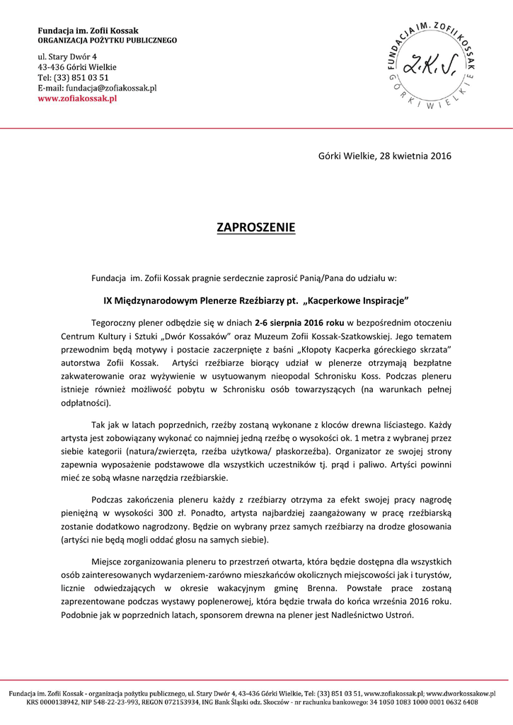 Górki Wielkie, 28 kwietnia 2016 ZAPROSZENIE Fundacja im. Zofii Kossak pragnie serdecznie zaprosić Panią/Pana do udziału w: IX Międzynarodowym Plenerze Rzeźbiarzy pt. „Kacperkowe Inspiracje” Tegoroczny plener odbędzie się w dniach 2-6 sierpnia 2016 roku w bezpośrednim otoczeniu Centrum Kultury i Sztuki „Dwór Kossaków” oraz Muzeum Zofii Kossak-Szatkowskiej. Jego tematem przewodnim będą motywy i postacie zaczerpnięte z baśni „Kłopoty Kacperka góreckiego skrzata” autorstwa Zofii Kossak. Artyści rzeźbiarze biorący udział w plenerze otrzymają bezpłatne zakwaterowanie oraz wyżywienie w usytuowanym nieopodal Schronisku Koss. Podczas pleneru istnieje również możliwość pobytu w Schronisku osób towarzyszących (na warunkach pełnej odpłatności). Tak jak w latach poprzednich, rzeźby zostaną wykonane z kloców drewna liściastego. Każdy artysta jest zobowiązany wykonać co najmniej jedną rzeźbę o wysokości ok. 1 metra z wybranej przez siebie kategorii (natura/zwierzęta, rzeźba użytkowa/ płaskorzeźba). Organizator ze swojej strony zapewnia wyposażenie podstawowe dla wszystkich uczestników tj. prąd i paliwo. Artyści powinni mieć ze sobą własne narzędzia rzeźbiarskie. Podczas zakończenia pleneru każdy z rzeźbiarzy otrzyma za efekt swojej pracy nagrodę pieniężną w wysokości 300 zł. Ponadto, artysta najbardziej zaangażowany w pracę rzeźbiarską zostanie dodatkowo nagrodzony. Będzie on wybrany przez samych rzeźbiarzy na drodze głosowania (artyści nie będą mogli oddać głosu na samych siebie). Miejsce zorganizowania pleneru to przestrzeń otwarta, która będzie dostępna dla wszystkich osób zainteresowanych wydarzeniem-zarówno mieszkańców okolicznych miejscowości jak i turystów, licznie odwiedzających w okresie wakacyjnym gminę Brenna. Powstałe prace zostaną zaprezentowane podczas wystawy poplenerowej, która będzie trwała do końca września 2016 roku. Podobnie jak w poprzednich latach, sponsorem drewna na plener jest Nadleśnictwo Ustroń. Jeśli wyraża Pani/Pan zainteresowanie udziałem w tegorocznej edycji Pleneru Rzeźbiarzy, prosimy o wypełnienie załączonego formularza zgłoszeniowego i przesłania go na adres Fundacji do końca lipca. O uczestnictwie decyduje kolejność zgłoszeń. Serdecznie zapraszamy! Małgorzata Lipińska Prezes Zarządu Fundacji