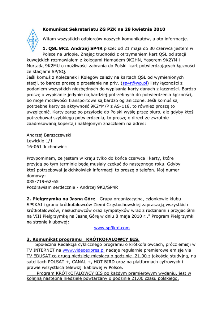 Komunikat Sekretariatu ZG PZK na 28 kwietnia 2010 Witam wszystkich odbiorców naszych komunikatów, a oto informacje. 1. QSL 9K2. Andrzej SP4R pisze: od 21 maja do 30 czerwca jestem w Polsce na urlopie. Znając trudności z otrzymaniem kart QSL od stacji kuwejckich rozmawiałem z kolegami Hamadem 9K2HN, Yaserem 9K2YM i Murtadą 9K2MU o możliwości zabrania do Polski kart potwierdzających łączności ze stacjami SP/SQ. Jeśli komuś z Koleżanek i Kolegów zależy na kartach QSL od wymienionych stacji, to bardzo proszę o przesłanie na priv. ([email protected]) listy łączności z podaniem wszystkich niezbędnych do wypisania karty danych z łączności. Bardzo proszę o wypisanie jedynie najbardziej potrzebnych do potwierdzenia łączności, bo moje możliwości transportowe są bardzo ograniczone. Jeśli komuś są potrzebne karty za aktywność 9K2YM/P z AS-118, to również proszę to uwzględnić. Karty zaraz po przylocie do Polski wyślę przez biuro, ale gdyby ktoś potrzebował szybkiego potwierdzenia, to proszę o direct ze zwrotnie zaadresowaną kopertą i naklejonym znaczkiem na adres: Andrzej Barszczewski Lewickie 1/1 16-061 Juchnowiec Przypominam, ze jestem w kraju tylko do końca czerwca i karty, które przyjdą po tym terminie będą musiały czekać do następnego roku. Gdyby ktoś potrzebował jakichkolwiek informacji to proszę o telefon. Moj numer domowy: 085-719-62-65 Pozdrawiam serdecznie - Andrzej 9K2/SP4R 2. Pielgrzymka na Jasną Górę. Grupa organizacyjna, członkowie klubu SP9KAJ i grono krótkofalowców Ziemi Częstochowskiej zapraszają wszystkich krótkofalowców, nasłuchowców oraz sympatyków wraz z rodzinami i przyjaciółmi na VIII Pielgrzymkę na Jasną Górę w dniu 8 maja 2010 r.." Program Pielgrzymki na stronie klubowej: www.sp9kaj.com 3. Komunikat programu KRÓTKOFALOWCY BIS. Społeczna Redakcja cyklicznego programu o krótkofalowcach, prócz emisji w TV INTERNET na www.videoexpres.pl nadaje regularnie premierowe emisje via TV EDUSAT co drugą niedzielę miesiąca o godzinie 21.00 z jakością studyjną, na satelitach POLSAT +, CANAL +, HOT BIRD oraz na platformach cyfrowych i prawie wszystkich telewizji kablowej w Polsce. Program KRÓTKOFALOWCY BIS po każdym premierowym wydaniu, jest w kolejną następną niedzielę powtarzany o godzinie 21.00 czasu polskiego. Najbliższe wydanie w niedzielę 2.05.2010r. o godzinie 21.00 czasu polskiego. W programie między innymi o Dolnośląskiej Amatorskiej Służbie Ratunkowej i podpisaniu umowy o współpracy między Urzędem Województwa Dolnośląskiego we Wrocławiu, a miejscowym Oddziałem Terenowym PZK oraz relacja z pracy okolicznościowej radiostacji krótkofalowej zainstalowanej w Świdnicy nad bunkrem, gdzie w podziemiach funkcjonowała strategiczna dla III Rzeszy amplifikatornia, czyli stacja wzmacniakowa sygnałów fonicznych i telegraficznych. Po wojnie stacja ta była do 2004 roku eksploatowana przez Telekomunikację Polską S.A. Warto w tym momencie dodać, że program K BIS jest równolegle zamieszczany w TV INTERNET zaraz po każdej premierowej emisji na portalu www.videoexpres.pl Dane do odbioru bezpośredniego są zamieszczone na portalu EDUSAT http://szkola.wsseuczelnia.edu.pl/node/116 Informuję jednocześnie, że EDUSAT jest jedyną w Polsce stacją edukacyjną i można ją retransmitować za darmo. Nie jest kodowana, jak większość stacji, nie tylko komercyjnych. Stacja Kablowa MULTIMEDIA POLSKA jak mnie poinformowano niedawno, zastanawia się, by również retransmitować w swojej sieci programy edukacyjne TV EDUSAT w tym również nasz program KRÓTKOFALOWCY BIS. Od nas więc, od naszego apelu zależy kiedy w tej kolejnej ogólnopolskiej telewizji kablowej się pojawimy. Piszmy więc gremialnie kto może do ich Biura Obsługi Klienta w Gdańsku, [email protected] by EDUSAT w MULTIMEDIA POLSKA jak najszybciej zaistniał, zwiększając tym samym krąg odbiorców programu K BIS. Autor i redaktor programu Henryk Pacha ATV SP6ARR www.videoexpres.pl 4. WARD 2010 Contest W niedzielę 25 bm. rozegrane zostały krajowe zawody WARD Contest, zorganizowane dla uczczenia święta krótkofalowców. Wyniki zostały obliczone w ciągu 48 godzin i są dostępne na stronie PGA Zawody 2010 http://pgazawody.net-one.pl/logi_WARD_2010.html, wraz ze szczegółowym rozliczeniem każdego zawodnika. Zgodnie z regulaminem grawertony ufundowane przez Prezesa PZK otrzymują zwycięzcy poszczególnych grup klasyfikacyjnych 3Z80PZK SP4KWO SP3PJY SQ9E SQ9IDE SQ3HXH SP5DDJ SP2DNI SQ5JUJ DL8UAA. Dyplomy przyznano zawodnikom, którzy zajęli miejsca 1-3: 3Z80PZK HF100ZHP SP80PZK SP4KWO SP4YFJ SP4KDX SP3PJY SP4KHM SN7H SQ9E SP2LQC SP5KP SQ9IDE SP1AEN SP2LNW SQ3HXH SP9HZW SQ9CWO SP5DDJ SP9UMJ SQ2DYF SP2DNI SP6BXM SP2DMB SQ5JUJ SP4LVK SP8TJK DL8UAA DR20BRA DL6OO. Ponadto, każdy uczestnik zawodów otrzymał Certyfikat udziału z wydrukowanymi znakami wywoławczymi wszystkich 147 zawodników. Są one dostępne do samodzielnego pobrania na ww. stronie PGA Zawody 2010. Półroczne prenumeraty eQTC wylosowali: SN0HS SP2LNW SQ8EP i SQ7VO. 5. SP QSL Galeria już dostępna Otwarcie SP QSL Galerii było ważnym wydarzeniem w życiu krótkofalarskim SP. Jego zasoby obejrzało już bardzo dużo nadawców i nasłuchowców. Nie są jeszcze zakończone wszystkie prace techniczne, bo każdy plik wymaga teraz dokładnej obróbki merytorycznej. Na to potrzeba sporo czasu, ale już zgłosili się chętni woluntariusze do pomocy w żmudnych pracach nad bazą. - Zadeklarowani woluntariusze SP QSL Galerii: SQ2MTK SQ7B SQ9DXT SQ9NIP. - W galerii zaprezentowane są karty z kolekcji otrzymanych od: SP0060-JG SP0PGC SP1AFU SP2IW SP2JPG SP2JS SP2KDX SP2LNW SP3DG SP3DIK SP3HC SP6BVR SP6HED SP8ASP SP8BWR SP9BVC SP9UPH SQ9BDB. - Zachęcamy klubowe zespoły operatorskie do nadsyłania skanów kart QSL swoich członków - nadawców i SWLs. SP QSL Galeria jest dobrym miejscem dla utrwalenia tego rodzaju dokumentów SP-HAMs. Przed wysyłką należy