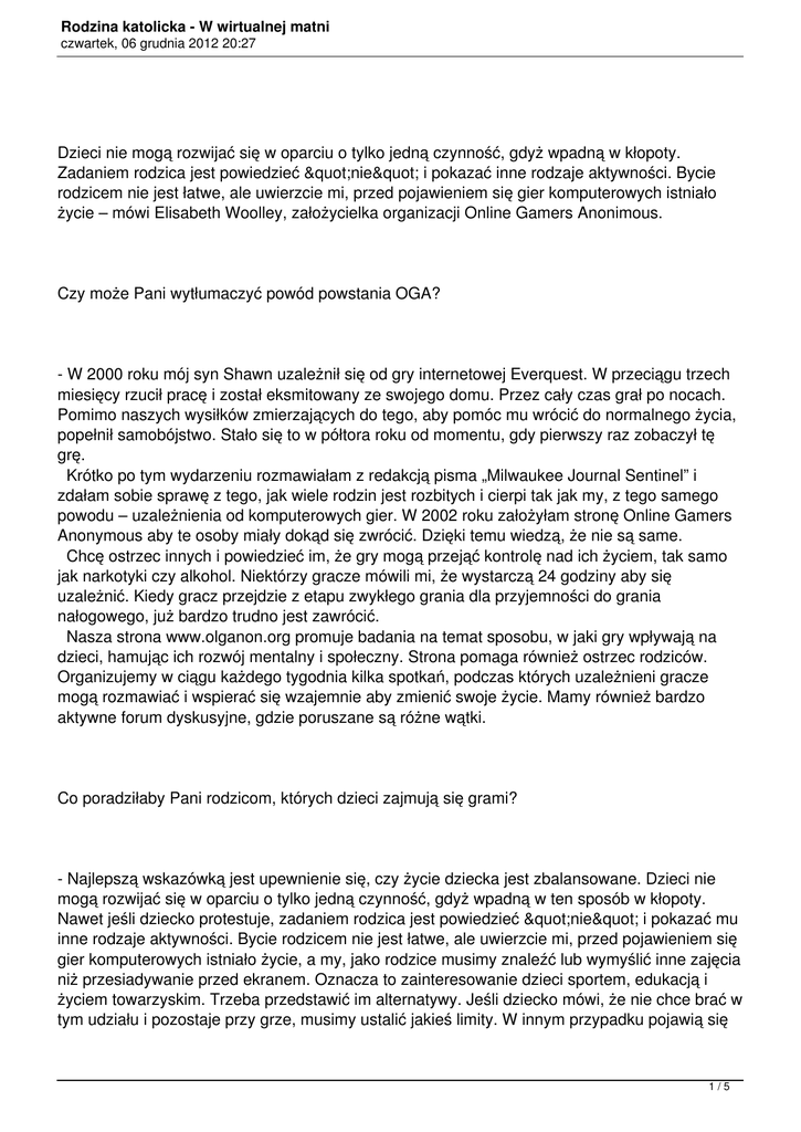 Rodzina katolicka - W wirtualnej matni czwartek, 06 grudnia 2012 20:27 Dzieci nie mogą rozwijać się w oparciu o tylko jedną czynność, gdyż wpadną w kłopoty. Zadaniem rodzica jest powiedzieć "nie" i pokazać inne rodzaje aktywności. Bycie rodzicem nie jest łatwe, ale uwierzcie mi, przed pojawieniem się gier komputerowych istniało życie – mówi Elisabeth Woolley, założycielka organizacji Online Gamers Anonimous. Czy może Pani wytłumaczyć powód powstania OGA? - W 2000 roku mój syn Shawn uzależnił się od gry internetowej Everquest. W przeciągu trzech miesięcy rzucił pracę i został eksmitowany ze swojego domu. Przez cały czas grał po nocach. Pomimo naszych wysiłków zmierzających do tego, aby pomóc mu wrócić do normalnego życia, popełnił samobójstwo. Stało się to w półtora roku od momentu, gdy pierwszy raz zobaczył tę grę. Krótko po tym wydarzeniu rozmawiałam z redakcją pisma „Milwaukee Journal Sentinel” i zdałam sobie sprawę z tego, jak wiele rodzin jest rozbitych i cierpi tak jak my, z tego samego powodu – uzależnienia od komputerowych gier. W 2002 roku założyłam stronę Online Gamers Anonymous aby te osoby miały dokąd się zwrócić. Dzięki temu wiedzą, że nie są same. Chcę ostrzec innych i powiedzieć im, że gry mogą przejąć kontrolę nad ich życiem, tak samo jak narkotyki czy alkohol. Niektórzy gracze mówili mi, że wystarczą 24 godziny aby się uzależnić. Kiedy gracz przejdzie z etapu zwykłego grania dla przyjemności do grania nałogowego, już bardzo trudno jest zawrócić. Nasza strona www.olganon.org promuje badania na temat sposobu, w jaki gry wpływają na dzieci, hamując ich rozwój mentalny i społeczny. Strona pomaga również ostrzec rodziców. Organizujemy w ciągu każdego tygodnia kilka spotkań, podczas których uzależnieni gracze mogą rozmawiać i wspierać się wzajemnie aby zmienić swoje życie. Mamy również bardzo aktywne forum dyskusyjne, gdzie poruszane są różne wątki. Co poradziłaby Pani rodzicom, których dzieci zajmują się grami? - Najlepszą wskazówką jest upewnienie się, czy życie dziecka jest zbalansowane. Dzieci nie mogą rozwijać się w oparciu o tylko jedną czynność, gdyż wpadną w ten sposób w kłopoty. Nawet jeśli dziecko protestuje, zadaniem rodzica jest powiedzieć "nie" i pokazać mu inne rodzaje aktywności. Bycie rodzicem nie jest łatwe, ale uwierzcie mi, przed pojawieniem się gier komputerowych istniało życie, a my, jako rodzice musimy znaleźć lub wymyślić inne zajęcia niż przesiadywanie przed ekranem. Oznacza to zainteresowanie dzieci sportem, edukacją i życiem towarzyskim. Trzeba przedstawić im alternatywy. Jeśli dziecko mówi, że nie chce brać w tym udziału i pozostaje przy grze, musimy ustalić jakieś limity. W innym przypadku pojawią się 1/5 Rodzina katolicka - W wirtualnej matni czwartek, 06 grudnia 2012 20:27 problemy. Kto może się uzależnić i jakie są tego konsekwencje? - Każdy może się uzależnić. Szkoły wyższe zauważają, że gry wideo są jednym z głównych powodów porzucania studiów. Wiele uniwersytetów zatrudnia doradców, których zadaniem jest uporanie się z nieumiarkowaniem studentów w graniu. Niektóre uczelnie pytają kandydatów na studia o to, czy grają w gry wideo. Wiedzą, że inwestycja czasu i środków finansowych w gracza może być zmarnowana. Znam wielu rodziców, którzy stracili pieniądze fundując swoim dzieciom - graczom studia. Wielu nastolatków, którzy zostali wciągnięci w gry wideo, jest geniuszami. Są bardzo inteligentni i zmotywowani do pracy. Dowodem na to jest fakt, iż gry wymagają od graczy wielu godzin żmudnej i męczącej aktywności, koncentracji i cierpliwości. To bardzo smutne, kiedy widać jak cała potęga umysłu zdolnych nastolatków jest marnowana w taki sposób. Oprócz refleksji nad tym, jak gry wpływają na osobiste życie i edukacje, powinniśmy się zastanowić, co by było gdyby ci wszyscy uzdolnieni ludzie zaczęli rozwiązywać prawdziwe problemy ludzkości. W pełni rozwinięci i ciężko pracujący dorośli ludzie również się uzależniają. Znam wielu, którzy mieli pracę i dom, ale stracili wszystko z powodu gier. Ekstremalnym przypadkiem jest pewien mężczyzna z Florydy, który stracił pracę i musiał zamieszkać na ulicy. Teraz pracuje w restauracji i zarabia tyle, aby wystarczyło mu na spędzenie reszty dnia po pracy w kawiarence internetowej. Gdy zamykają kawiarenkę, idzie spać na ulicę. Tak wygląda każdy jego dzień. Wielu ojców opuszcza rodziny aby "zaoszczędzony" w ten sposób czas przeznaczyć na granie. Nie obchodzi ich los rodziny, gdyż jedyne czego chcą to gra. Z kolei, dorosłe kobiety mają tendencję do grania w gry społecznościowe takie jak Farmville, Sims czy Second Life, gdyż lubią robić coś wspólnie z innymi. Prowadzi to do problemów, gdyż często porzucają swoich mężów i zaniedbują dzieci aby spędzać czas z kimś innym w grze on-line. Skrajnym przykładem może być para Koreańczyków, która doprowadziła do tego, że ich prawdziwe dziecko zmarło z głodu, gdyż oni w tym samym czasie opiekowali się wirtualnym dzieckiem w grze komputerowej. Wiele gier wideo daje dzieciom poczucie wartości i spełnienia. Co w tym złego? - Jednym z głównych zagrożeń jest właśnie to, że dzięki grom bardzo łatwo zdobyć poczucie wartości i spełnienia. Jeśli coś ci się nie uda lub nie podoba ci się to, co osiągnąłeś, zawsze możesz uruchomić grę od nowa i spróbować jeszcze raz. Prawdziwe życie tak nie wygląda. Nie jest łatwe i często nie można w nim rozpocząć pewnych rzeczy od nowa. Dziecko dorasta w poczuciu rozczarowania światem realnym i chce się z niego wycofać. Mówi "to za trudne" i ucieka do gry komputerowej. 2/5 Rodzina katolicka - W wirtualnej matni czwartek, 06 grudnia 2012 20:27 Stanowi to ogromne zagrożenie dla życia dziecka. Zamiast zdobyć poczucie war