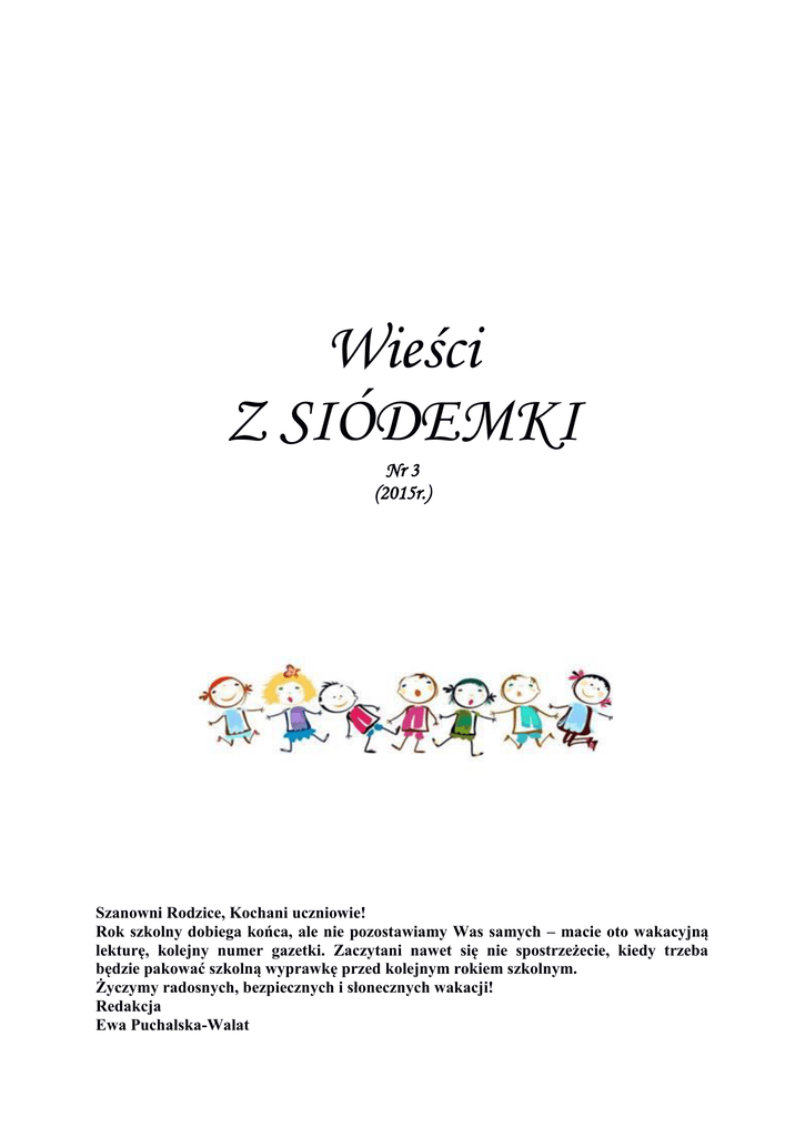 Wieści Z SIÓDEMKI Nr 3 (2015r.) Szanowni Rodzice, Kochani uczniowie! Rok szkolny dobiega końca, ale nie pozostawiamy Was samych – macie oto wakacyjną lekturę, kolejny numer gazetki. Zaczytani nawet się nie spostrzeżecie, kiedy trzeba będzie pakować szkolną wyprawkę przed kolejnym rokiem szkolnym. Życzymy radosnych, bezpiecznych i słonecznych wakacji! Redakcja Ewa Puchalska-Walat Patrycja Wszołek CO SIĘ U NAS DZIAŁO Czekając na przyjście wiosny budziły się w nas nowe siły – w tych, którzy organizują ciekawe wydarzenia i w tych, którzy z nich korzystają. Zobaczmy co ciekawego się wydarzyło... Dzień Kobiet – z okazji święta wszystkich pań, panowie przygotowali dużą dozę rozrywki – zagadki muzyczne i nie tylko przyniosły wszystkim wiele śmiechu, a na deser śpiewał zespół Siódemka. Rekolekcje Wielkopostne – jak co roku w okresie przedświątecznym przeżywaliśmy w szkole 3-dniowe rekolekcje. Zadumę zapewniał śpiew, przedstawienie, projekcja filmu oraz Droga Krzyżowa. Wyjazd do kina na film „Kopciuszek” – tą bajkę znają chyba wszyscy, a jak Kopciuszek wypadł na kinowym ekranie – o tym przekonali się uczniowie, którzy wybrali się na wycieczkę. Występ Zespołu „Słoneczka” na Festiwalu Małych Form Teatralnych „Z bajką w tle” w Domu Kultury Koszutka. Nasi artyści przedstawili sztukę „Przyjaciele z łąki” i uzyskali wyróżnienie II stopnia. Występ Zespołu „Elfy” podczas Przeglądu Zespołów Artystycznych w Domu Kultury Bogucice. Swoim „Kosmicznym tańcem” wytańczone zostało pierwsze miejsce! Urodziny księdza Zygmunta Klima – spotkanie z księdzem śpiewem uświetnił Zespół Siódemka, a przedstawieniem Zespół Słoneczka. IV Wielka Zabawa Rodzinna przy Wydziale Teologicznym organizowana przez Wielką Ligę Czytelników – nie mogło nas tam zabraknąć –wystawiono stoisko Szkoły i Stowarzyszenia oraz wystąpili „Przyjaciele z Siódemki” z przedstawieniem „Mikroby”. Dzień Godności Osób Niepełnosprawnych – to ważne dla nas wszystkich święto odbyło się dzięki mobilizacji wszystkich sił – rodziców i nauczycieli. Przyjechało wielu gości, dla których atrakcji nie brakowało, było głośno, tłoczno, wesoło i smacznie. Konkurs Kulinarny – nasi uczniowie przygotowali pierogi z farszem mięsnym. Nagrodą był wspólny poczęstunek. Wystąpiła szkolna orkiestra z interpretacją Mozarta. Konkurs wiedzy o zdrowiu i znajomości zasad pierwszej pomocy – ZSS w Sosnowcu, uczniowie naszej Szkoły zdobyli 3 miejsce. Spotkanie ze Strażą Miejską – prezentacja multimedialna oraz ćwiczenia praktyczne przybliżyły tematykę bezpieczeństwa. X Regionalny Mityng Olimpiad Specjalnych – impreza zorganizowana przez Klub Olimpiad Specjalnych Gwiazdki Katowice działający przy naszej szkole. Przybyli zawodnicy z regionu śląskiego. My pochwalić się możemy srebrnym medalem naszego ucznia Jakuba. Z okazji jubileuszu wystąpił też nasz zespół teatralny „Słoneczka” II Przeglądu Zespołów Muzycznych i Teatralnych w Dąbrowie Górniczej – Przyjaciele z Siódemki przedstawili Teatr Cieni zatytułowany „Jeden dzień z życia Siódemki” Pielgrzymka do Bazyliki Mniejszej NMP w Wadowicach „Zielona Szkoła” – w szkole jest zawsze ciekawie, ale dwutygodniowy wyjazd nad morze to dopiero dobry wybór. To nie tylko spacery i odpoczynek nad brzegiem morza, ale też wycieczki, dyskoteki czy świeża rybka. Wycieczka do ZOO – podczas tej wycieczki zobaczyliśmy wiele zwierząt, które znaliśmy tylko z książek. Co więcej mieliśmy okazję nakarmić kozy, barany, kaczki, przypatrzeć się leniwemu dniu niedźwiedzi czy figlom małp. Dzień Dziecka – święto dzieci przebiegło bardzo aktywnie, na podwórku szkolnym zorganizowane zostały zabawy sportowe. Wizyta w gospodarstwie Rolnym w Szopienicach – uczniowie z miasta mogli wkroczyć w wiejski zakątek. Dzięki temu poznali zwierzęta wiejskie, dowiedzieli się jak o nie dbać i co lubią jeść. IV Edycja Konkursu Międzyszkolnego - Z baśniowym światem za pan brat”Bajkowe zwierzątko” – nastąpiło uroczyste wręczenie nagród, a wystawę prac można było podziwiać na Sali gimnastycznej. Wiosenna Sałatka – spotkanie na Sali gimnastycznej miało na celu utrwalenie znajomości wiosennych warzyw oraz wspólne przygotowanie sałatki, którą wszyscy potem ze smakiem zjedli Święto Książki i Szkolny Konkurs Wiedzy Regionalnej – świętowaliśmy wraz z postaciami z bajek. Były piosenki, zabawy taneczne, słodkości. Nauczyciele zaprezentowali swoje umiejętności językowe losując i czytając do mikrofonu „łamańce językowe” po polsku i po Śląsku. Spotkanie z Policją – nie dość, że odwiedzili nas prawdziwi policjanci, przyszedł także Sznupek – policyjna maskotka. Niektórzy chętnie bawili się i tańczyli ze Sznupkiem, ale byli też tacy, którzy się go bali. Wyjazd do Wesołego Miasteczka – karuzele duże i małe cieszyły się sporym zainteresowaniem. Bez problemu każdy znalazł coś dla siebie. Wyjazd do Cinema City na film Pt. ”Ups Arka odpłynęła”. „Bajki z 4 stron Świata” – nie tylko na ekranie była bajka, ale także u nas – piękny bal, kolorowe stroje i mierzenie bucika, zgubionego przez Kopciuszka. Wyjazd na turnus rehabilitacyjno-terapeutyczny w Wiśle –nasi uczniowie wraz z rodzicami i nauczycielami korzystali tam z wielu atrakcji, brali udział w ciekawych wycieczkach i aktywnie spędzali czas w świetnym towarzystwie. Cyklicznie odbywały się zajęcia: Hipoterapii w Ośrodku „Padok”, Hydroterapeutyczne na basenie w Jaworznie, Muzyczne – koncerty Silesii oraz koncerty w Filharmonii Śląskiej, Biblioterapeutyczne organizowane przez Bibliotekę na Janowie, Zajęcia ceramiczne i filmowe w Pałacu Młodzieży. O METODZIE INTEGRACJA SENSORYCZNA W jaki sposób rodzice mogą wspomagać rozwój procesów integracji sensorycznej swojego dz