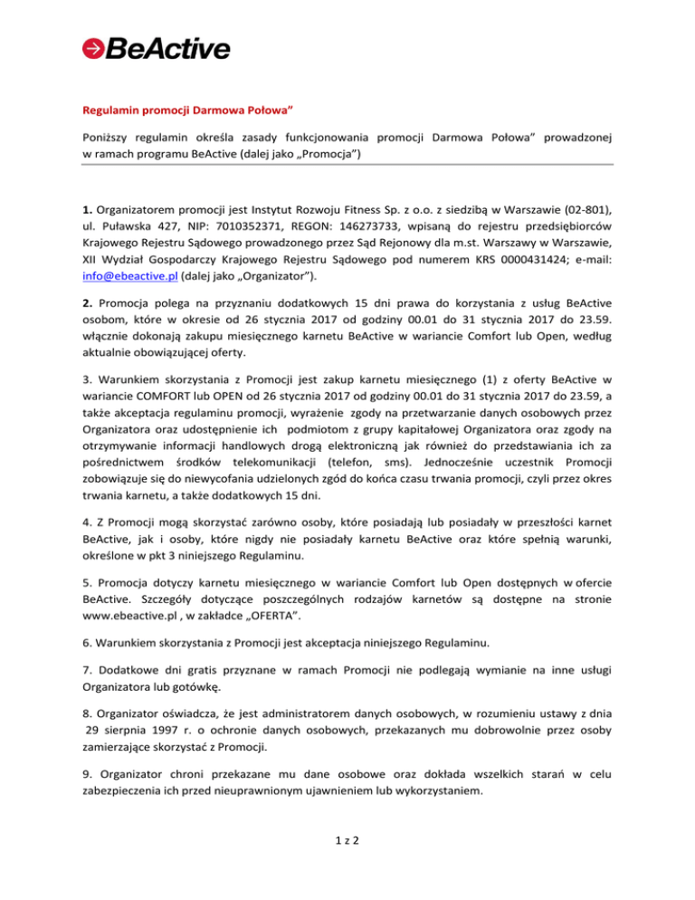 Regulamin promocji Darmowa Połowa” Poniższy regulamin określa zasady funkcjonowania promocji Darmowa Połowa” prowadzonej w ramach programu BeActive (dalej jako „Promocja”) 1. Organizatorem promocji jest Instytut Rozwoju Fitness Sp. z o.o. z siedzibą w Warszawie (02-801), ul. Puławska 427, NIP: 7010352371, REGON: 146273733, wpisaną do rejestru przedsiębiorców Krajowego Rejestru Sądowego prowadzonego przez Sąd Rejonowy dla m.st. Warszawy w Warszawie, XII Wydział Gospodarczy Krajowego Rejestru Sądowego pod numerem KRS 0000431424; e-mail: [email protected] (dalej jako „Organizator”). 2. Promocja polega na przyznaniu dodatkowych 15 dni prawa do korzystania z usług BeActive osobom, które w okresie od 26 stycznia 2017 od godziny 00.01 do 31 stycznia 2017 do 23.59. włącznie dokonają zakupu miesięcznego karnetu BeActive w wariancie Comfort lub Open, według aktualnie obowiązującej oferty. 3. Warunkiem skorzystania z Promocji jest zakup karnetu miesięcznego (1) z oferty BeActive w wariancie COMFORT lub OPEN od 26 stycznia 2017 od godziny 00.01 do 31 stycznia 2017 do 23.59, a także akceptacja regulaminu promocji, wyrażenie zgody na przetwarzanie danych osobowych przez Organizatora oraz udostępnienie ich podmiotom z grupy kapitałowej Organizatora oraz zgody na otrzymywanie informacji handlowych drogą elektroniczną jak również do przedstawiania ich za pośrednictwem środków telekomunikacji (telefon, sms). Jednocześnie uczestnik Promocji zobowiązuje się do niewycofania udzielonych zgód do końca czasu trwania promocji, czyli przez okres trwania karnetu, a także dodatkowych 15 dni. 4. Z Promocji mogą skorzystać zarówno osoby, które posiadają lub posiadały w przeszłości karnet BeActive, jak i osoby, które nigdy nie posiadały karnetu BeActive oraz które spełnią warunki, określone w pkt 3 niniejszego Regulaminu. 5. Promocja dotyczy karnetu miesięcznego w wariancie Comfort lub Open dostępnych w ofercie BeActive. Szczegóły dotyczące poszczególnych rodzajów karnetów są dostępne na stronie www.ebeactive.pl , w zakładce „OFERTA”. 6. Warunkiem skorzystania z Promocji jest akceptacja niniejszego Regulaminu. 7. Dodatkowe dni gratis przyznane w ramach Promocji nie podlegają wymianie na inne usługi Organizatora lub gotówkę. 8. Organizator oświadcza, że jest administratorem danych osobowych, w rozumieniu ustawy z dnia 29 sierpnia 1997 r. o ochronie danych osobowych, przekazanych mu dobrowolnie przez osoby zamierzające skorzystać z Promocji. 9. Organizator chroni przekazane mu dane osobowe oraz dokłada wszelkich starań w celu zabezpieczenia ich przed nieuprawnionym ujawnieniem lub wykorzystaniem. 1z2 10. Osoba zamierzająca skorzystać z Promocji wyraża zgodę na przetwarzanie danych osobowych przez Organizatora promocji w celu umożliwienia korzystania z usług objętych promocją, zgodnie z ustawą z dnia 29 sierpnia 1997 r. o ochronie danych osobowych. 11. Osoba zamierzająca skorzystać z Promocji oświadcza, że znajduje się w stanie zdrowia pozwalającym jej na korzystanie z usług świadczonych przez wybrany Klub Fitness oraz że jest świadoma zagrożenia dla zdrowia wywołanego nadmiernymi obciążeniami w trakcie wykonywania ćwiczeń oraz zobowiązuje się do korzystania z usług wybranego Klubu Fitness zgodnie z regulaminem jego funkcjonowania. 12. Pełna lista Klubów Fitness, o której mowa w punkcie 11, znajduje się na stronie internetowej www.ebeactive.pl w zakładce „NASZE KLUBY”. 13. Wszelkie pytania związane z niniejszą Promocją można kierować na adres [email protected] 14. Niniejsza Promocja nie podlega łączeniu z innymi promocjami i zniżkami oferowanymi przez BeActive. 15. Niniejszy Regulamin obowiązuje od 26 stycznia 2017 od godziny 00.01 do 31 stycznia 2017 do 23.59. 2z2