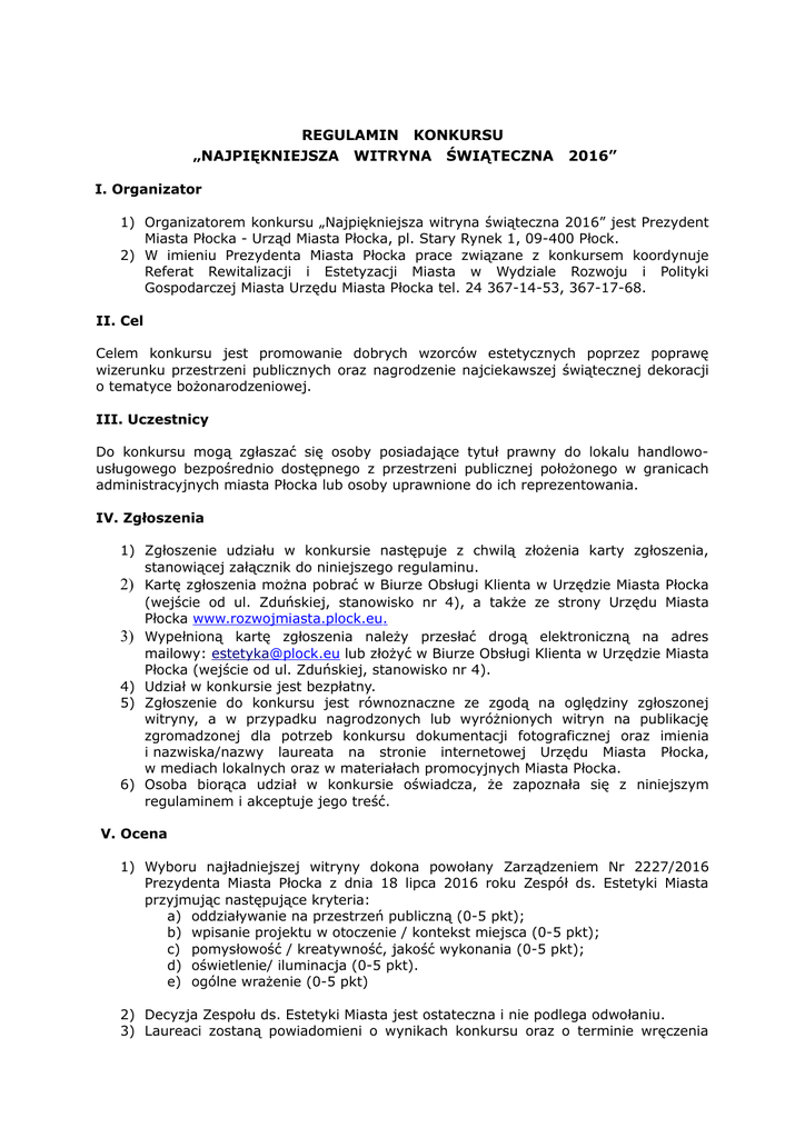REGULAMIN KONKURSU „NAJPIĘKNIEJSZA WITRYNA ŚWIĄTECZNA 2016” I. Organizator 1) Organizatorem konkursu „Najpiękniejsza witryna świąteczna 2016” jest Prezydent Miasta Płocka - Urząd Miasta Płocka, pl. Stary Rynek 1, 09-400 Płock. 2) W imieniu Prezydenta Miasta Płocka prace związane z konkursem koordynuje Referat Rewitalizacji i Estetyzacji Miasta w Wydziale Rozwoju i Polityki Gospodarczej Miasta Urzędu Miasta Płocka tel. 24 367-14-53, 367-17-68. II. Cel Celem konkursu jest promowanie dobrych wzorców estetycznych poprzez poprawę wizerunku przestrzeni publicznych oraz nagrodzenie najciekawszej świątecznej dekoracji o tematyce bożonarodzeniowej. III. Uczestnicy Do konkursu mogą zgłaszać się osoby posiadające tytuł prawny do lokalu handlowousługowego bezpośrednio dostępnego z przestrzeni publicznej położonego w granicach administracyjnych miasta Płocka lub osoby uprawnione do ich reprezentowania. IV. Zgłoszenia 1) Zgłoszenie udziału w konkursie następuje z chwilą złożenia karty zgłoszenia, stanowiącej załącznik do niniejszego regulaminu. 2) Kartę zgłoszenia można pobrać w Biurze Obsługi Klienta w Urzędzie Miasta Płocka (wejście od ul. Zduńskiej, stanowisko nr 4), a także ze strony Urzędu Miasta Płocka www.rozwojmiasta.plock.eu. 3) Wypełnioną kartę zgłoszenia należy przesłać drogą elektroniczną na adres mailowy: [email protected] lub złożyć w Biurze Obsługi Klienta w Urzędzie Miasta Płocka (wejście od ul. Zduńskiej, stanowisko nr 4). 4) Udział w konkursie jest bezpłatny. 5) Zgłoszenie do konkursu jest równoznaczne ze zgodą na oględziny zgłoszonej witryny, a w przypadku nagrodzonych lub wyróżnionych witryn na publikację zgromadzonej dla potrzeb konkursu dokumentacji fotograficznej oraz imienia i nazwiska/nazwy laureata na stronie internetowej Urzędu Miasta Płocka, w mediach lokalnych oraz w materiałach promocyjnych Miasta Płocka. 6) Osoba biorąca udział w konkursie oświadcza, że zapoznała się z niniejszym regulaminem i akceptuje jego treść. V. Ocena 1) Wyboru najładniejszej witryny dokona powołany Zarządzeniem Nr 2227/2016 Prezydenta Miasta Płocka z dnia 18 lipca 2016 roku Zespół ds. Estetyki Miasta przyjmując następujące kryteria: a) oddziaływanie na przestrzeń publiczną (0-5 pkt); b) wpisanie projektu w otoczenie / kontekst miejsca (0-5 pkt); c) pomysłowość / kreatywność, jakość wykonania (0-5 pkt); d) oświetlenie/ iluminacja (0-5 pkt). e) ogólne wrażenie (0-5 pkt) 2) Decyzja Zespołu ds. Estetyki Miasta jest ostateczna i nie podlega odwołaniu. 3) Laureaci zostaną powiadomieni o wynikach konkursu oraz o terminie wręczenia dyplomów przez Referat Rewitalizacji i Estetyzacji Miasta. 4) Organizator zastrzega sobie prawo do: a) wykluczenia z udziału w konkursie tych zgłoszeń, które nie spełniają warunków niniejszego regulaminu; b) odstąpienia od przeprowadzenia konkursu jeżeli wpłyną mniej niż 3 karty zgłoszenia. VI. Terminy Terminarz Konkursu: • przyjmowanie zgłoszeń: 1 - 9 grudnia 2016 r. • dokonanie przez Zespół ds. Estetyki Miasta przeglądu witryn zgłoszonych do konkursu: 12-14 grudnia 2016 r. • ogłoszenie wyników konkursu i wręczenie dyplomów: podczas „Wigilii przed Ratuszem” 21 grudnia 2016 r. VII. Nagrody 1) Zwycięska witryna otrzyma tytuł "Najpiękniejsza witryna świąteczna 2016" 2) W konkursie przewiduje się możliwość przyznania wyróżnień.