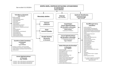 Stan na dzień: 01. 09.2014 r. ZESPÓŁ SZKÓŁ, CENTRUM KSZTAŁCENIA USTAWICZNEGO W GRONOWIE REGON: 000095822 Technikum w Gronowie Regon: 871633512 kształci w zawodach: - technik informatyk - technik technologii żywności - technik agrobiznesu - technik rolnik - technik ekonomista - technik spedytor - technik mechanizacji rolnictwa - technik ochrony środowiska - technik żywienia i usług gastronomicznych - kelner - technik hotelarstwa - technik logistyk - technik pojazdów samochodowych - technik hotelarstwa - technik hodowca koni - technik turystyki wiejskiej - technik organizacji reklamy Zasadnicza Szkoła Zawodowa w Gronowie (3-letnia) Regon: 871633506 kształcąca w zawodach: mechanik pojazdów samochodowych, mechanik - operator pojazdów i maszyn rolniczych, sprzedawca, kucharz oraz klasa wielozawodowa. Liceum Ogólnokształcące w Gronowie Regon: 871633529 - innowacja – klasa o ukierunkowaniu psychoedukacyjnym - innowacja – klasa o ukierunkowaniu paramilitarnym - innowacja – klasa o ukierunkowaniu kosmetycznym Warsztaty szkolne Szkolenie praktyczne Stacja Kontroli Pojazdów Ośrodek Szkolenia Kierowców w Gronowie Internat Regon: 341337304 Centrum Kształcenia Ustawicznego Uzupełniające Liceum Ogólnokształcące dla Dorosłych w Gronowie na podbudowie ZSZ (2-letnie) REGON: 871633541 Funkcjonuje do 31.08.2015 r. Liceum Ogólnokształcące dla Dorosłych w Gronowie na podbudowie gimnazjum lub szkoły podstawowej (3-letnie) Regon: 871633535 Szkoła Policealna dla Dorosłych w Gronowie Regon: 340066317 - technik informatyk - technik pojazdów samochodowych - technik BHP (1,5 roku) - technik administracji - technik rachunkowości - opiekunka środowiskowa (1 rok) - opiekun medyczny (1 rok) - technik ochrony fizycznej osób i mienia - opiekun w domu pomocy społecznej - technik turystyki wiejskiej (dający uprawnienia rolnicze) - technik ekonomista - asystent osoby niepełnosprawnej Regon: 871715523 Kwalifikacyjne kursy zawodowe: - technik rolnik/rolnik - technik pojazdów samochodowych/ mechanik pojazdów samochodowych/ elektromechanik pojazdów samochodowych - technik żywienia i usług gastronomicznych/ kucharz - technik usług kosmetycznych - technik logistyk - opiekun medyczny - asystent osoby niepełnosprawnej - technik informatyk - technik mechanizacji rolnictwa - technik hodowca koni - technik technologii żywności - technik agrobiznesu - technik ekonomista - technik spedytor - technik administracji - technik hotelarstwa - technik rachunkowości - technik ochrony fizycznej osób i mienia - kucharz - kelner - sprzedawca - mechanik operator maszyn i urządzeń rolniczych - technik organizacji reklamy i inne zawody uwzględnione w klasyfikacji zawodów, w których możliwe jest organizowanie kkz