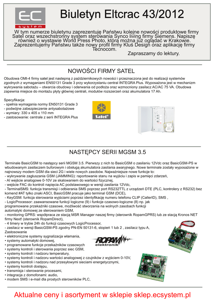 Biuletyn Eltcrac 43/2012 W tym numerze biuletynu zaprezentuję Państwu kolejne nowości produktowe firmy Satel oraz wszechstronny system sterowania Synco living firmy Siemens. Napiszę również o wystawie World Press Photo, którą można już oglądać w Krakowie. Zaprezentujemy Państwu także nowy profil firmy Kluś Design oraz aplikację firmy Tecnocom. Zapraszamy do lektury. NOWOŚCI FIRMY SATEL Obudowa OMI4 firmy satel jest nastepną z październikowych nowości i przeznaczona jest do realizacji systemów zgodnych z wymaganiami EN50131 Grade 3 przy wykorzystaniu central INTEGRA Plus. Wyposażona jest w mechanizm wykrywania sabotażu – otwarcia obudowy i oderwania od podłoża oraz wzmocniony zasilacz AC/AC 75 VA. Obudowa zapewnia miejsce do montażu płyty głównej centrali, modułów rozszerzeń oraz akumulatora 17 Ah. Specyfikacja: spełnia wymagania normy EN50131 Grade 3 podwójne zabezpieczenie antysabotażowe wymiary: 330 x 405 x 110 mm zastosowanie: centrale z serii INTEGRA Plus NASTĘPCY SERII MGSM 3.5 Terminale BasicGSM to następcy serii MGSM 3.5. Pierwszy z nich to BasicGSM o zasilaniu 12Vdc oraz BasicGSMPS w wbudowanym zasilaczem buforowym i obsługą akumulatora zasilania awaryjnego. Nowe terminale zostały wyposażone w najnowszy modem GSM dla sieci 2G i wiele nowych zasobów. Najważniejsze nowe funkcje to: wykrywanie zagłuszania GSM (JAMMING): raportowanie stanu na wyjściu i zapis w pamięci zdarzeń, AI wejście analogowe 010V ze skalowaniem do wartości fizycznej, wejście FAC do kontroli napięcia AC podstawowego w wersji zasilania 12Vdc, TerminalSMS: funkcja transmisji i odbierania SMS poprzez port RS232TTL z urządzeń DTE (PLC, kontrolery z RS232) bez komend #AT tylko znaki ASCI, BasicGSM pracuje jako terminal GSM (DCE), KeyGSM: funkcja sterowania wyjściami poprzez identyfikację numeru telefonu CLIP (CallerID), SMS , LogicProcessor: zaawansowane funkcji logiczne (9) i funkcje czasowologiczne (8) np. jak programowane przekaźniki czasowe, możliwość stworzenia na wolnych zasobach funkcji automatyki domowej ze sterowaniem GSM, monitoring GPRS: współpraca ze stacją MSR Manager naszej firmy (sterownik RopamGPRS) lub ze stacją Kronos NET firmy Next! (sterownik RopamDirect), 4 timery w trybie 24h do funkcji czasowych LogicProcessor, zasilacz w wersji BasicGSMPS zgodny PNEN 501316, stopień 1 lub 2 , zasilacz typu A, Zastosowanie • elektroniczne systemy sygnalizacja włamania, • systemy automatyki domowej, • programowane funkcje przekaźników czasowych • systemy kontroli i sterowania poprzez siec GSM, • systemy kontroli i nadzoru temperatury, • systemy kontroli i nadzoru wartości analogowej z czujników z wyjściem 010V, • systemy kontroli i nadzoru nad przesyłowymi sieciami energetycznymi, • systemy kontroli dostępu, • transmisja i sterowanie procesami, • integracja z domofonami: audio, • modem SMS i email dla prostych sterowników PLC, Aktualne ceny i asortyment w sklepie sklep.ecsystem.pl World Press Photo już w Krakowie. Wystawa World Press Photo tradycyjnie będzie pokazywana w Krakowie w Bunkrze Sztuki . Co roku niezależne międzynarodowe jury w ramach dziewięciu różnych kategorii oceniało będzie prace nadesłane przez fotografów prasowych, agencje, gazety i magazyny ze wszystkich zakątków świata. W tegorocznym konkursie wzięło udział 5247 fotografów ze 124 krajów. Autorem zdjęcia, które otrzymało główną nagrodę podczas 55. edycji konkursu World Press Photo jest Samuel Aranda z Hiszpanii. Fotografia przedstawia kobietę trzymającą w ramionach zranionego syna. Scena rozgrywa się wewnątrz meczetu pełniącego funkcję szpitala polowego w czasie zamieszek w Sanaa w Jemenie, 15 października 2011 r. Samuel Aranda pracował w Jemenie jako wysłannik New York Times’a. World Press Photo to najważniejszy konkurs branżowy fotografów z całego świata pracujących dla prasy. Fundacja World Press Photo działa od 1955 r. Odbywa się corocznie, wyniki ogłaszane są w lutym. Przebiega w kilkunastu kategoriach obejmujących fotografie pojedyncze i serie (reportaże), takich jak zdjęcie roku, zdarzenia, ludzie w zdarzeniach, sportowe sytuacje, ludzie sportu, życie codzienne, portrety, sztuka, przyroda. Przyznawane jest też wyróżnienie jury młodzieżowego. World Press Photo to także niezależna organizacja niedochodowa założona w 1955 r. w Holandii. Jej głównym celem jest promowanie i wspieranie pracy zawodowych fotografów prasowych. Poza działalnością wystawienniczą i wydawniczą, organizacja prowadzi również przedsięwzięcia edukacyjne. www.odkrywcy.pl www.gazeta.pl www.wykop.pl Firma Tecnocom stworzyła nową aplikację na Apple iOS i Android. Charakterystyka: Bezpieczeństwo dwupoziomowe zabezpieczenie: hasło i kod dostępu Grupy każda grupa posiada własną ikonę sygnalizującą jej stan. Włączanie i wyłączanie oraz blokowanie systemu alarmowego staje się banalnie proste Zdalne komendy możliwość zarządzania automatyką domową zdalnego włączania i wyłączania urządzeń w Twoim domu Pamięć zdarzeń możliwość w dowolnym momencie przeglądania zdarzeń zapisanych w systemie Ustawienia proste i intuicyjne zarządzanie aplikacją Firma Kluś Design wzbogaciła swoja oferte o nowy profil aluminiowy anodowany STEP alu bez osłonki. Profil STEP umożliwia skierowanie światła w przeciwnym kie runku do wzroku użytkownika. Dzięki temu uzyskujemy efekt delikatnego podświetlenia nie rażąc oczu Przeznaczenie: dla oświetlenia typu LED, na paskach miękkich lub twar dych do oświetleń i podświetleń (w zależności od mocy zasto sowanych LED) na krawędzi stopnia schodowego ; Długości standardowe : 1m ; 2m (sprzedajemy profile w odcinkach 1 lub 2 metrowych) Mocowanie : kleje montażowe ; taśma dwustronnie klejąca (akcesoria) Biuletyn Eltcrac wydawany jest przez: Eltcrac System sp z o.o. ul. Ruciana 3; 30803 Kraków tel. 12 292 48 61, fax 12 292 48 62, mob 506 009