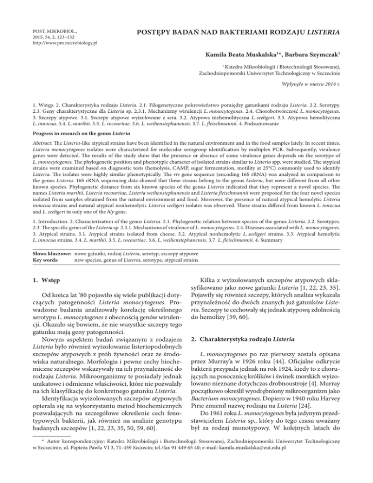 POST. MIKROBIOL., 2015, 54, 2, 123–132 http://www.pm.microbiology.pl POSTĘPY BADAŃ NAD BAKTERIAMI RODZAJU LISTERIA Kamila Beata Muskalska1*, Barbara Szymczak1 1 Katedra Mikrobiologii i Biotechnologii Stosowanej, Zachodniopomorski Uniwersytet Technologiczny w Szczecinie Wpłynęło w marcu 2014 r. 1. Wstęp. 2. Charakterystyka rodzaju Listeria. 2.1. Filogenetyczne pokrewieństwo pomiędzy gatunkami rodzaju Listeria. 2.2. Serotypy. 2.3. Geny charakterystyczne dla Listeria sp. 2.3.1. Mechanizmy wirulencji L. monocytogenes. 2.4. Chorobotwórczość L. monocytogenes. 3. Szczepy atypowe. 3.1. Szczepy atypowe wyizolowane z sera. 3.2. Atypowa niehemolityczna L. seeligeri. 3.3. Atypowa hemolityczna L. innocua. 3.4. L. marthii. 3.5. L. rocourtiae. 3.6. L. weihenstephanensis. 3.7. L. fleischmannii. 4. Podsumowanie Progress in research on the genus Listeria Abstract: The Listeria-like atypical strains have been identified in the natural environment and in the food samples lately. In recent times, Listeria monocytogenes isolates were characterized for molecular serogroup identification by multiplex PCR. Subsequently, virulence genes were detected. The results of the study show that the presence or absence of some virulence genes depends on the serotype of L. monocytogenes. The phylogenetic position and phenotypic character of isolated strains similar to Listeria spp. were studied. The atypical strains were examined based on diagnostic tests (hemolysis, CAMP, sugar fermentation, motility at 25°C) commonly used to identify Listeria. The isolates were highly similar phenotypically. The rrs gene sequence (encoding 16S rRNA) was analyzed in comparison to the genus Listeria. 16S rRNA sequencing data showed that these strains belong to the genus Listeria, but were different from all other known species. Phylogenetic distance from six known species of the genus Listeria indicated that they represent a novel species. The names Listeria marthii, Listeria rocourtiae, Listeria weihenstephanensis and Listeria fleischmannii were proposed for the four novel species isolated from samples obtained from the natural environment and food. Moreover, the presence of natural atypical hemolytic Listeria innocua strains and natural atypical nonhemolytic Listeria seeligeri isolates was observed. These strains differed from known L. innocua and L. seeligeri in only one of the hly gene. 1. Introduction. 2. Characterization of the genus Listeria. 2.1. Phylogenetic relation between species of the genus Listeria. 2.2. Serotypes. 2.3. The specific genes of the Listeria sp. 2.3.1. Mechanisms of virulence of L. monocytogenes. 2.4. Diseases associated with L. monocytogenes. 3. Atypical strains. 3.1. Atypical strains isolated from cheese. 3.2. Atypical nonhemolytic L. seeligeri strains. 3.3. Atypical hemolytic L. innocua strains. 3.4. L. marthii. 3.5. L. rocourtiae. 3.6. L. weihenstephanensis. 3.7. L. fleischmannii. 4. Summary Słowa kluczowe: nowe gatunki, rodzaj Listeria, serotyp, szczepy atypowe Key words: new species, genus of Listeria, serotype, atypical strains 1. Wstęp Od końca lat ’80 pojawiło się wiele publikacji dotyczących patogenności Listeria monocytogenes. Prowadzone badania analizowały korelację określonego serotypu L. monocytogenes z obecnością genów wirulencji. Okazało się bowiem, że nie wszystkie szczepy tego gatunku mają geny patogenności. Nowym aspektem badań związanym z rodzajem Listeria było również wyizolowanie listeriopodobnych szczepów atypowych z prób żywności oraz ze środowiska naturalnego. Morfologia i pewne cechy biochemiczne szczepów wskazywały na ich przynależność do rodzaju Listeria. Mikroorganizmy te posiadały jednak unikatowe i odmienne właściwości, które nie pozwalały na ich klasyfikację do konkretnego gatunku Listeria. Identyfikacja wyizolowanych szczepów atypowych opierała się na wykorzystaniu metod biochemicznych pozwalających na szczegółowe określenie cech fenotypowych bakterii, jak również na analizie genotypu badanych szczepów [1, 22, 23, 35, 50, 59, 60]. Kilka z wyizolowanych szczepów atypowych sklasyfikowano jako nowe gatunki Listeria [1, 22, 23, 35]. Pojawiły się również szczepy, których analiza wykazała przynależność do dwóch znanych już gatunków Liste ria. Szczepy te cechowały się jednak atypową zdolnością do hemolizy [59, 60]. 2. Charakterystyka rodzaju Listeria L. monocytogenes po raz pierwszy została opisana przez Murray’a w 1926 roku [44]. Oficjalne odkrycie bakterii przypada jednak na rok 1924, kiedy to z chorujących na posocznicę królików i świnek morskich wyizolowano nieznane dotychczas drobnoustroje [4]. Murray początkowo określił wyodrębniony mikroorganizm jako Bacterium monocytogenes. Dopiero w 1940 roku Harvey Pirie zmienił nazwę rodzaju na Listeria [24]. Do 1961 roku L. monocytogenes była jedynym przedstawicielem Listeria sp., który do tego czasu uważany był za rodzaj monotypowy. W kolejnych latach do * Autor korespondencyjny: Katedra Mikrobiologii i Biotechnologii Stosowanej, Zachodniopomorski Uniwersytet Technologiczny w Szczecinie, ul. Papieża Pawła VI 3, 71-459 Szczecin; tel./fax 91 449 65 40; e-mail: [email protected] 124 KAMILA BEATA MUSKALSKA, BARBARA SZYMCZAK Listeria sp. dołączały Listeria denitryficans (1961), Listeria grayi (1966), Listeria murrayi (1971). Liste ria innocua, Listeria welshimeri oraz Listeria seeligeri zostały dodane do rodzaju w 1983 roku [16]. Listeria ivanovii została włączona jako ostatnia w 1985 roku. Rozdzielono ją następnie na dwa podgatunki L. iva novii subsp. ivanovii i L. ivanovii subsp. londoniensis [22]. Jednak dalsze badania zarówno genotypowe jak i fenotypowe dokonały kolejnych weryfikacji. W konsekwencji L. murrayi włączono do gatunku L. grayi, a L. denitryficans została zaklasyfikowana do nowego rodzaju Jonesia, w wyniku czego przyjęła nazwę Jonesia denitryficans [39]. W wyniku powyższych zmian, aż do niedawna wśród rodzaju