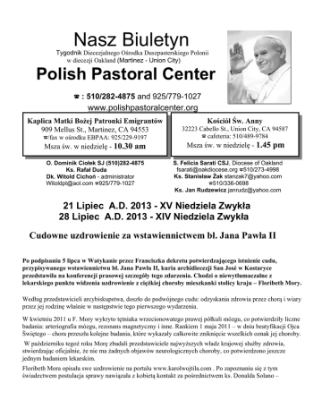 Nasz Biuletyn Tygodnik Diecezjalnego Ośrodka Duszpasterskiego Polonii w diecezji Oakland (Martinez - Union City) Polish Pastoral Center ? : 510/282-4875 and 925/779-1027 www.polishpastoralcenter.org Kaplica Matki Bożej Patronki Emigrantów 909 Mellus St., Martinez, CA 94553 ?/fax w ośrodku EBPAA: 925/229-9197 Msza św. w niedzielę - 10.30 am O. Dominik Ciołek SJ (510)282-4875 Ks. Rafał Duda Dk. Witold Cichoń - administrator [email protected] ?925/779-1027 Kościół Św. Anny 32223 Cabello St., Union City, CA 94587 ? cafeteria: 510/489-9784 Msza św. w niedzielę - 1.45 pm S. Felicia Sarati CSJ, Diocese of Oakland [email protected] ?510/273-4998 Ks. Stanisław Żak [email protected] ?510/336-0698 Ks. Jan Rudzewicz [email protected] 21 Lipiec A.D. 2013 - XV Niedziela Zwykła 28 Lipiec A.D. 2013 - XIV Niedziela Zwykła Cudowne uzdrowienie za wstawiennictwem bł. Jana Pawła II Po podpisaniu 5 lipca w Watykanie przez Franciszka dekretu potwierdzającego istnienie cudu, przypisywanego wstawiennictwu bł. Jana Pawła II, kuria archidiecezji San José w Kostaryce przedstawiła na konferencji prasowej szczegóły tego zdarzenia. Chodzi o niewytłumaczalne z lekarskiego punktu widzenia uzdrowienie z ciężkiej choroby mieszkanki stolicy kraju – Floribeth Mory. Według przedstawicieli arcybiskupstwa, doszło do podwójnego cudu: odzyskania zdrowia przez chorą i wiary przez jej rodzinę właśnie w następstwie tego pierwszego wydarzenia. W kwietniu 2011 u F. Mory wykryto tętniaka wrzecionowatego prawej półkuli mózgu, co potwierdziły liczne badania: arteriografia mózgu, rezonans magnetyczny i inne. Rankiem 1 maja 2011 – w dniu beatyfikacji Ojca Świętego – chora przeszła kolejne badania, które wykazały całkowite zniknięcie wszelkich oznak jej choroby. W październiku tegoż roku Morę zbadali przedstawiciele najwyższych władz krajowej służby zdrowia, stwierdzając oficjalnie, że nie ma żadnych objawów neurologicznych choroby, co potwierdzono jeszcze jednym badaniem lekarskim. Floribeth Mora opisała swe uzdrowienie na portalu www.karolwojtila.com . Po zapoznaniu się z tym świadectwem postulacja sprawy nawiązała z kobietą kontakt za pośrednictwem ks. Donalda Solano – proboszcza parafii Paraíso Cartago, w której znajduje się relikwia bł. Jana Pawła II. W październiku 2012 zaproszono p. Morę do Rzymu, gdzie ponownie została zbadana, a wyniki tych badań potwierdziły zniknięcie tętniaka. Pod koniec tegoż miesiąca do Kostaryki udał się postulator sprawy kanonizacyjnej ks. Sławomir Oder i poprosił arcybiskupa San José, aby przeprowadził na miejscu proces w sprawie domniemanego cudu. Rozpoczął się on 20 listopada 2012, a prowadził go zespół złożony z 3 księży, notariusza i lekarza. Prace zespołu trwały do 4 grudnia 2012, po czym ich wyniki przesłano do Kongregacji Spraw Kanonizacyjnych, która otrzymała je w styczniu br. Ostatecznie dokument zatwierdziły komisje: lekarska i teologiczna oraz kardynałowie i biskupi, członkowie Kongregacji. Dwie drogi do kanonizacji. Jako precedensowe określił ks. prałat Sławomir Oder decyzje papieża Franciszka dotyczące kanonizacji błogosławionych papieży Jana XXIII i Jana Pawła II. Postulator procesu kanonizacyjnego papieża Polaka stwierdził w rozmowie z Radiem Watykańskim, że decyzja dotycząca Jana XXIII jest czymś nadzwyczajnym w naszych czasach. 5 lipca br. papież Franciszek zgodził się na promulgowanie dekretu Kongregacji Spraw Kanonizacyjnych odnośnie do cudu przypisywanego wstawiennictwu bł. Jana Pawła II i przychylił się również do zdania członków tej dykasterii, aby dokonać kanonizacji Jana XXIII. Zdaniem ks. Odera "krok ten był zaskoczeniem, gdyż konieczny do kanonizacji cud za wstawiennictwem Jana XXIII jak dotychczas nie został potwierdzony". Jednak dla ks. Odera papieska decyzja mieści się całkowicie w ramach papieskich uprawnień. „Każdy papież jest najwyższym sędzią i prawodawcą w Kościele, jest przedstawicielem Chrystusa na ziemi. Taka decyzja mieści się zatem w jego kompetencjach. Na pewno nie była to łatwa decyzja. Jest to decyzja, która dotyczy ogłoszenia świętym, proklamacją świętej osoby, papieża, który przekonuje swym poważaniem i nieomylnością. Nas może zaskakiwać ten krok, jednak za nim stoi refleksja i modlitwa papieża, które doprowadziły go do tej decyzji. I ten sposób decyzji może nieść z sobą duchowe owoce i przyczynić się dla dobra dusz" - powiedział ks. Oder. Data konsystorza, na którym zostaną ogłoszone daty kanonizacji, nie jest znana. Rzecznik Watykanu ks. Federico Lombardi podkreślił, że decyzja Franciszka jest "deklaracją intencji" i jest sprawą otwartą jeszcze czy papież uzależni decyzję o świętości papieża Jana XXIII od uznania cudu za jego wstawiennictwem, czy też nie. Papież oddał hołd z okazji 50. rocznicy śmierci papieża Jana, która przypadła 3 czerwca br. "W tym ewangelicznym posłuszeństwie tkwi istota jego świętości" - powiedział papież podczas uroczystości upamiętniającej śmierć papieża Roncallego w bazylice św. Piotra. "Pięćdziesiąt lat po jego śmierci, mądre i ojcowskie kierownictwo papieża Jana i jego umiłowanie tradycji Kościoła oraz świadomość stałej potrzeby jego nieustannego dostosowania się do aktualnych potrzeb, prorocza intuicja zwołania Soboru Watykańskiego II i ofiarowanie swego życia za jego pomyślny wynik, pozostają kamieniami milowymi w historii Kościoła XX wieku i jako jaśniejące światło na oczekującej nas drodze” - powiedział Franciszek. Zdaniem ks. Odera ewentualną wspólną kanonizację bł. Jana XXIII i bł Jana Pawła II należałoby odczytać w kontekście II Soboru Watykańskiego. "Jest czymś oczywistym: Jan XXIII jest papieżem, który miał odwagę otwarcia Kościoła na wydarzenie Soboru, papieżem, który całym swoim pontyfikatem wskazywał drogę i przyjmował ducha Soboru oraz realizow